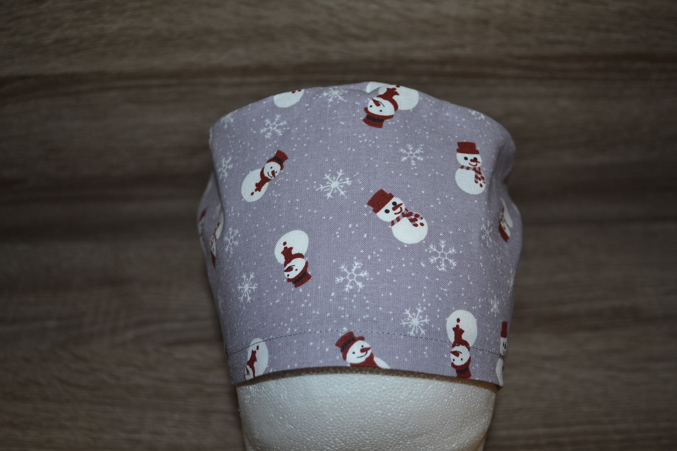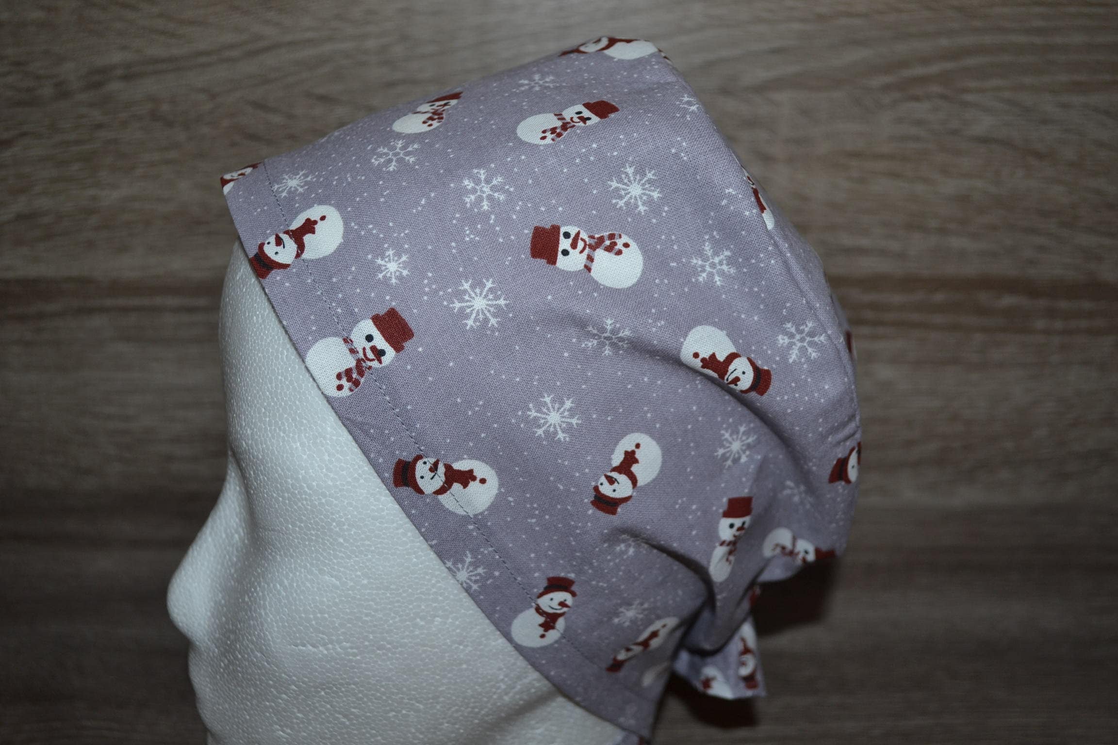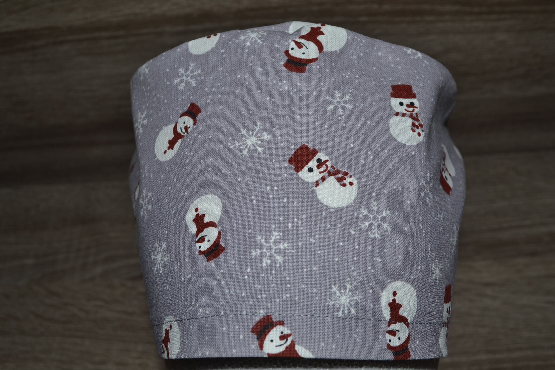 Surgical cap with terry cloth band, scrub cap, bandana, cosmetic cap, exfoliating cap, grey with small snowmen, snowman cap
