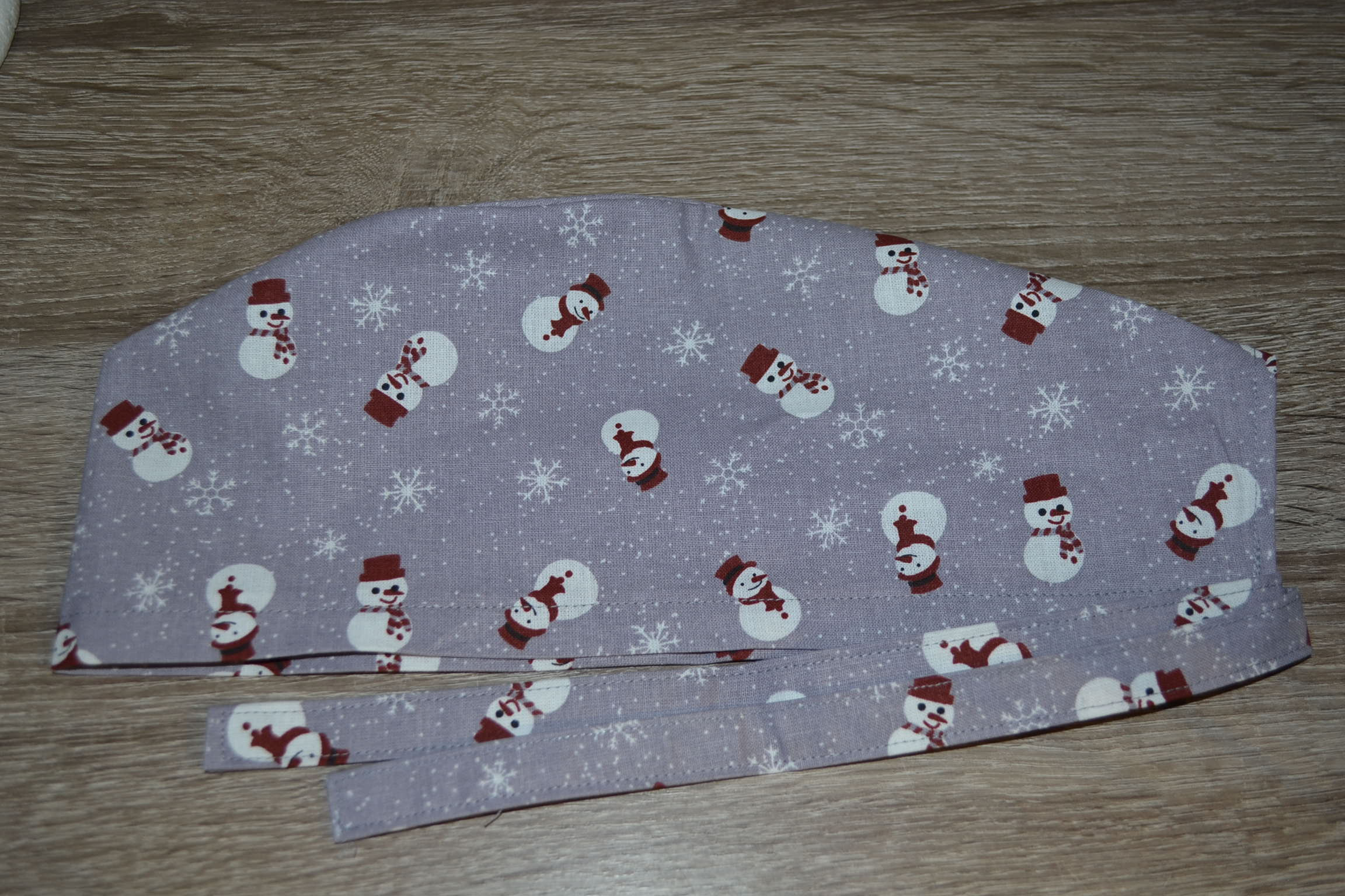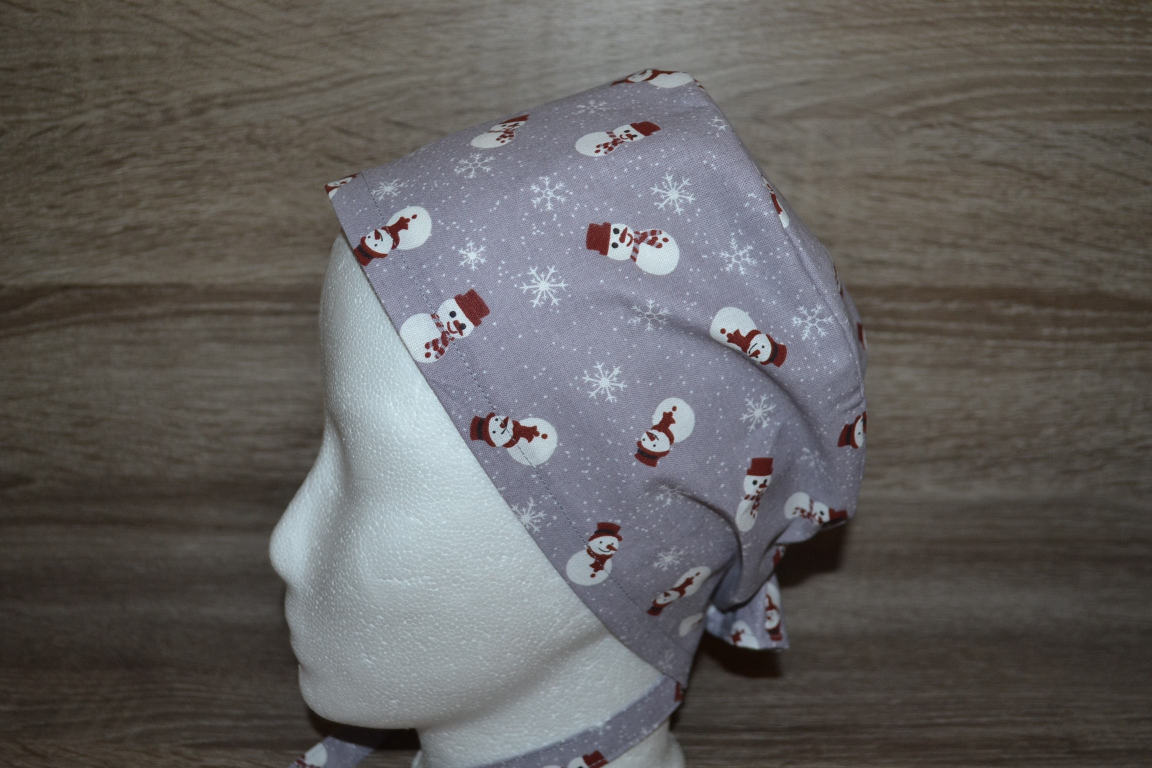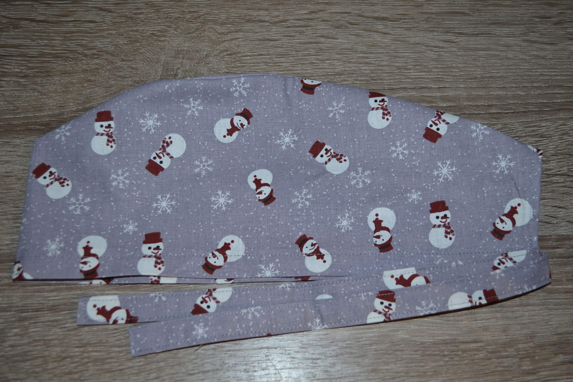 Surgical cap with terry cloth band, scrub cap, bandana, cosmetic cap, exfoliating cap, grey with small snowmen, snowman cap