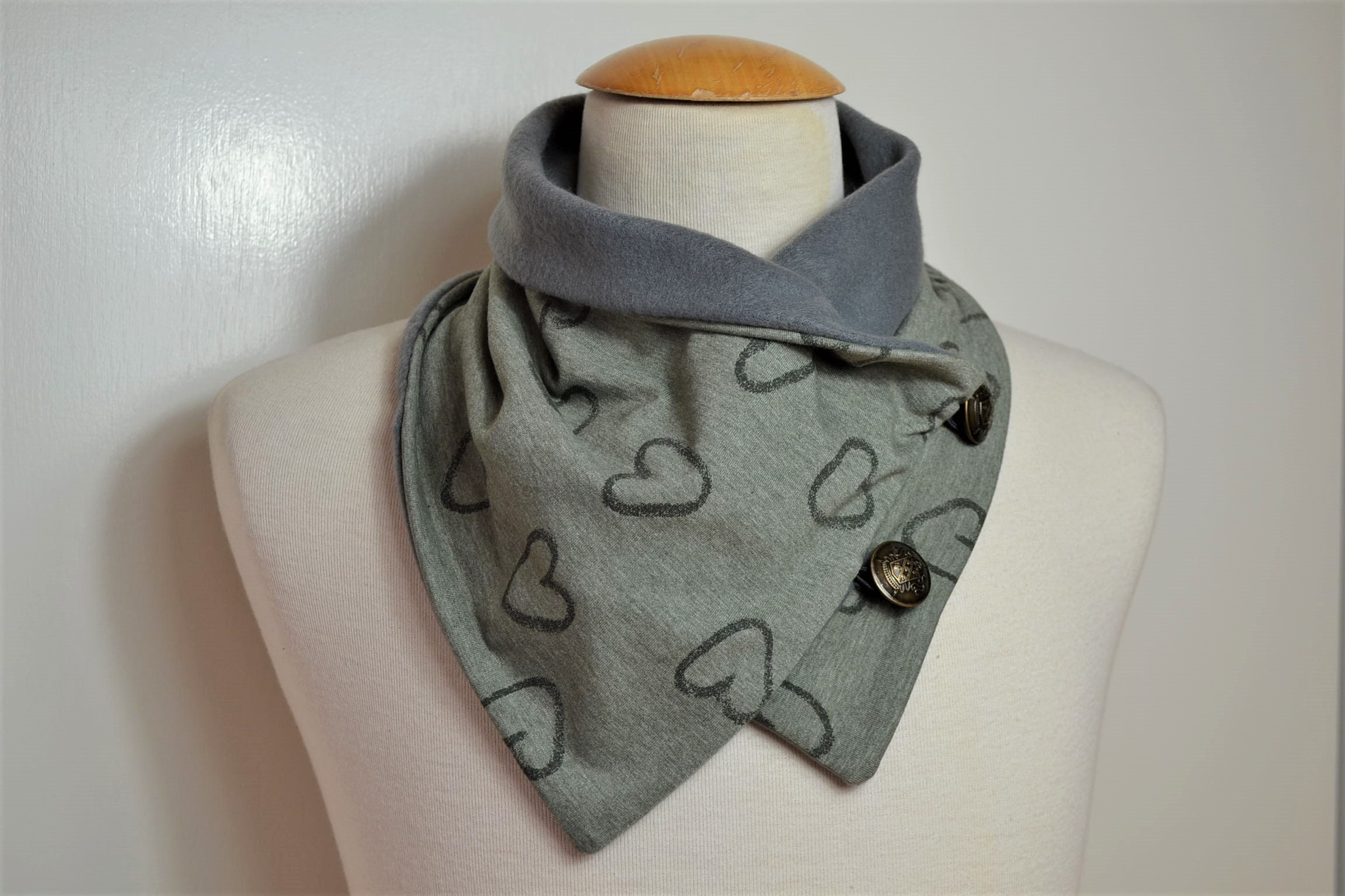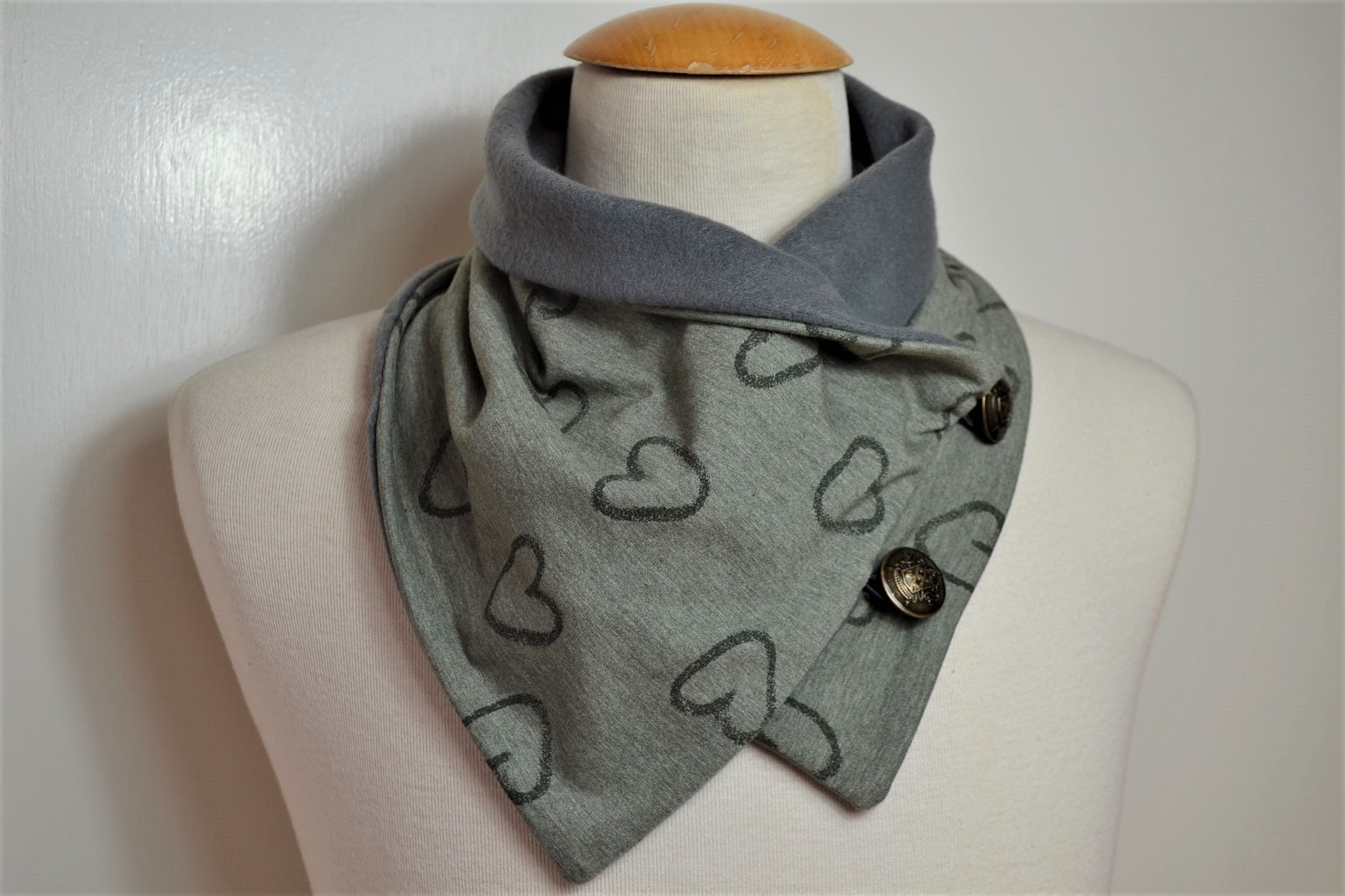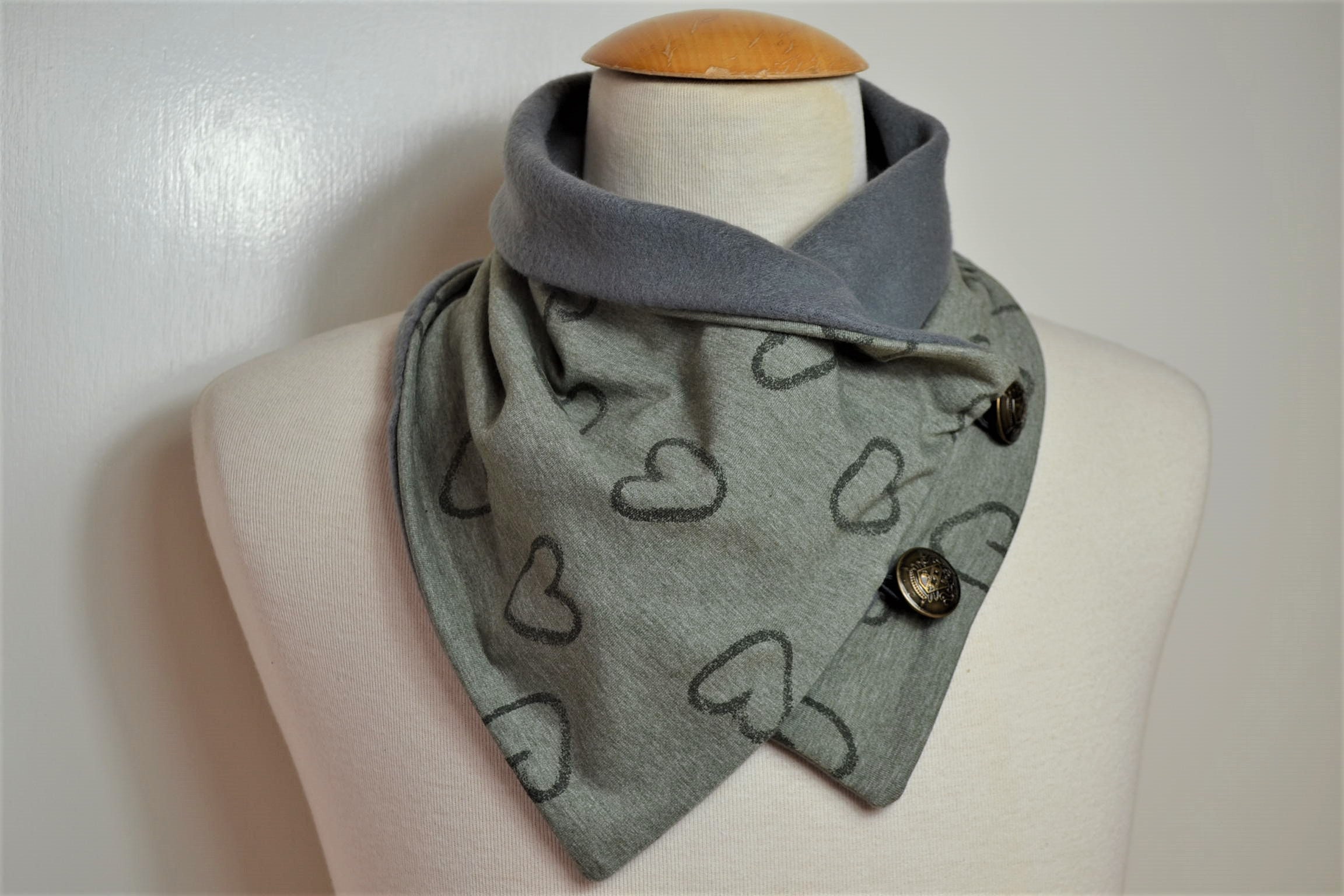 Olive green button loop scarf with heart design, button loops, loops, scarf with buttons, grey fleece cotton jersey, button loop scarf with heart design, heart loop, green wrap scarf