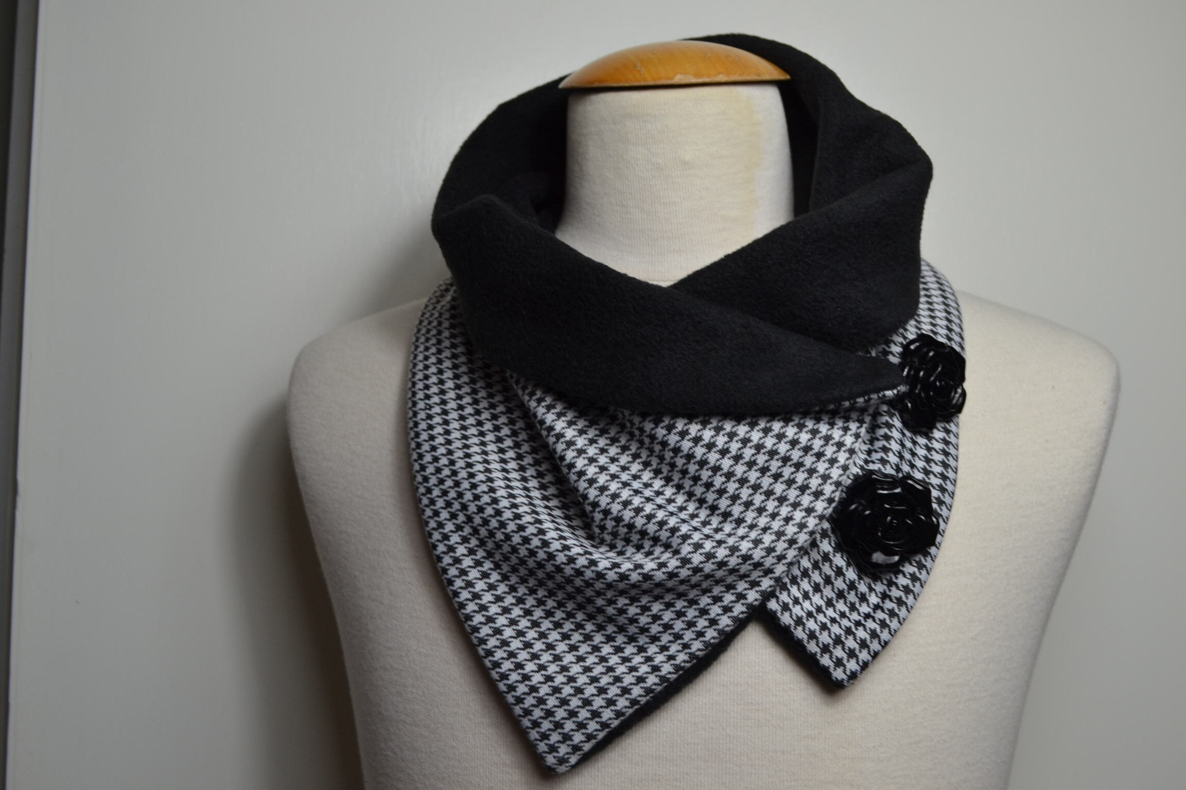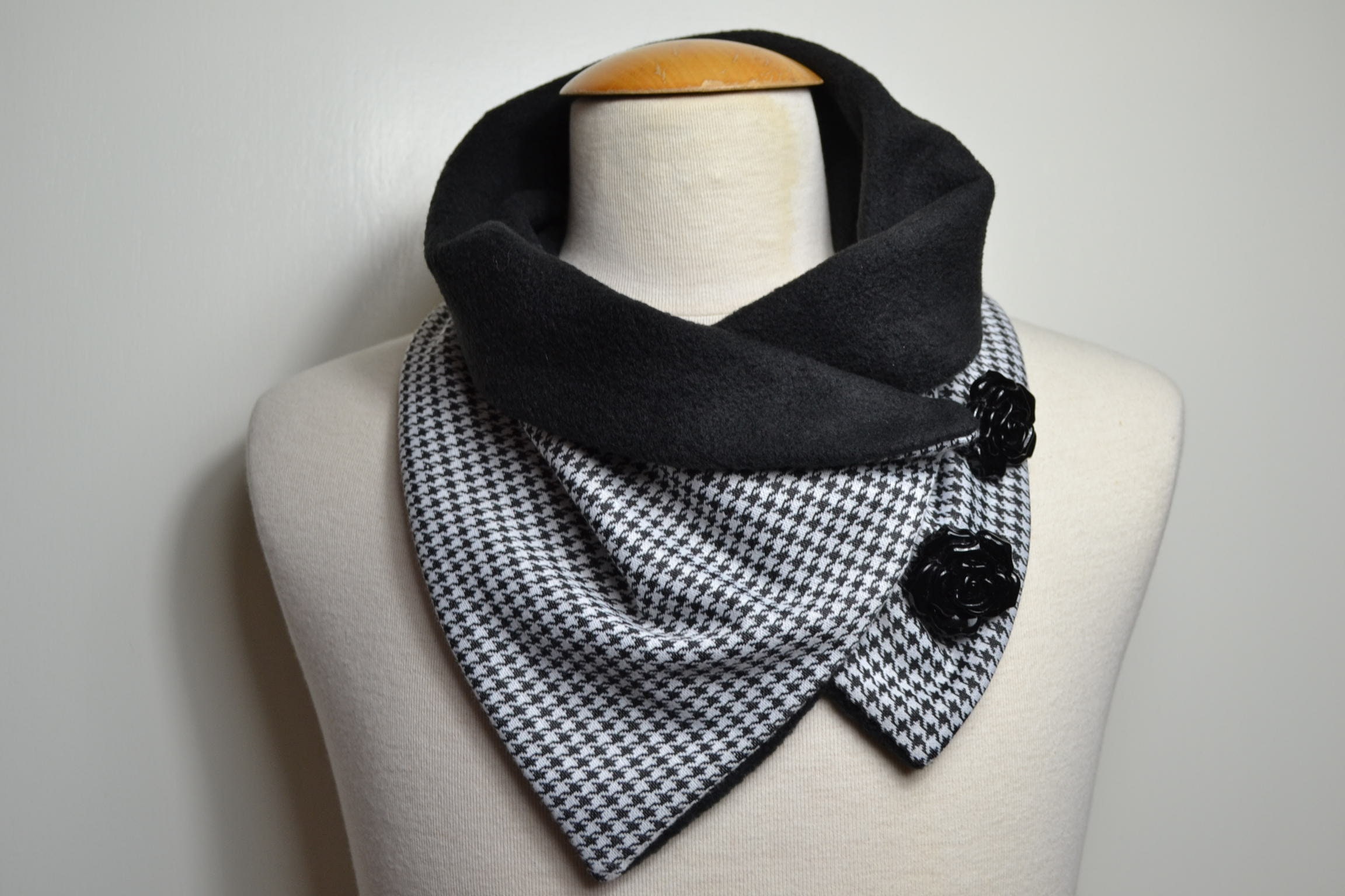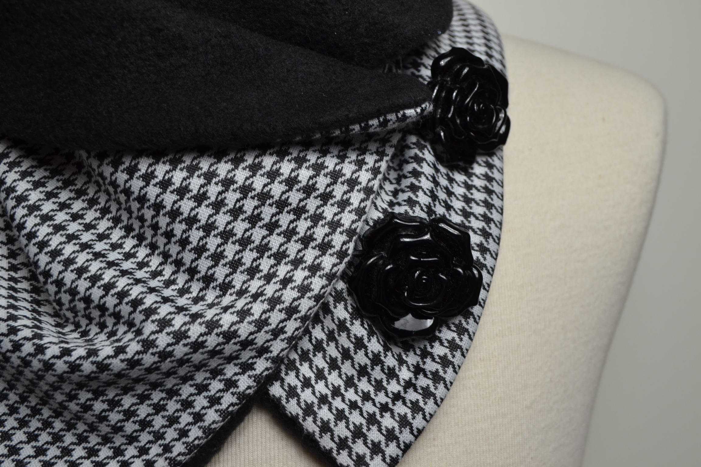 Black and white button-up loop scarf, loops, scarf, coat fabric houndstooth and black fleece, warm button-up loop scarf, winter scarf, wrap scarf