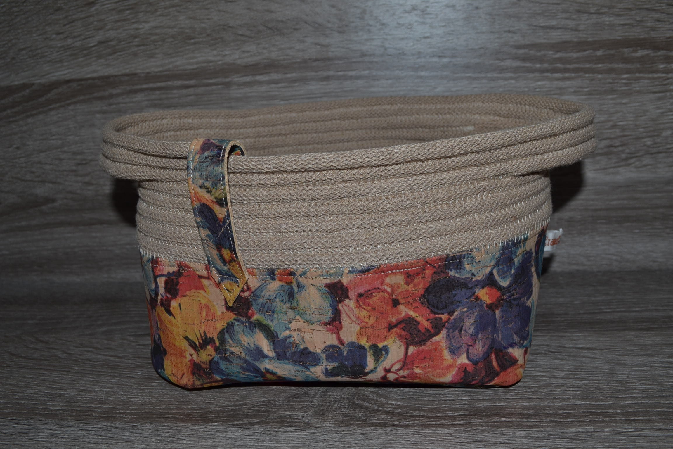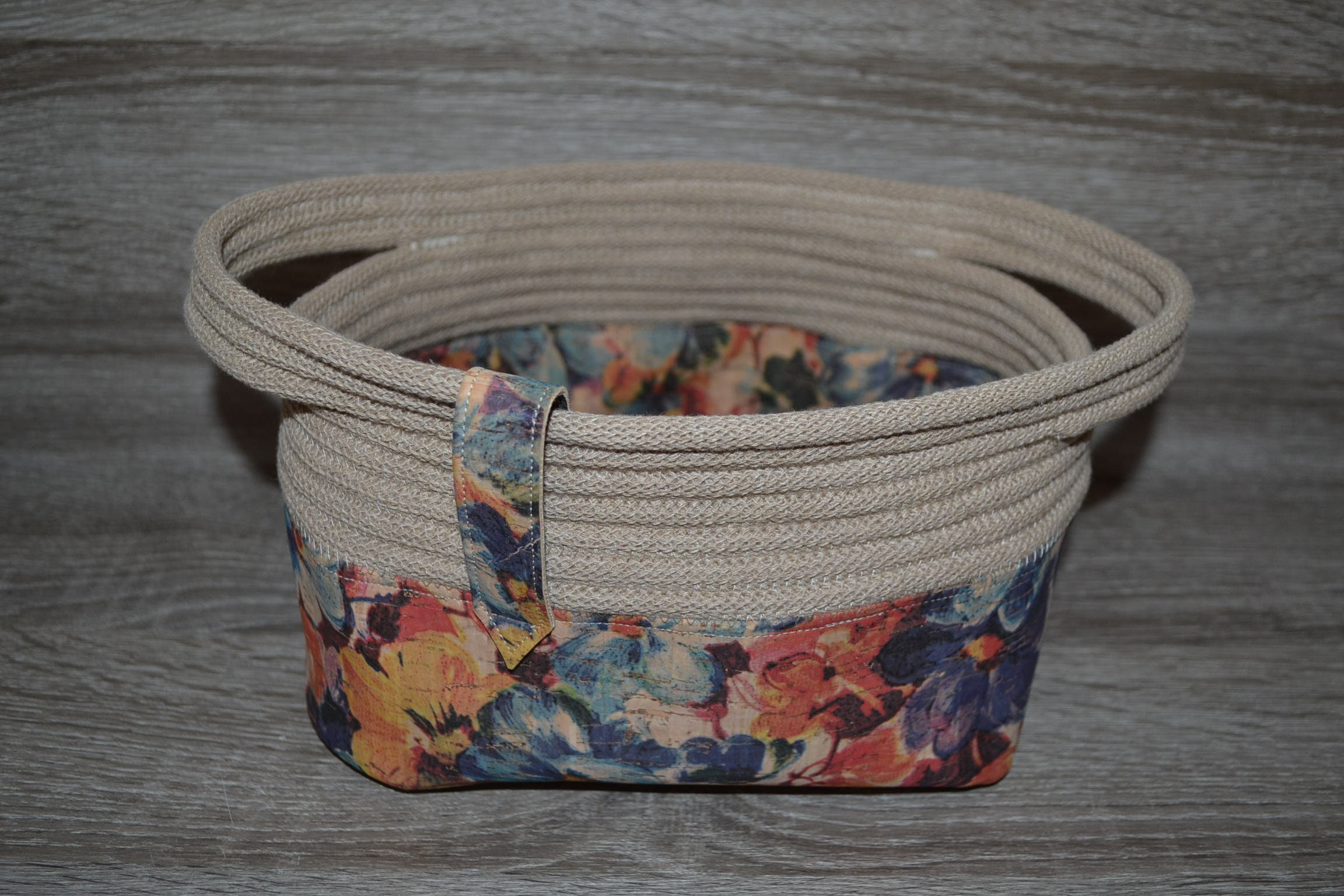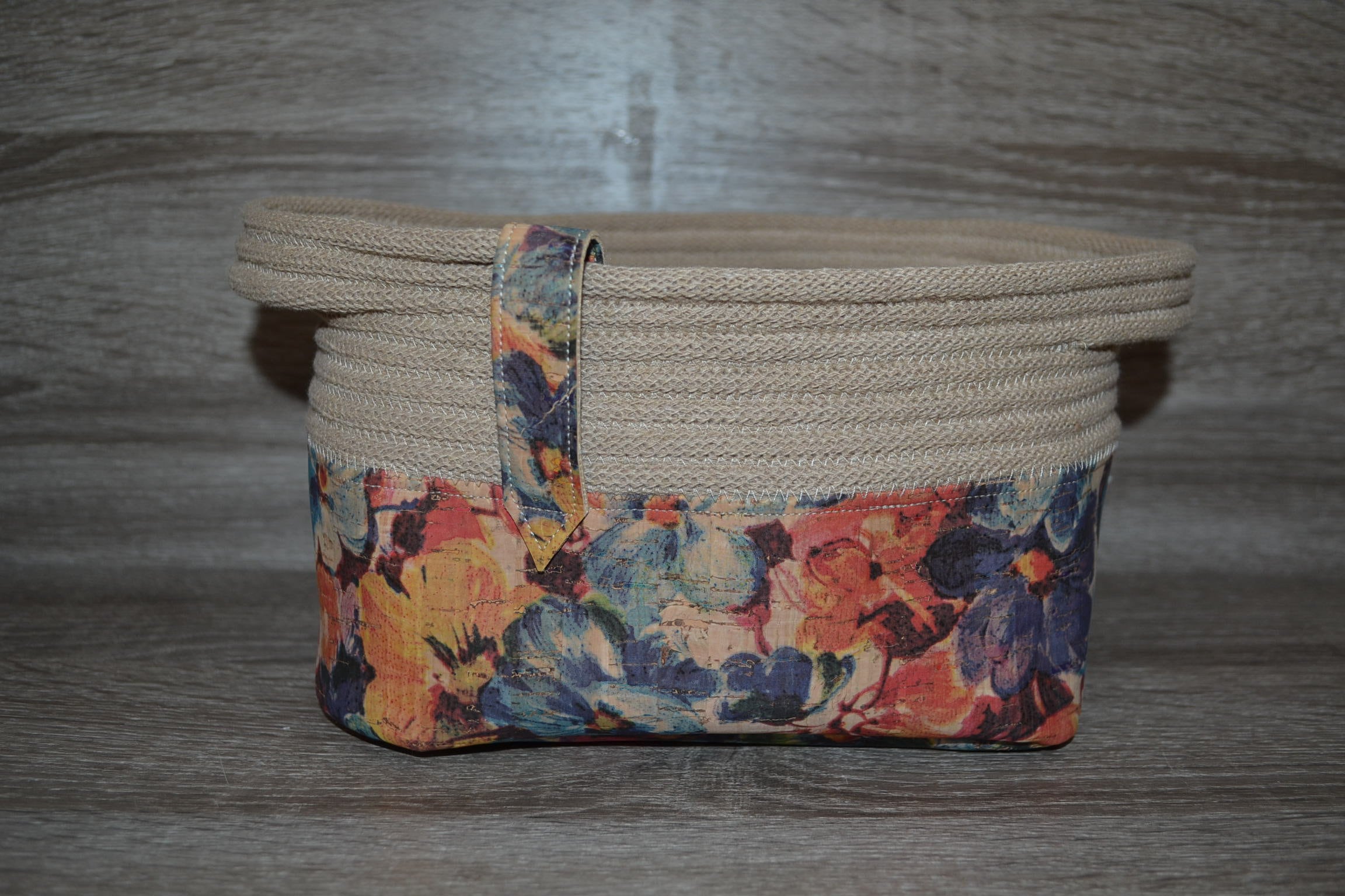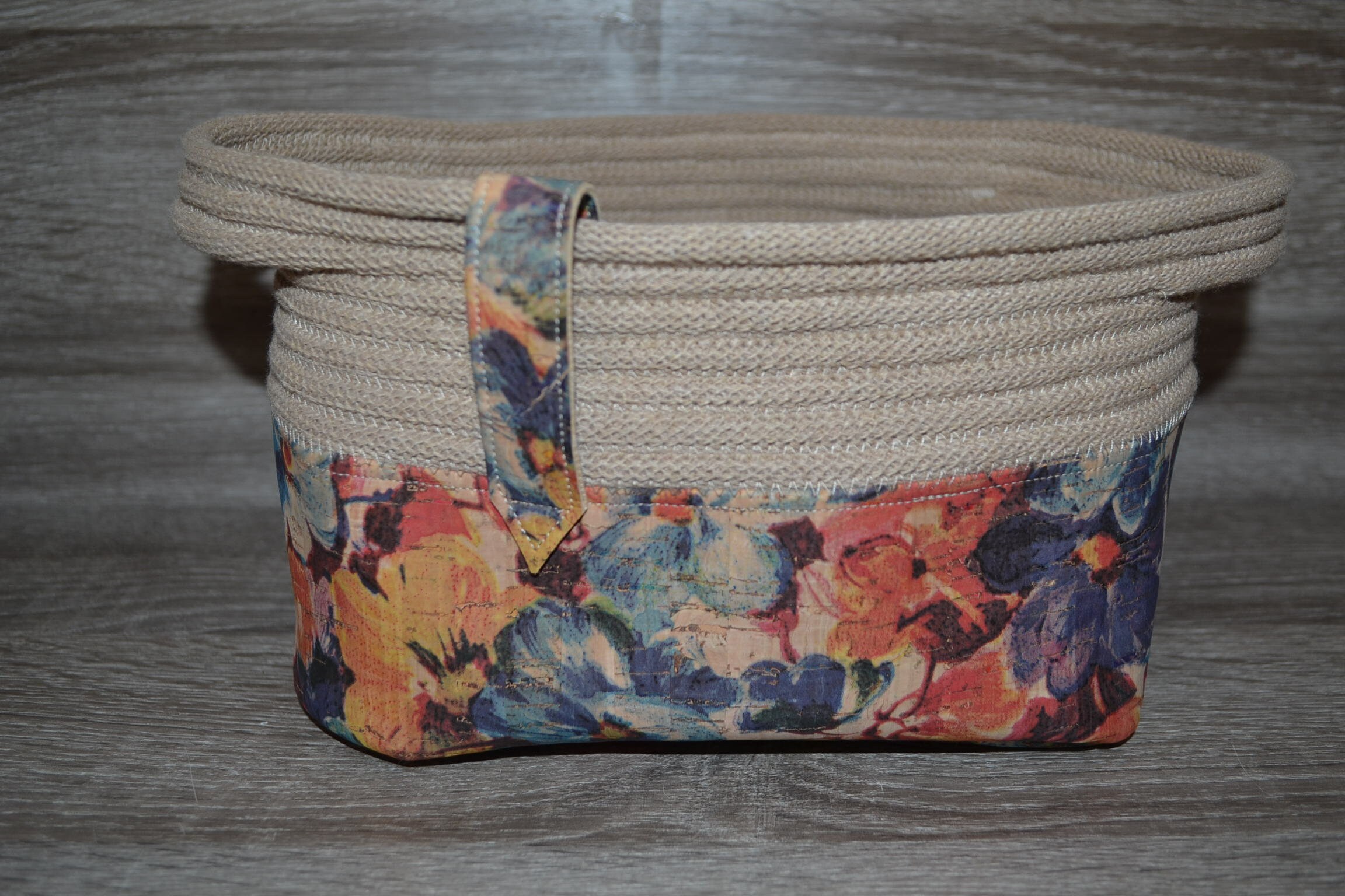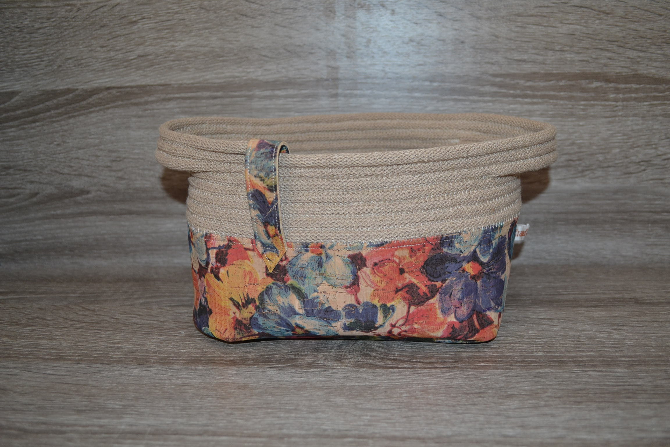 Utensilo made of floral cork and beige cotton cord, cork bottom silo, utensilo patterned 20x14x13 cm, storage basket,
