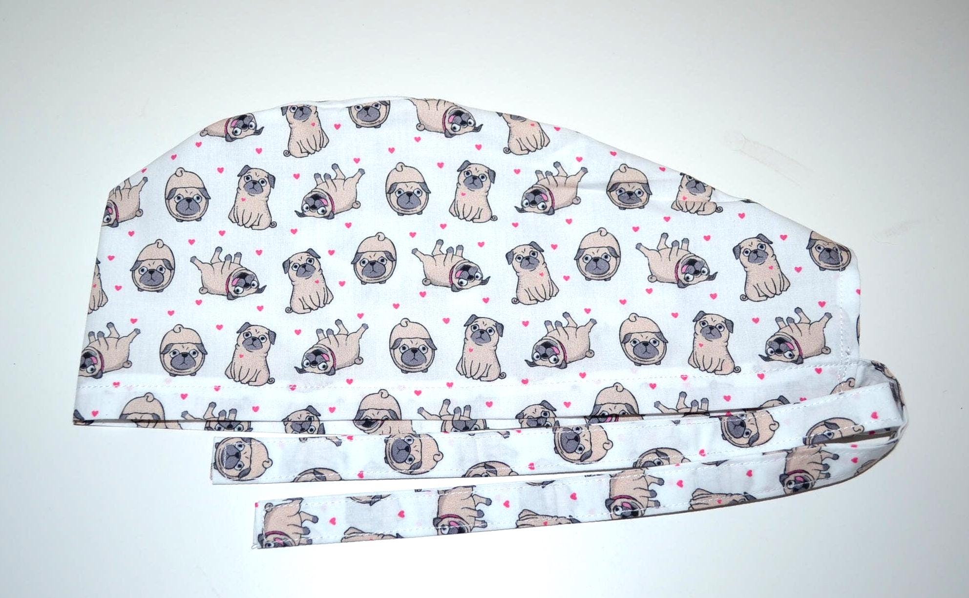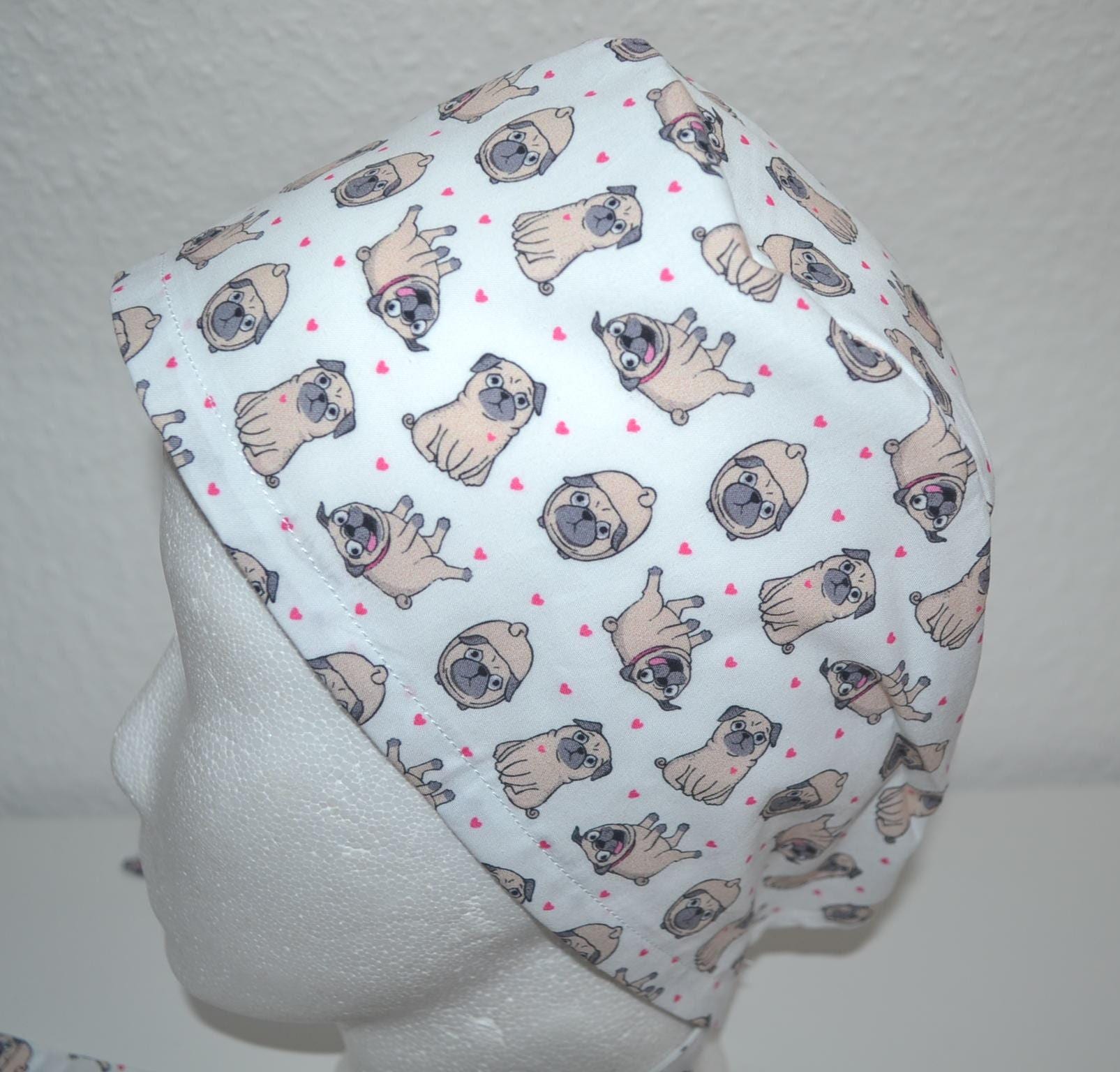 Surgical cap for pugs, terry cloth band, scrub cap, chef's cap, bandana, peeling cap, cosmetic cap, surgical caps, white with pugs, dog cap