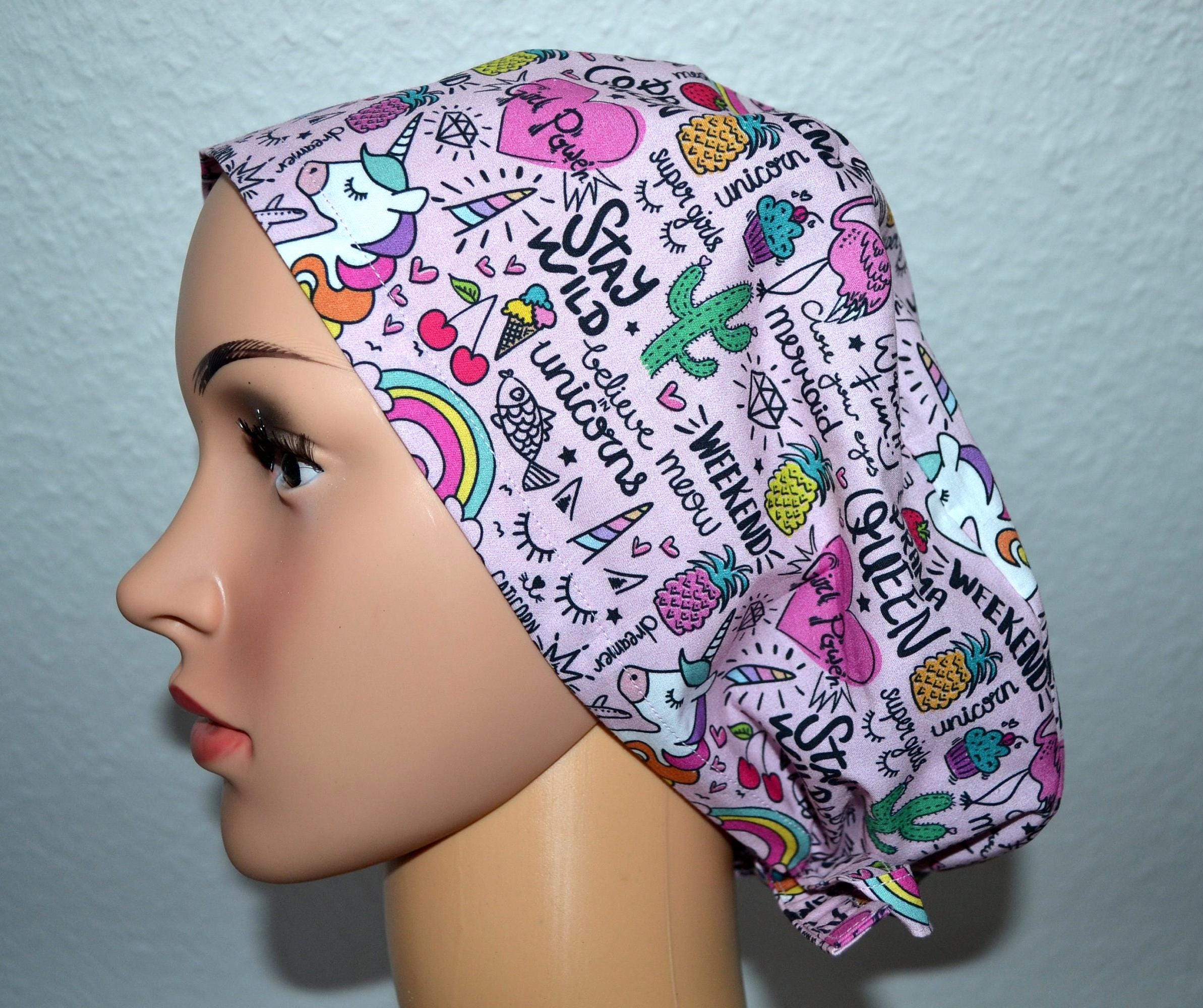 Surgical cap XL for long hair unicorn, XL scrub cap, bandana, cosmetic cap, cooking cap, peeling cap, taupe with unicorns, unicorn cap,