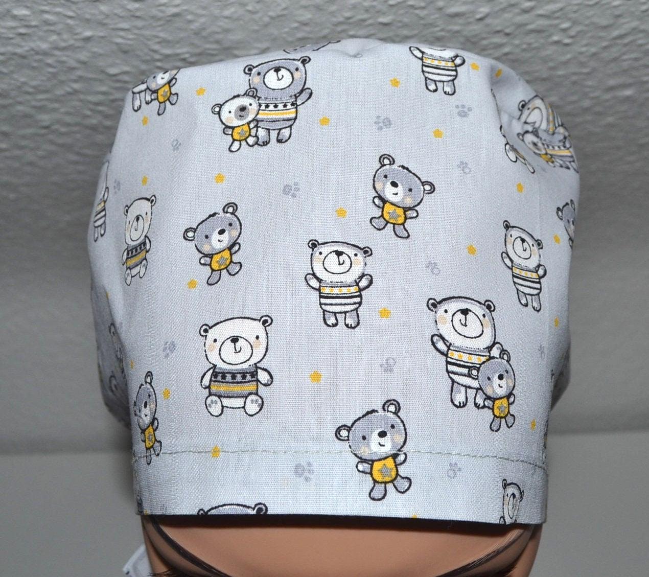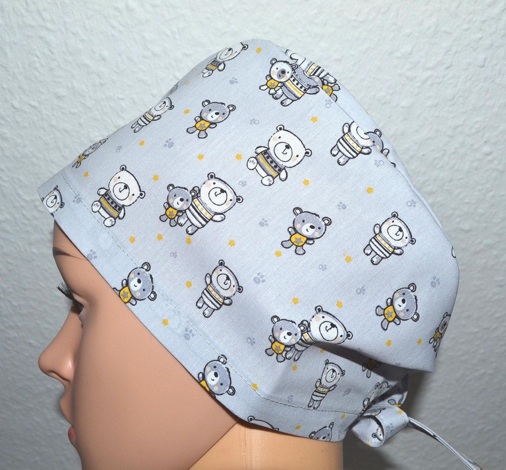 Surgical cap with bears and terry cloth band, scrub cap, cosmetic cap, chef's cap, bandana, peeling cap, light grey with teddy bears, bear cap