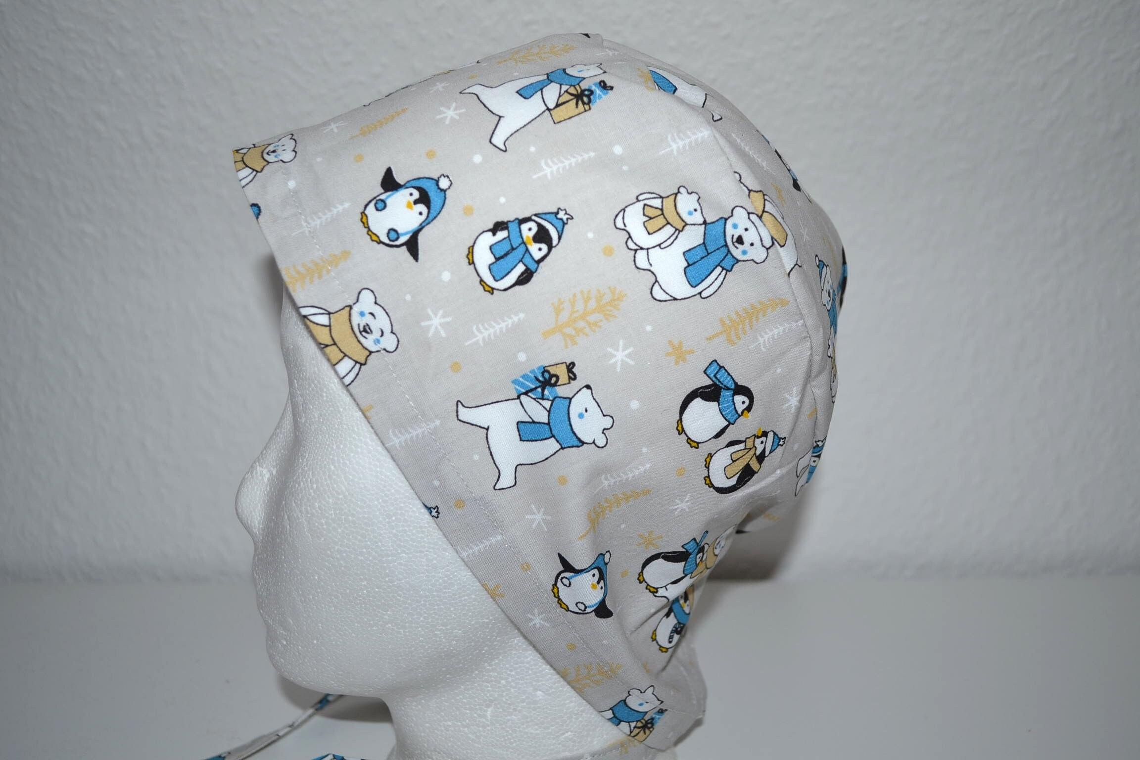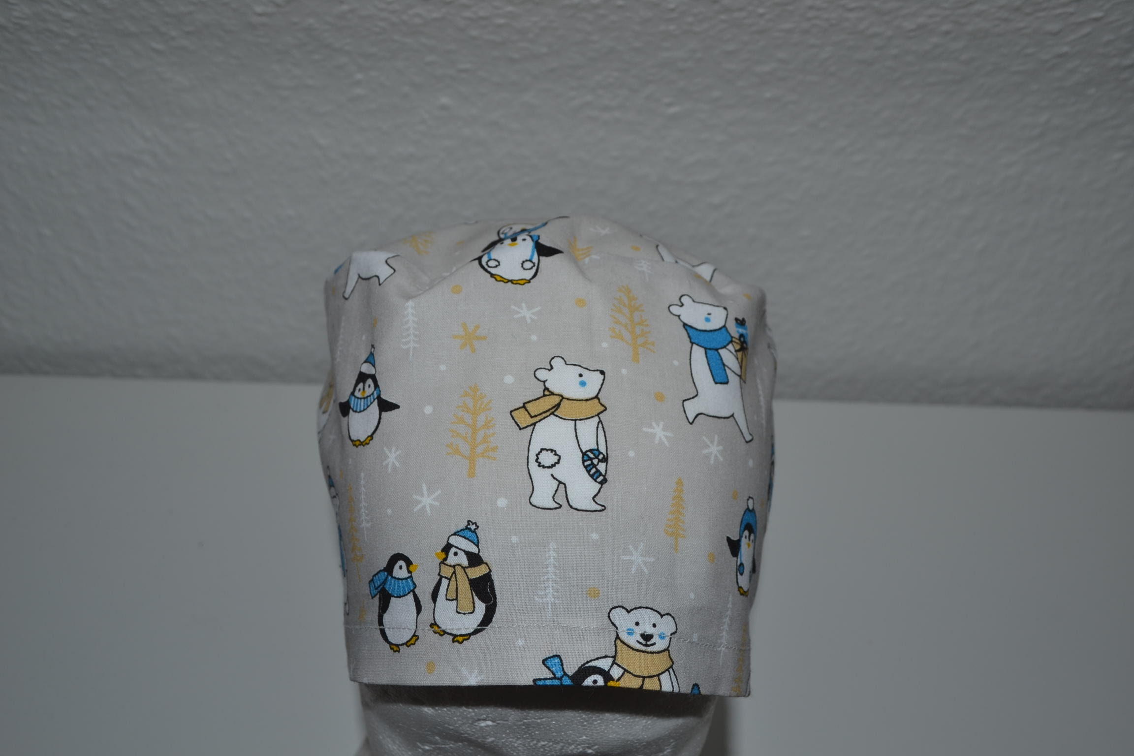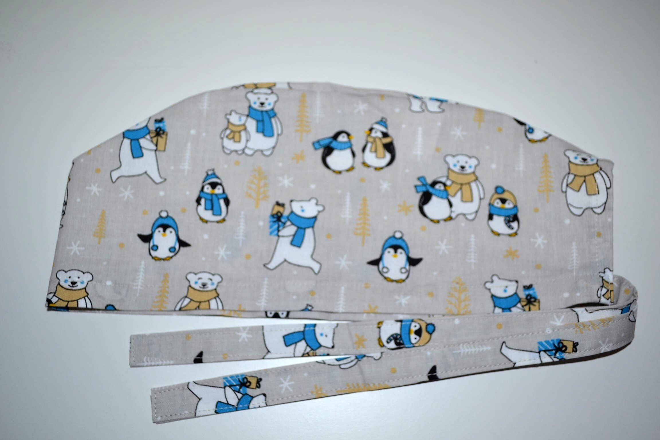 Surgical cap with polar bear terry cloth, scrub cap, bandana, cosmetic cap, surgical caps, chef's hat, beige with polar bear and penguin, Christmas cap
