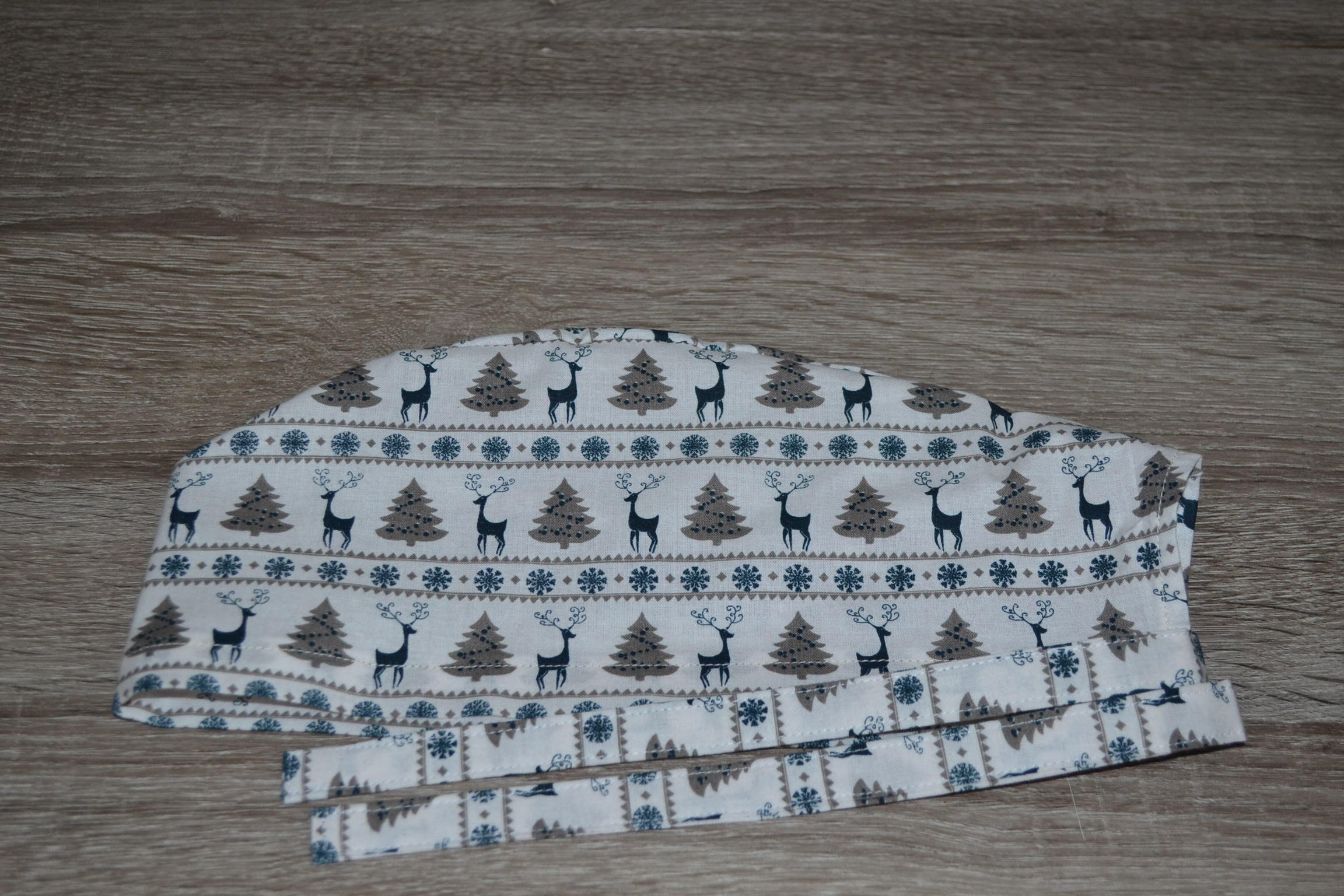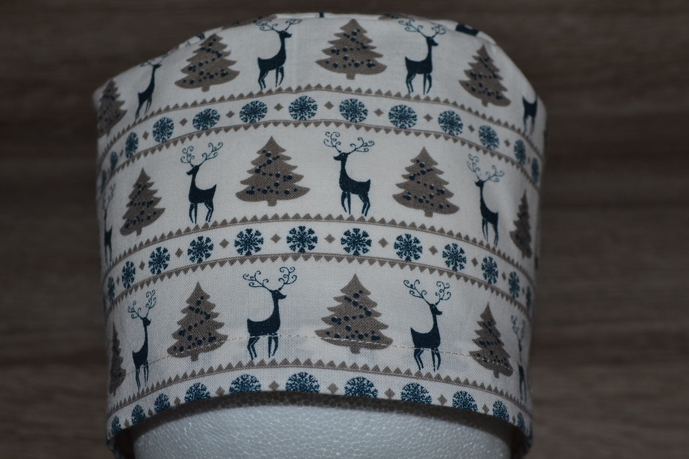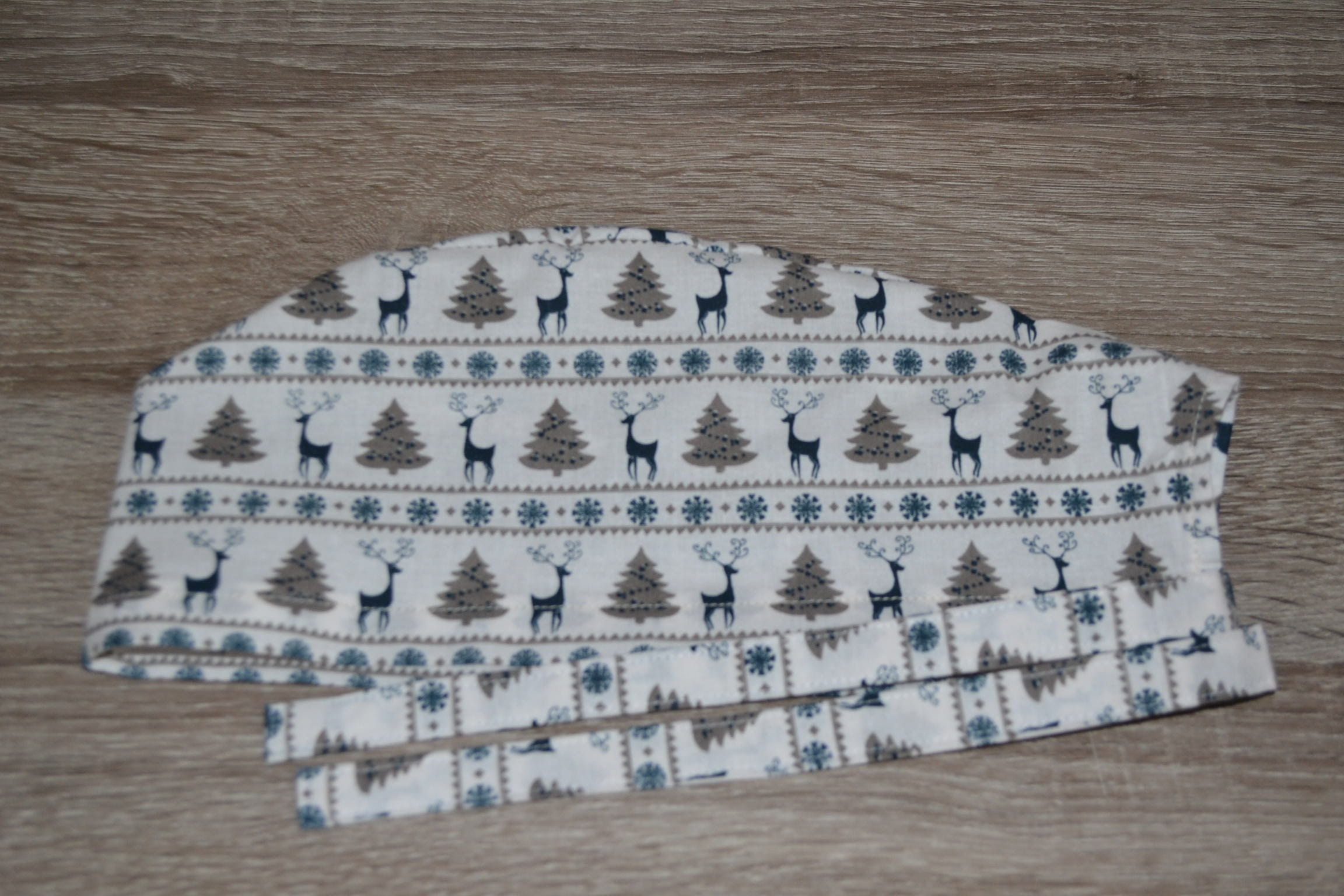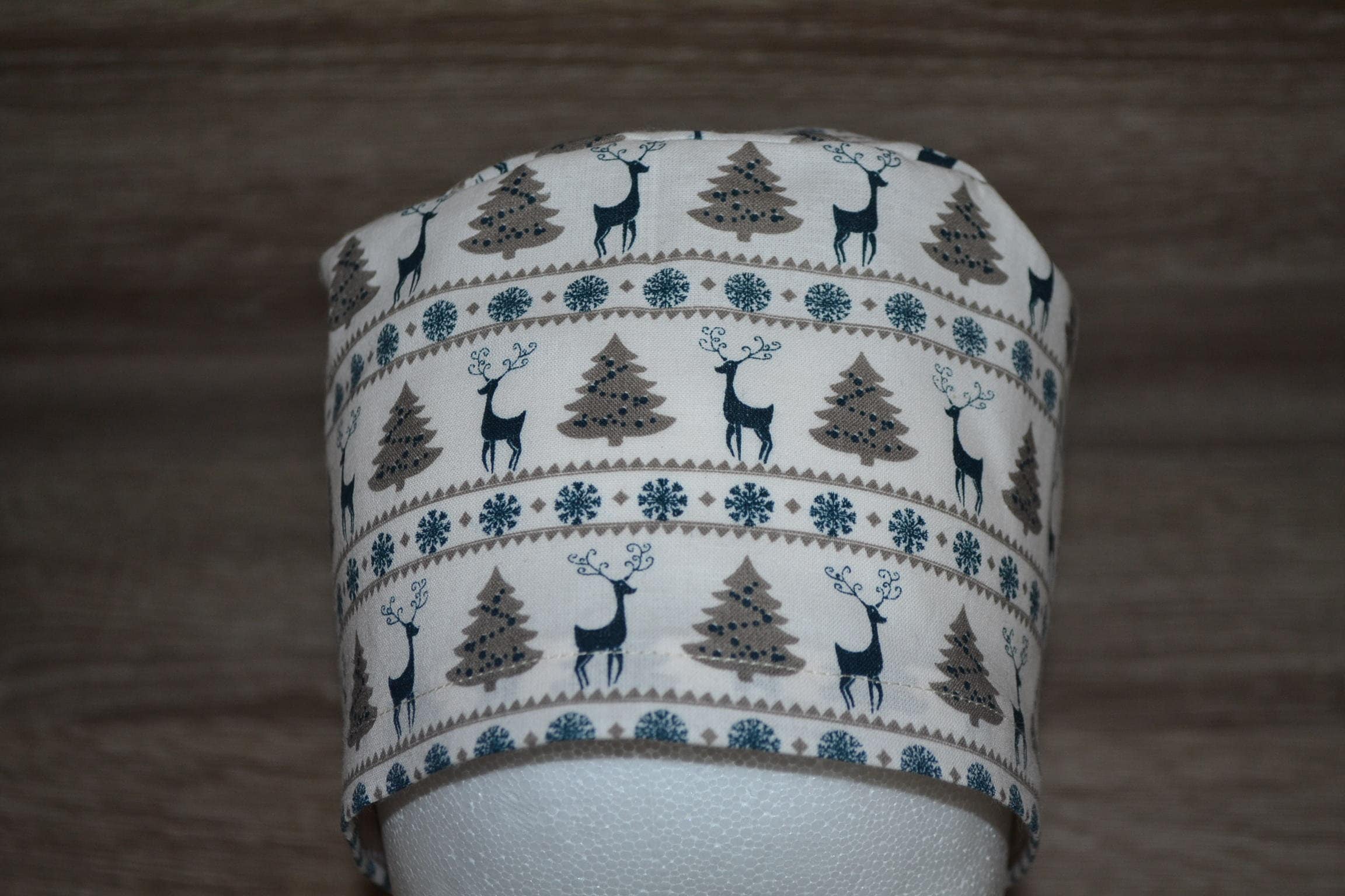 Surgical cap deer terry cloth band, scrub cap, bandana, cosmetic cap, chef's hat, white with deer and Christmas tree, Christmas cap, winter forest