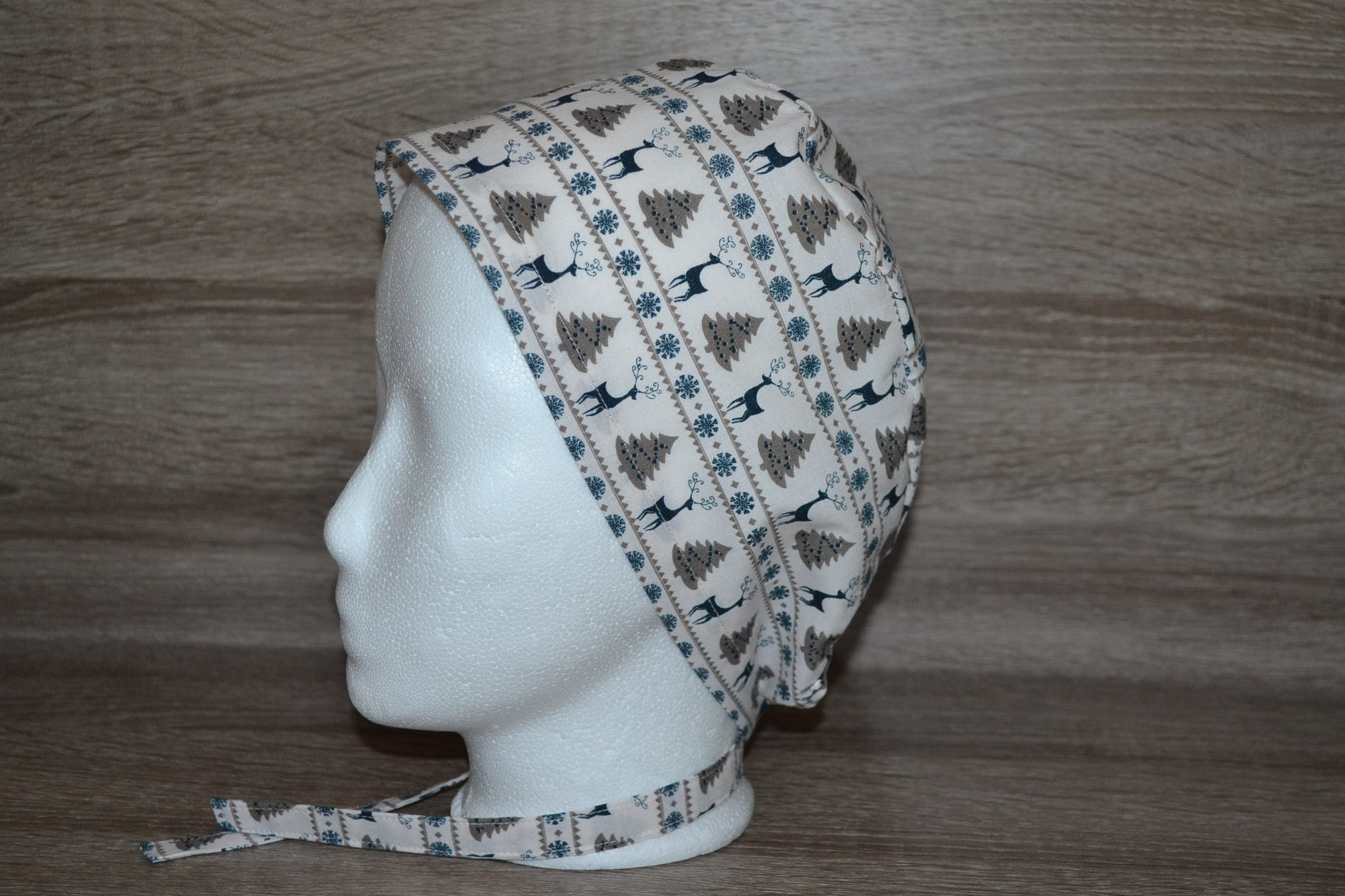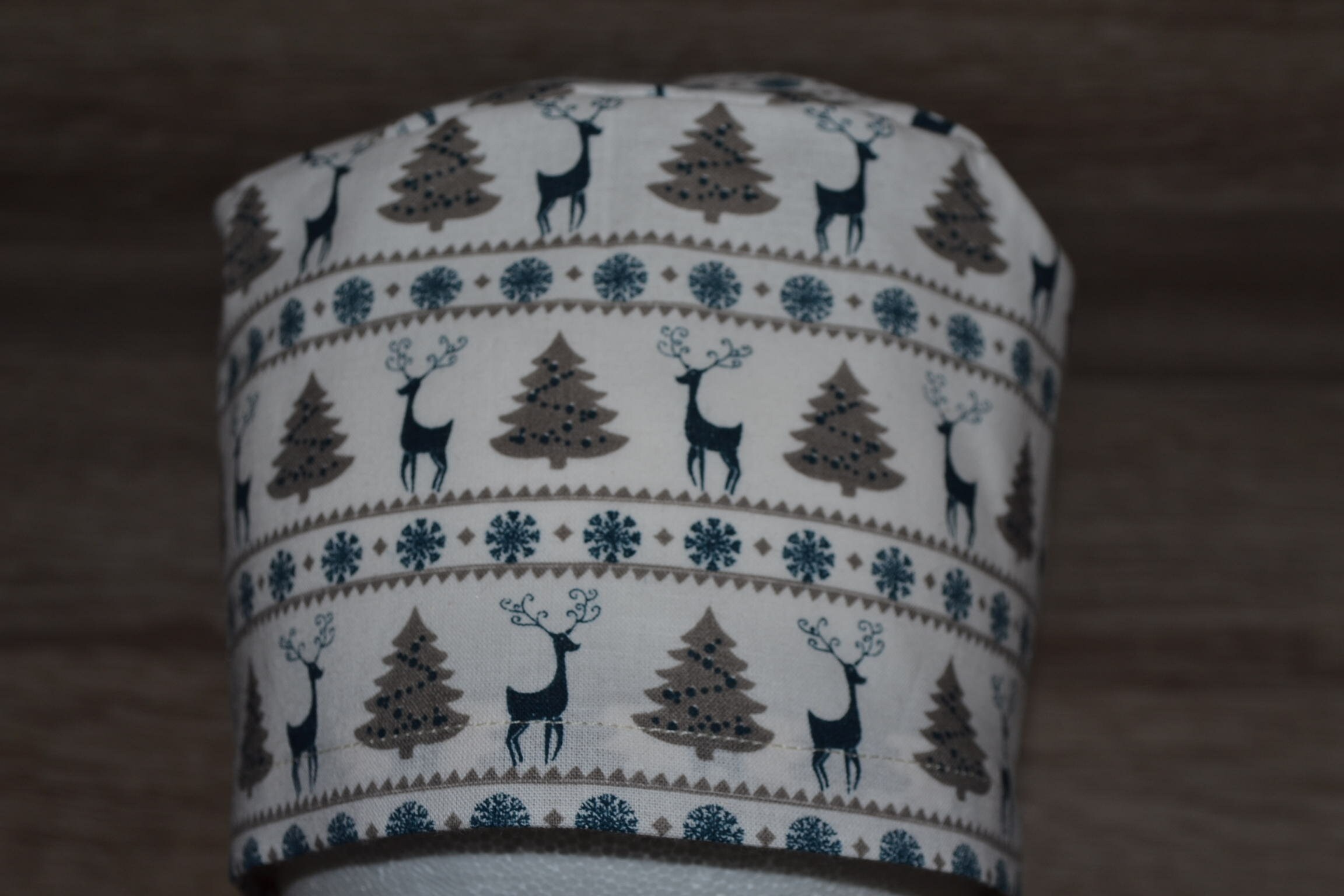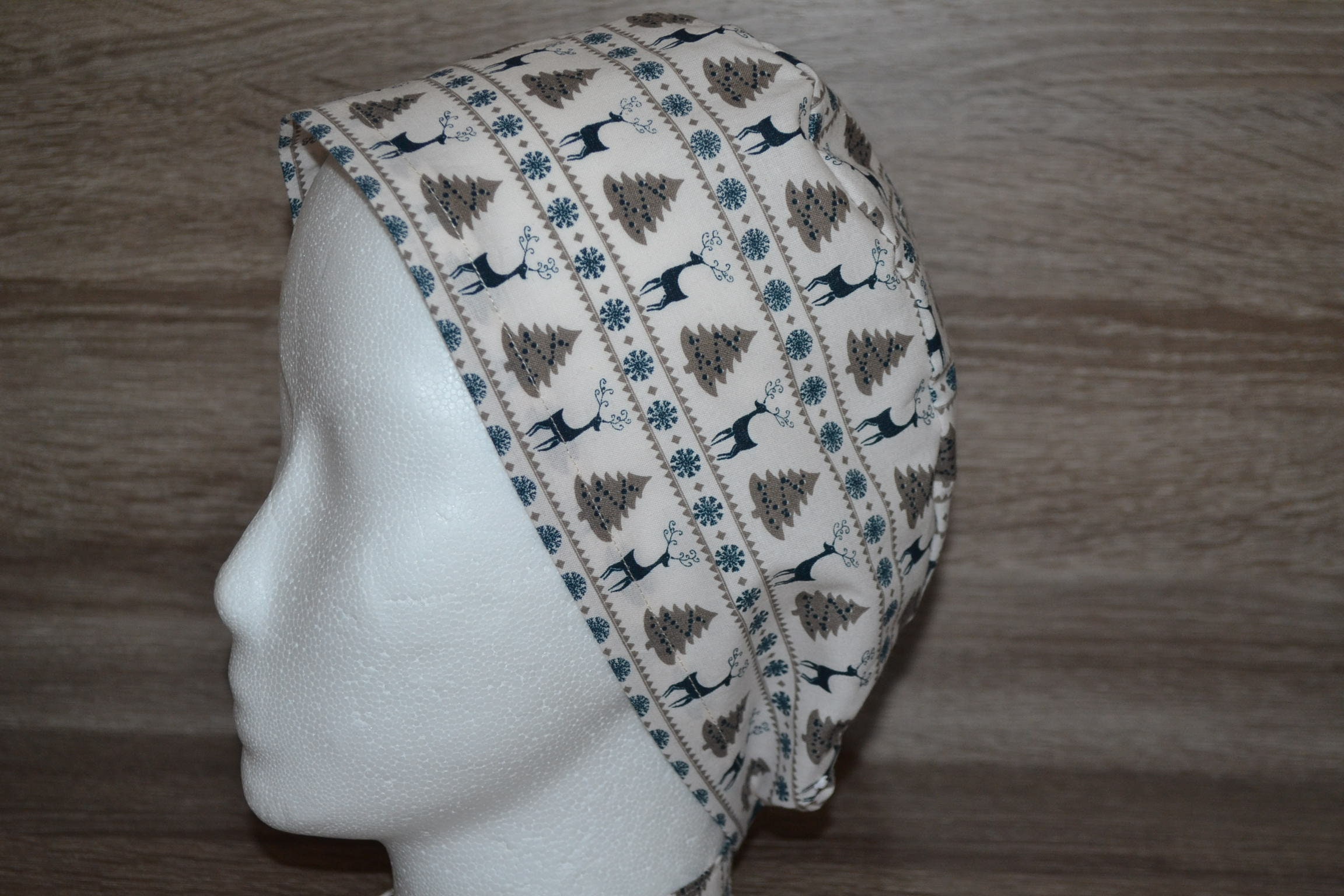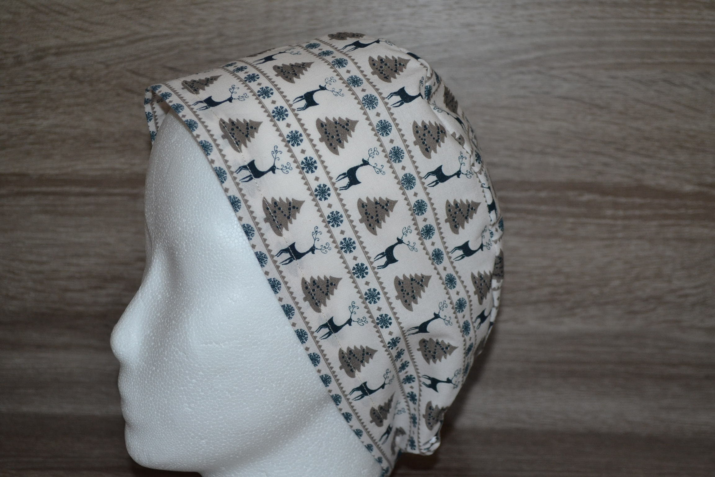 Surgical cap deer terry cloth band, scrub cap, bandana, cosmetic cap, chef's hat, white with deer and Christmas tree, Christmas cap, winter forest