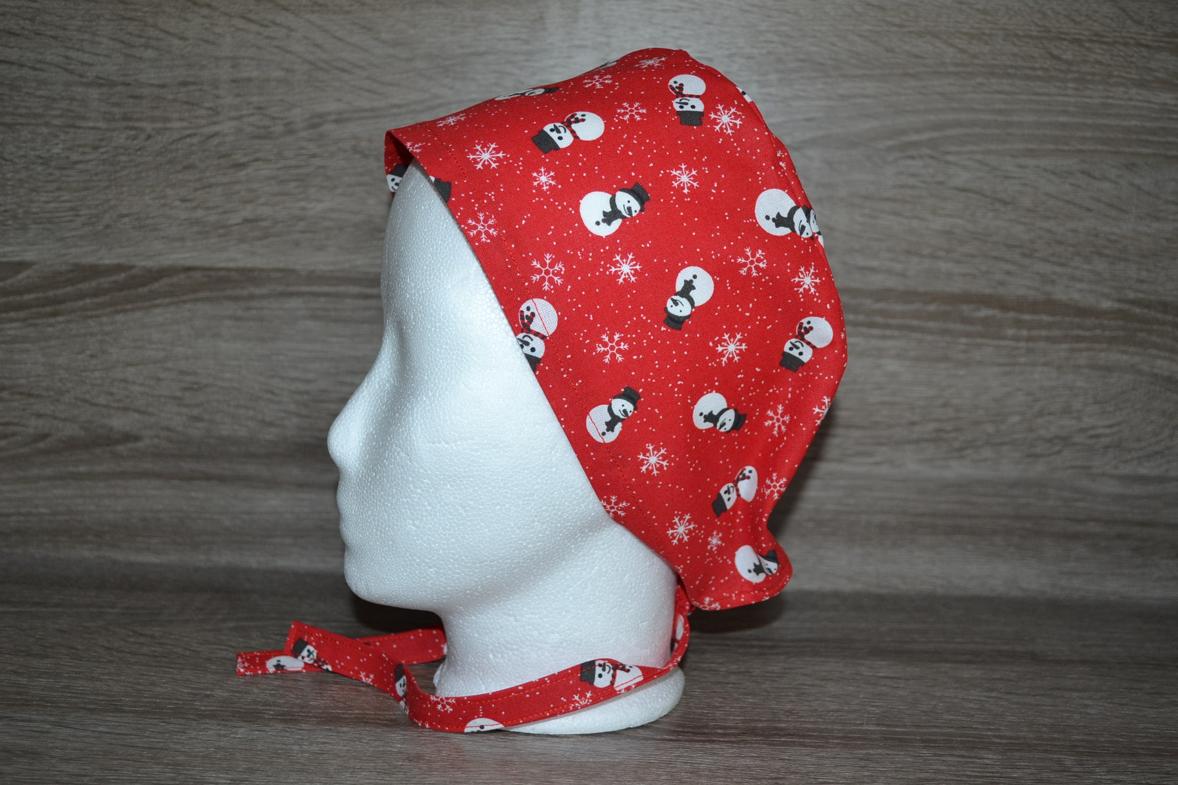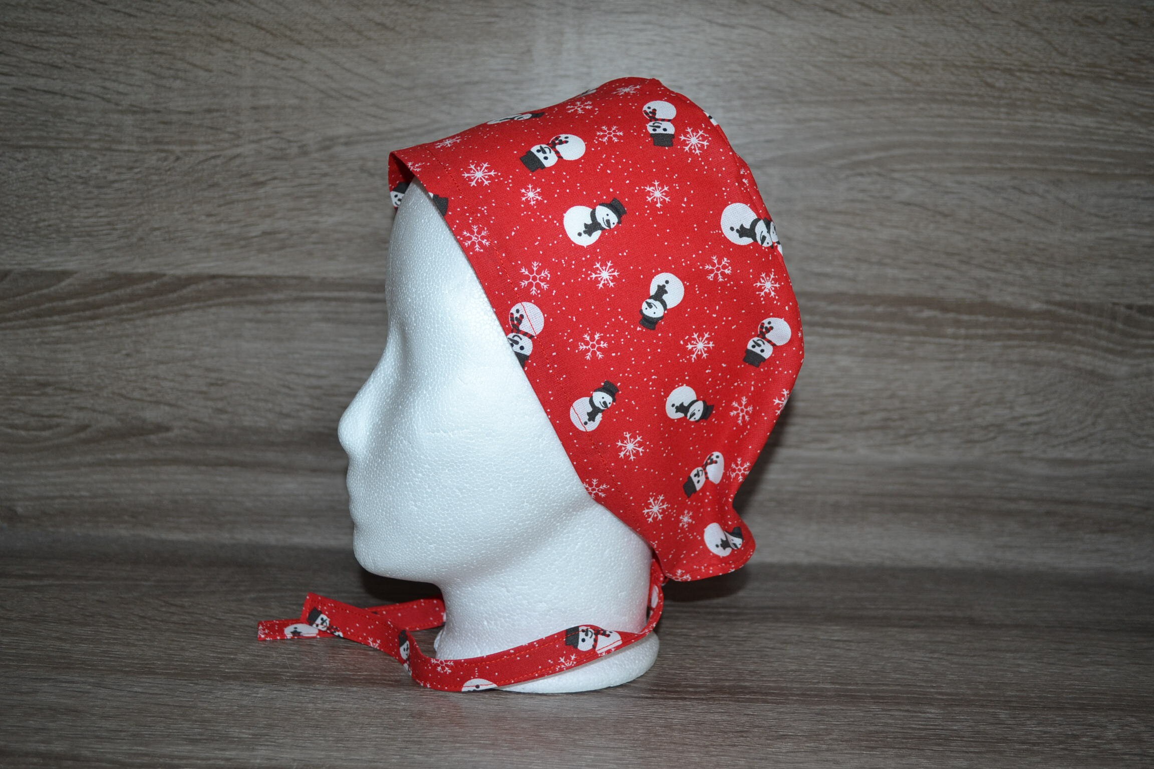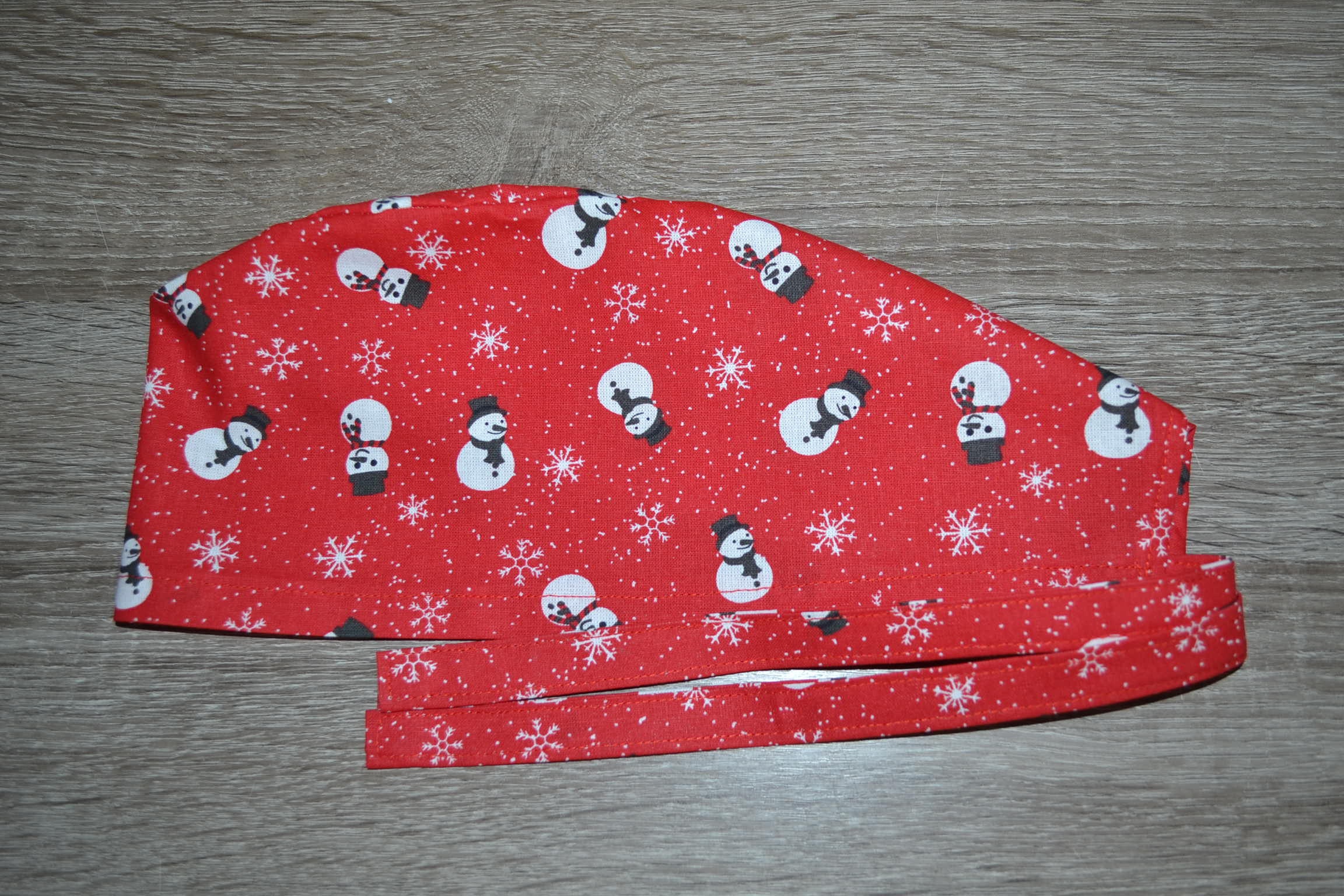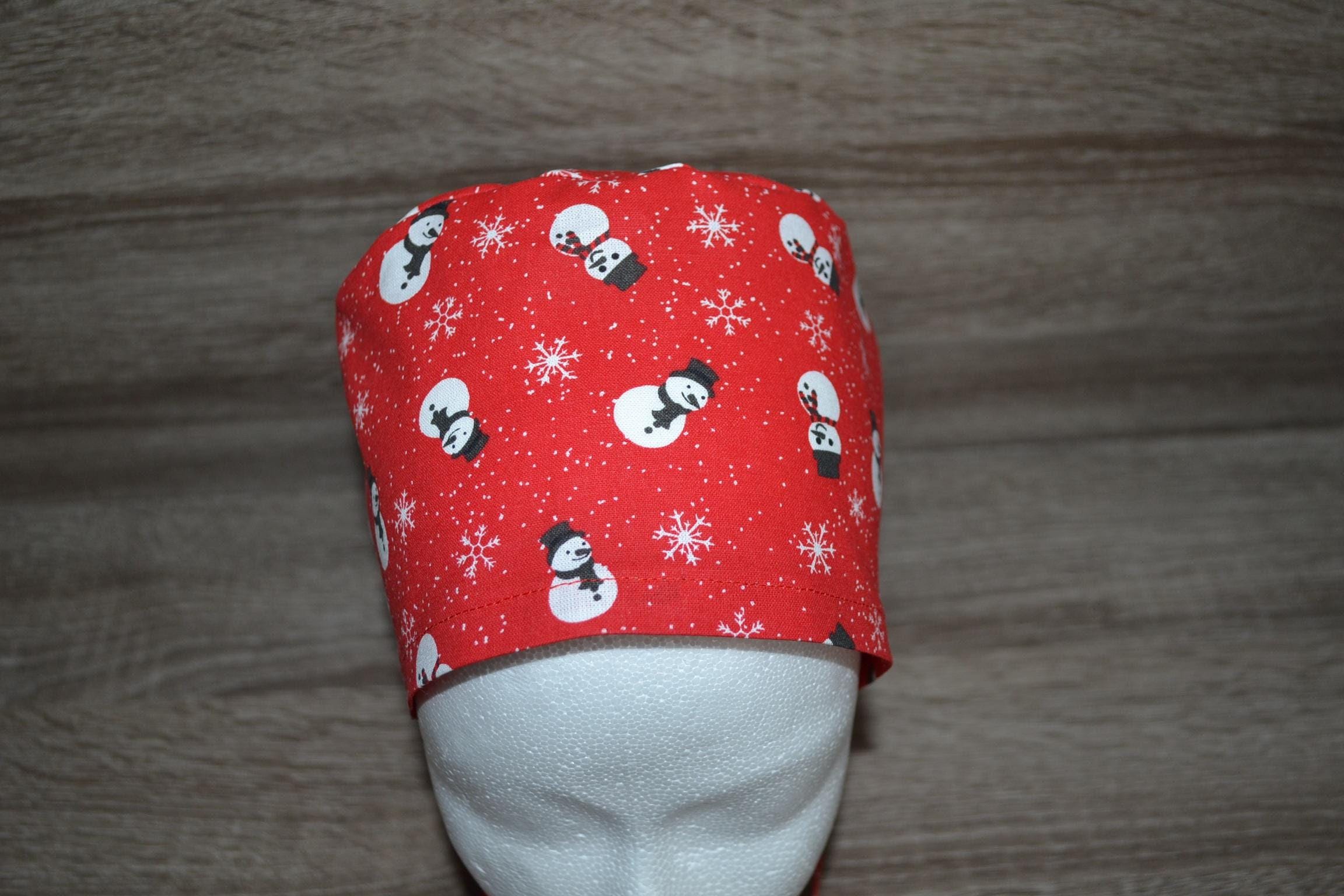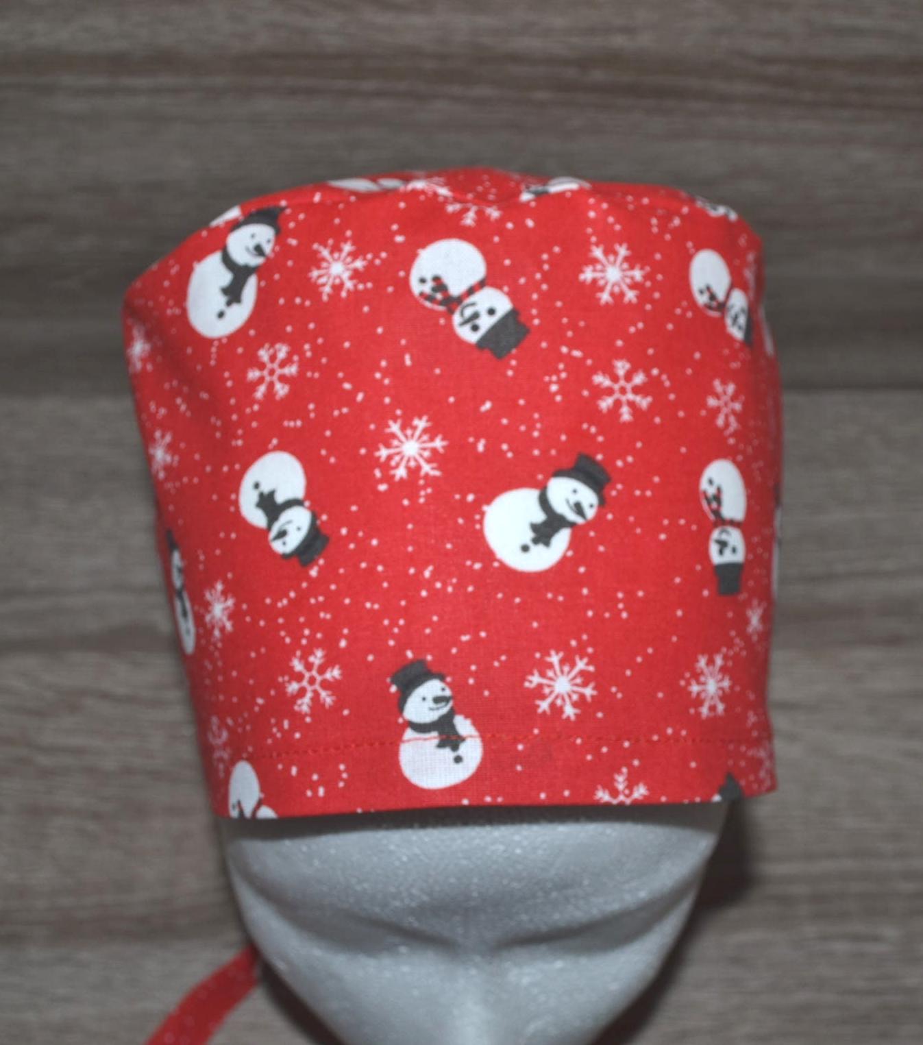 Surgical cap with snowman design, terry cloth band, scrub cap, bandana, cosmetic cap, peeling cap, chef's hat, red with snowmen, Christmas surgical caps