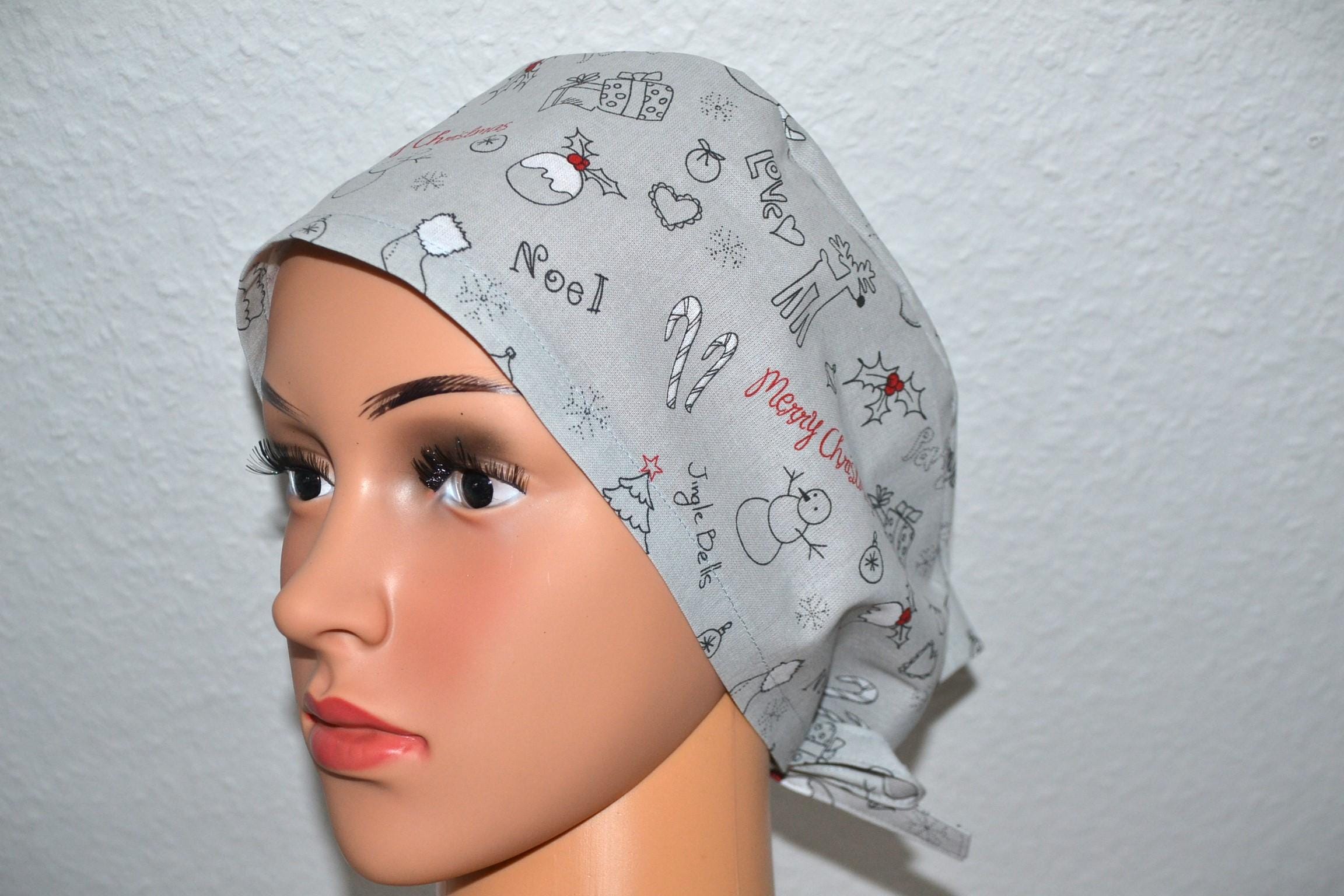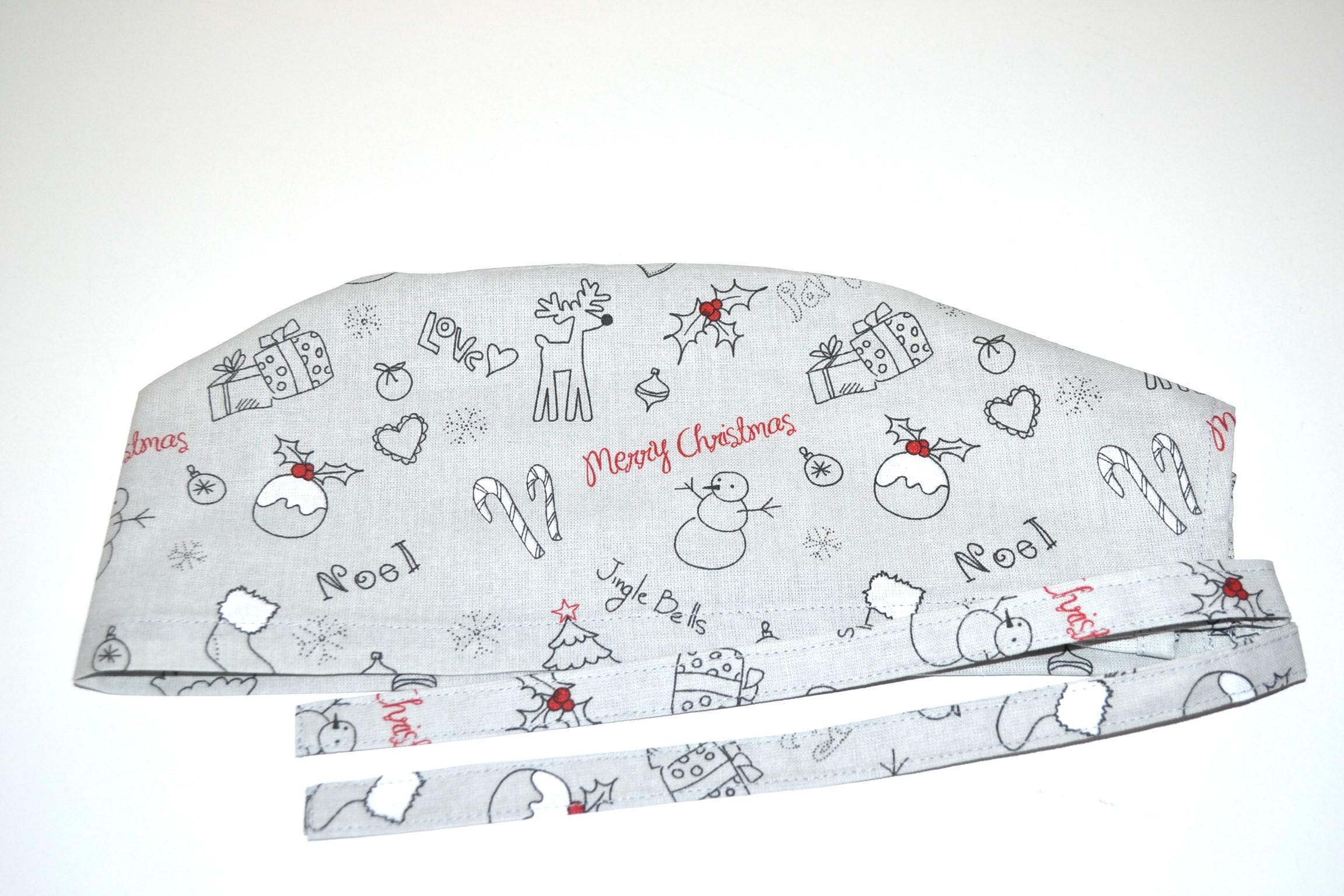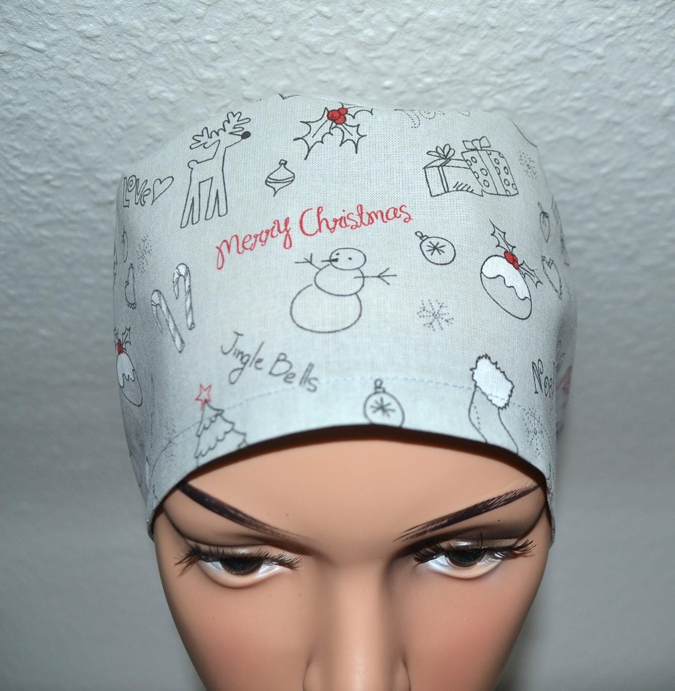 Surgical cap with snowman design, terry cloth band, scrub cap, bandana, cosmetic cap, chef's hat, light grey with Christmas motifs, Christmas surgical caps