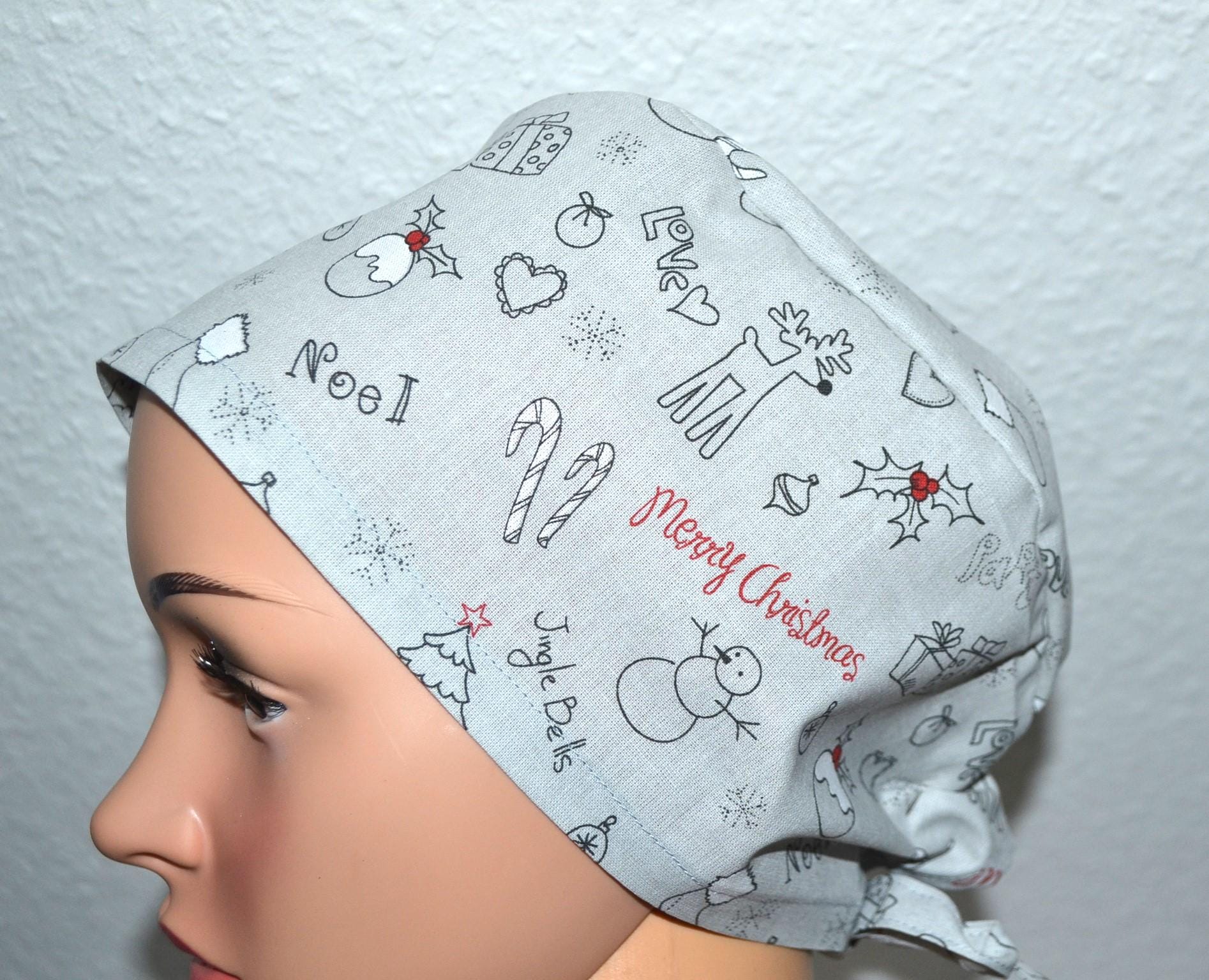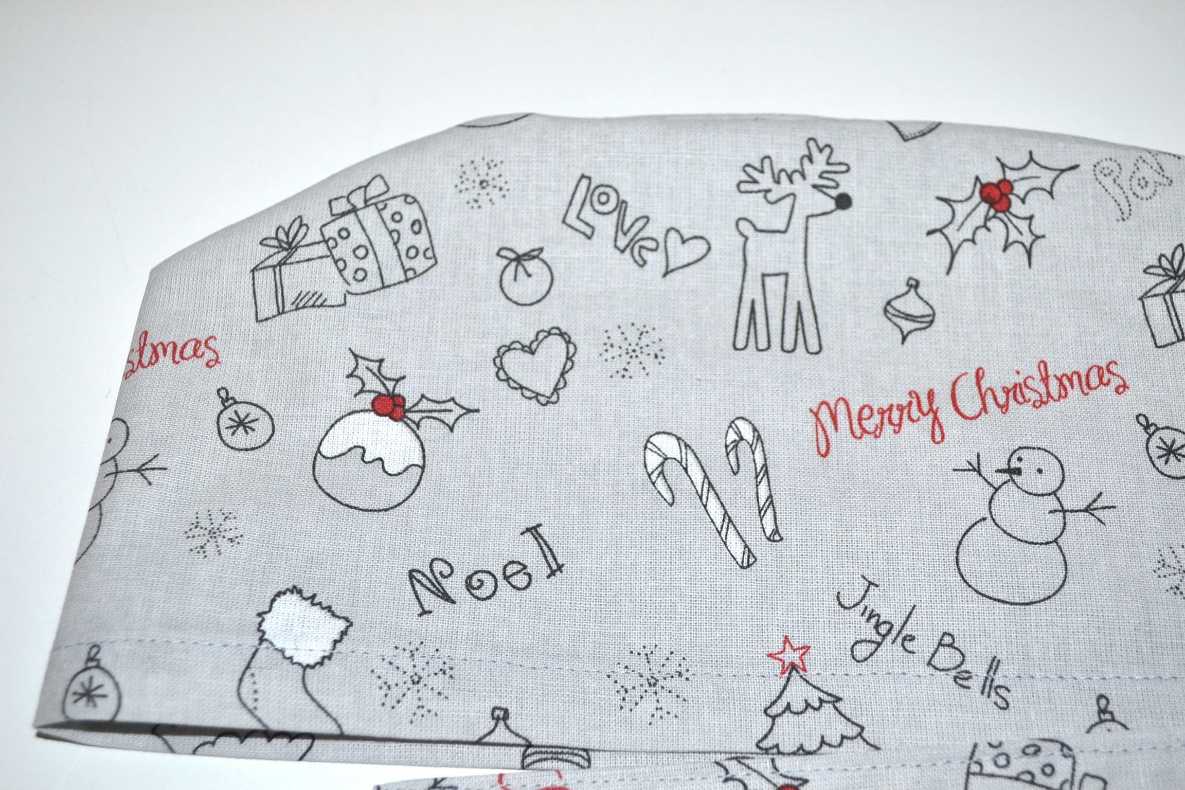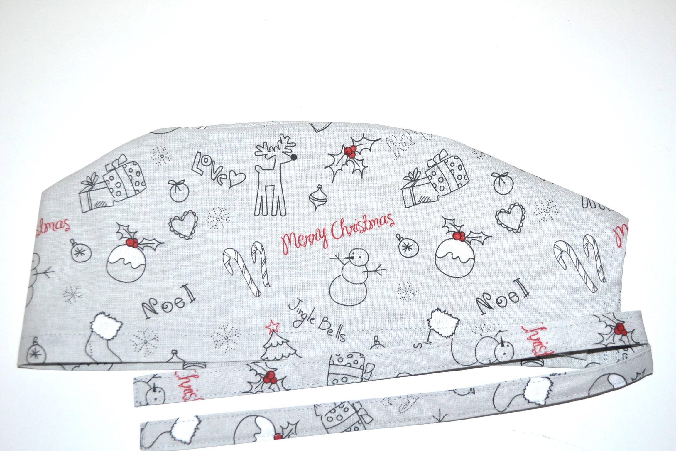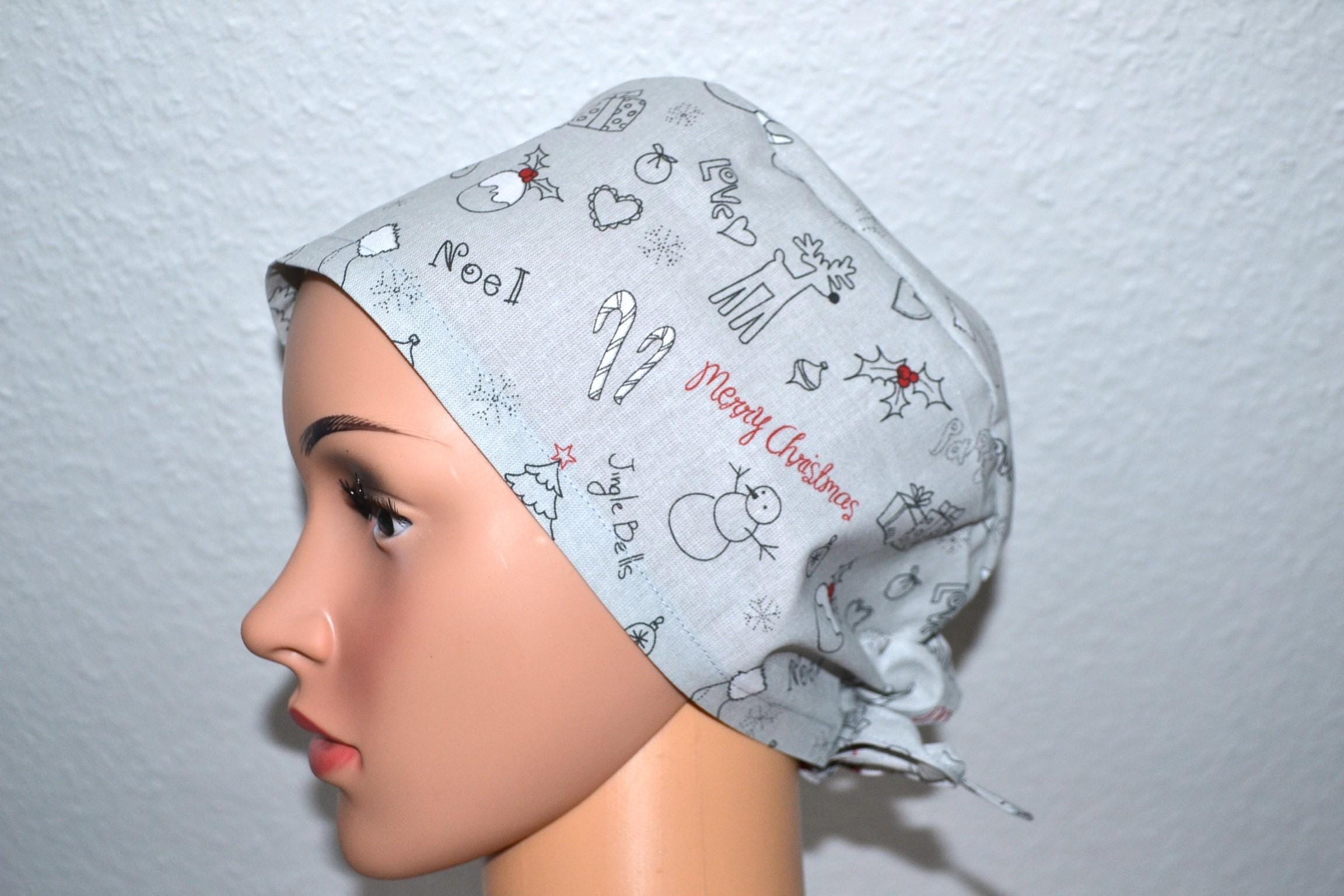 Surgical cap with snowman design, terry cloth band, scrub cap, bandana, cosmetic cap, chef's hat, light grey with Christmas motifs, Christmas surgical caps