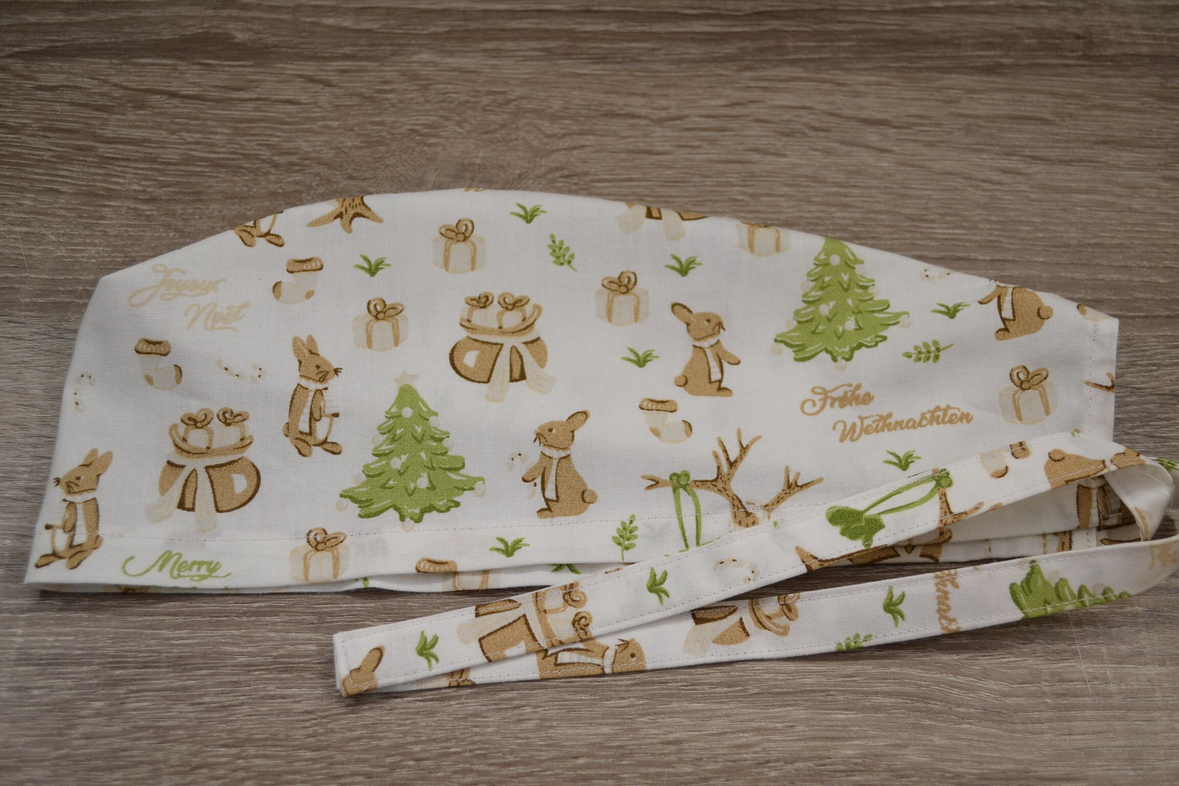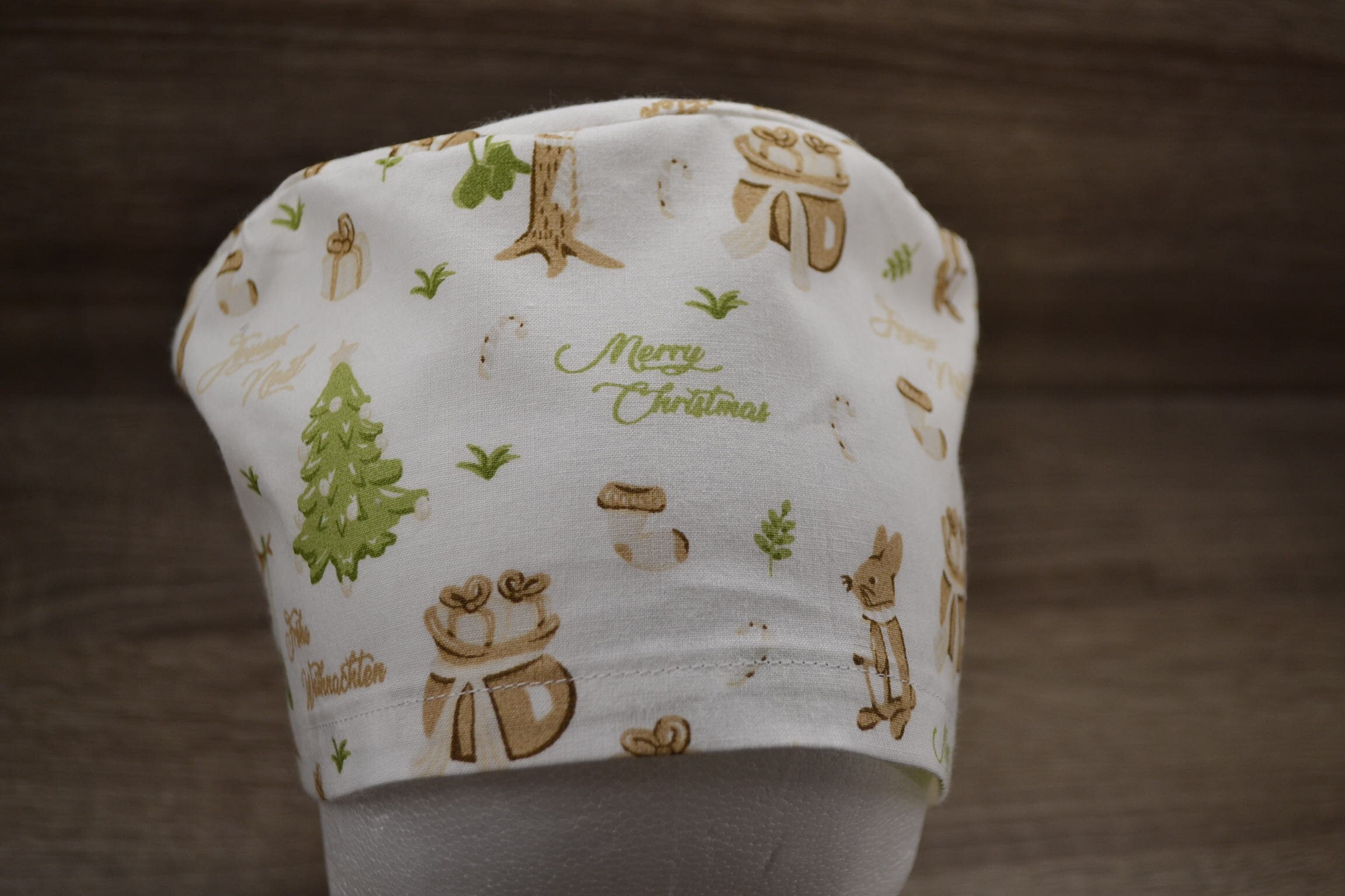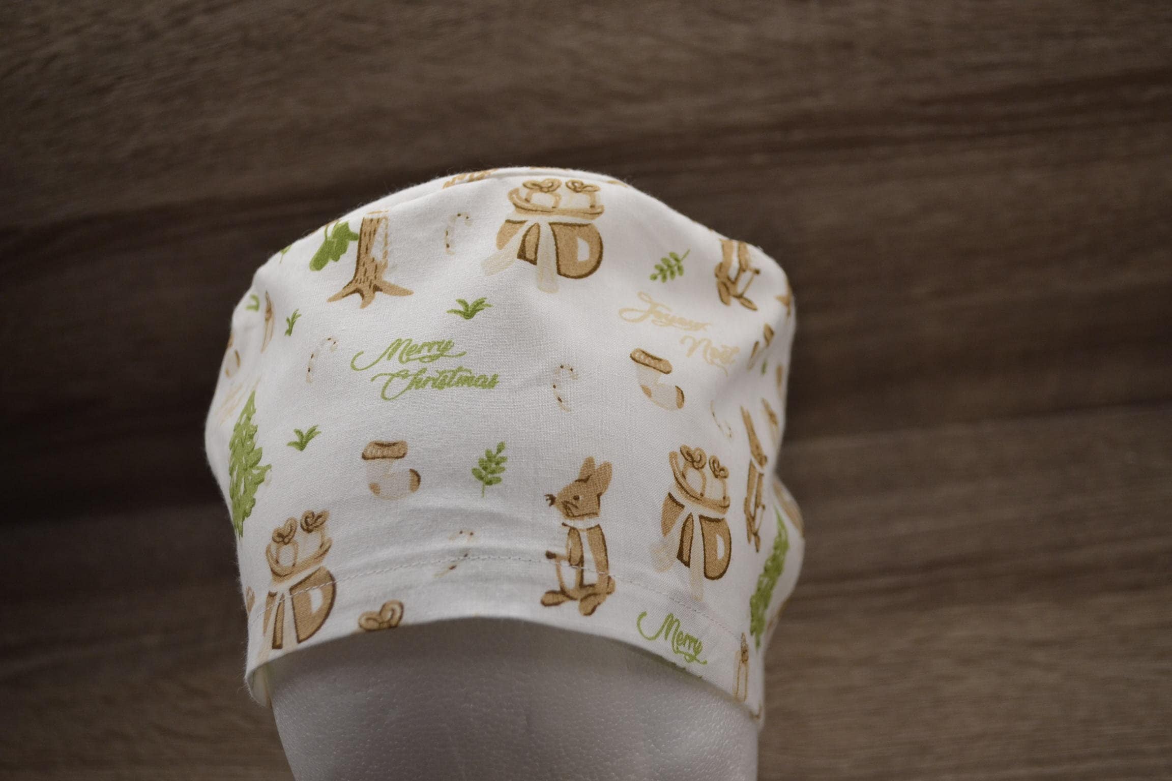Surgical cap winter forest terry cloth band, scrub cap, bandana, cosmetic cap, peeling cap, beige with Christmas tree and rabbits, surgical caps Christmas,