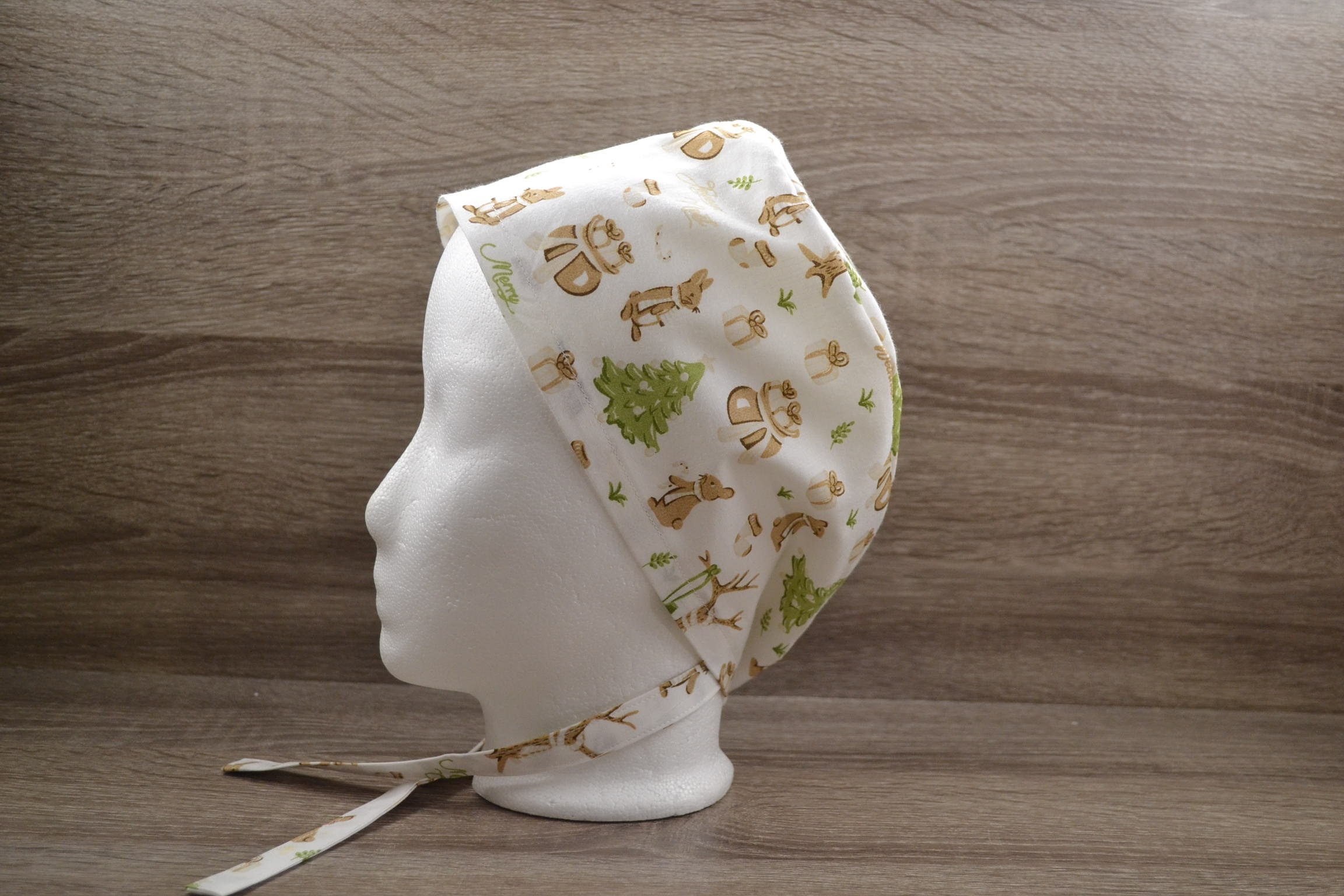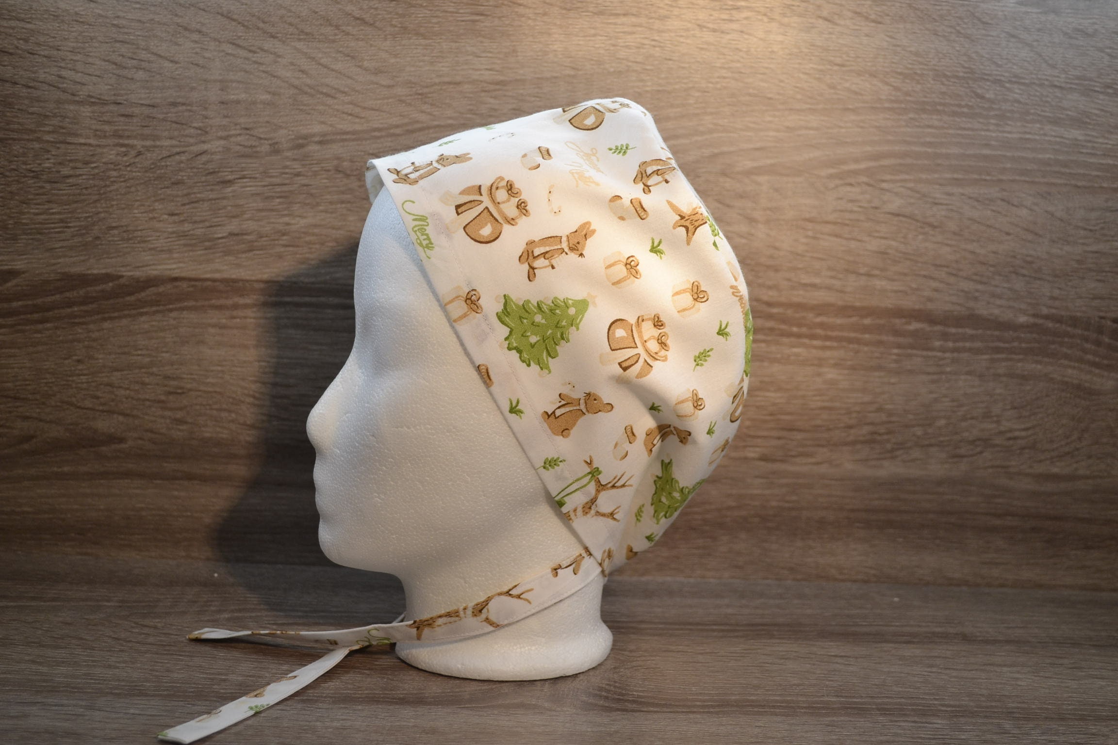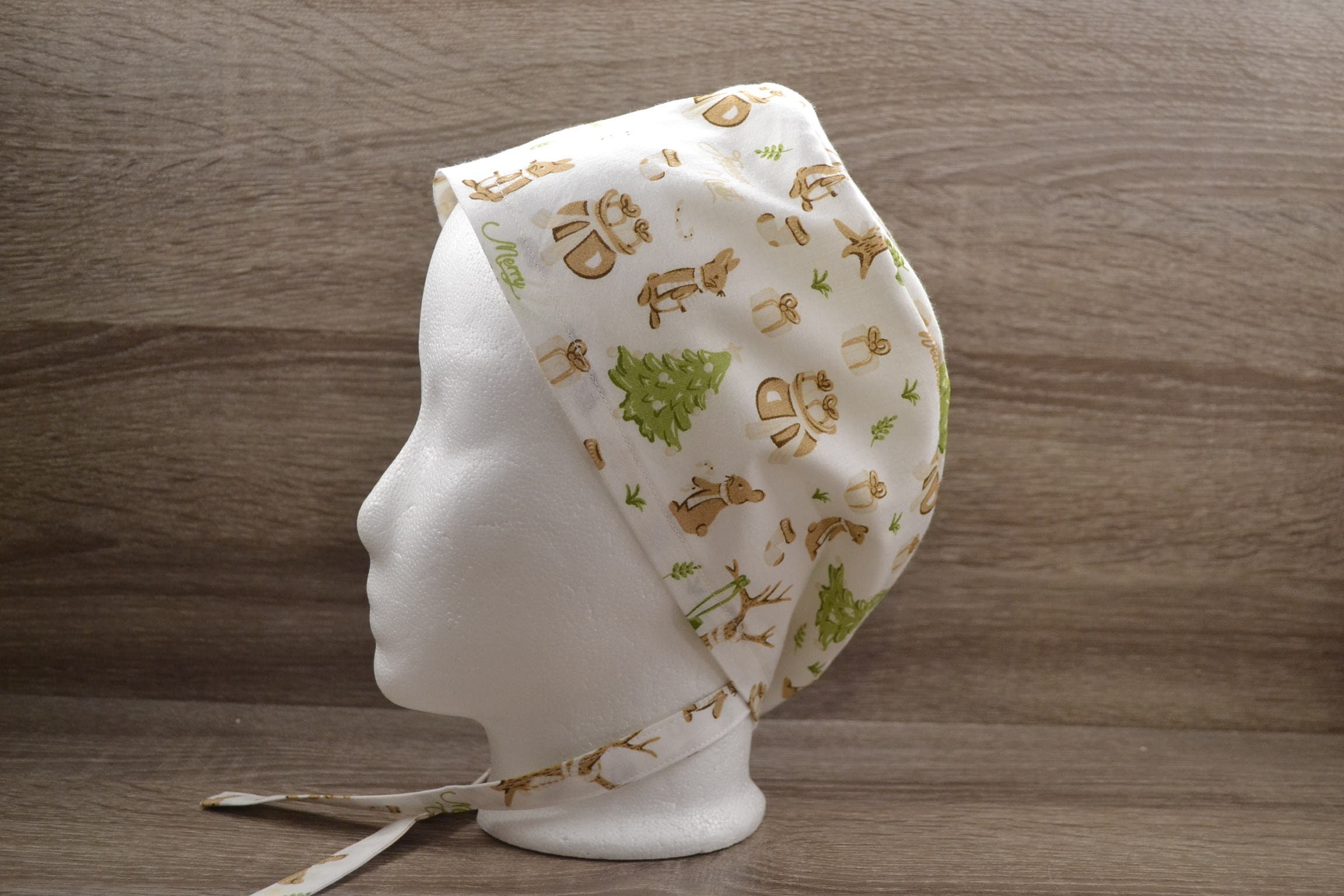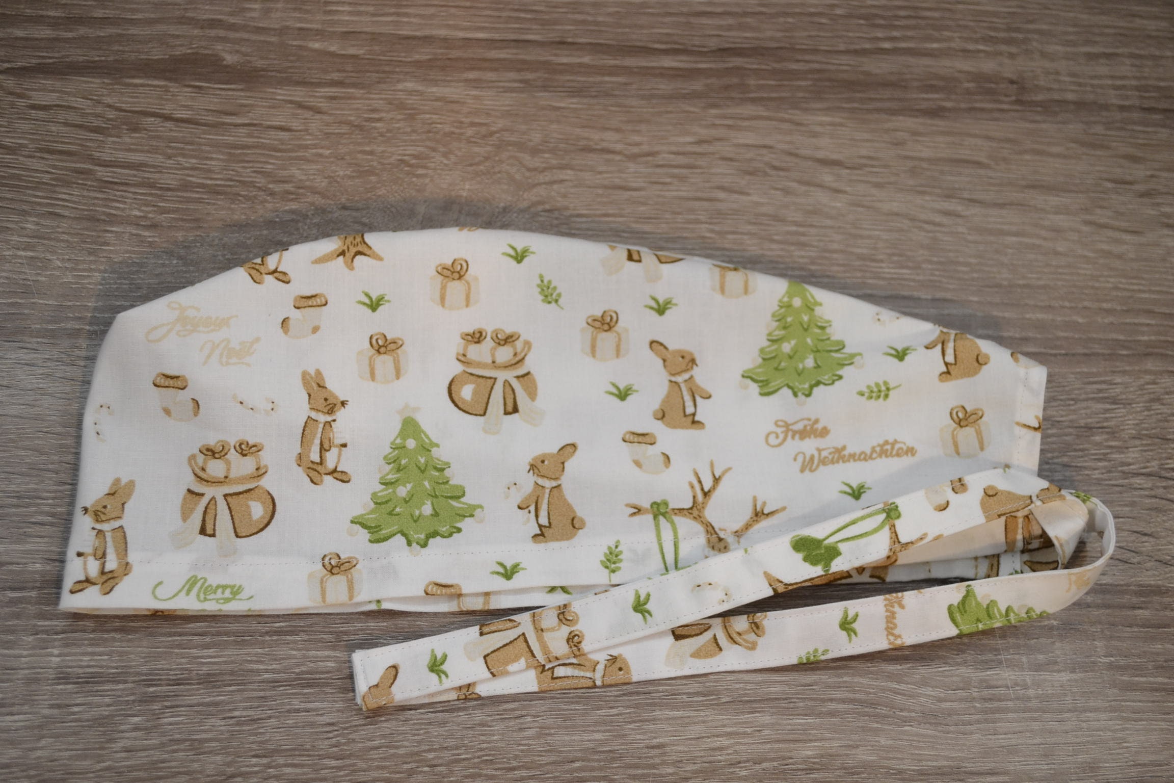 Surgical cap winter forest terry cloth band, scrub cap, bandana, cosmetic cap, peeling cap, beige with Christmas tree and rabbits, surgical caps Christmas,