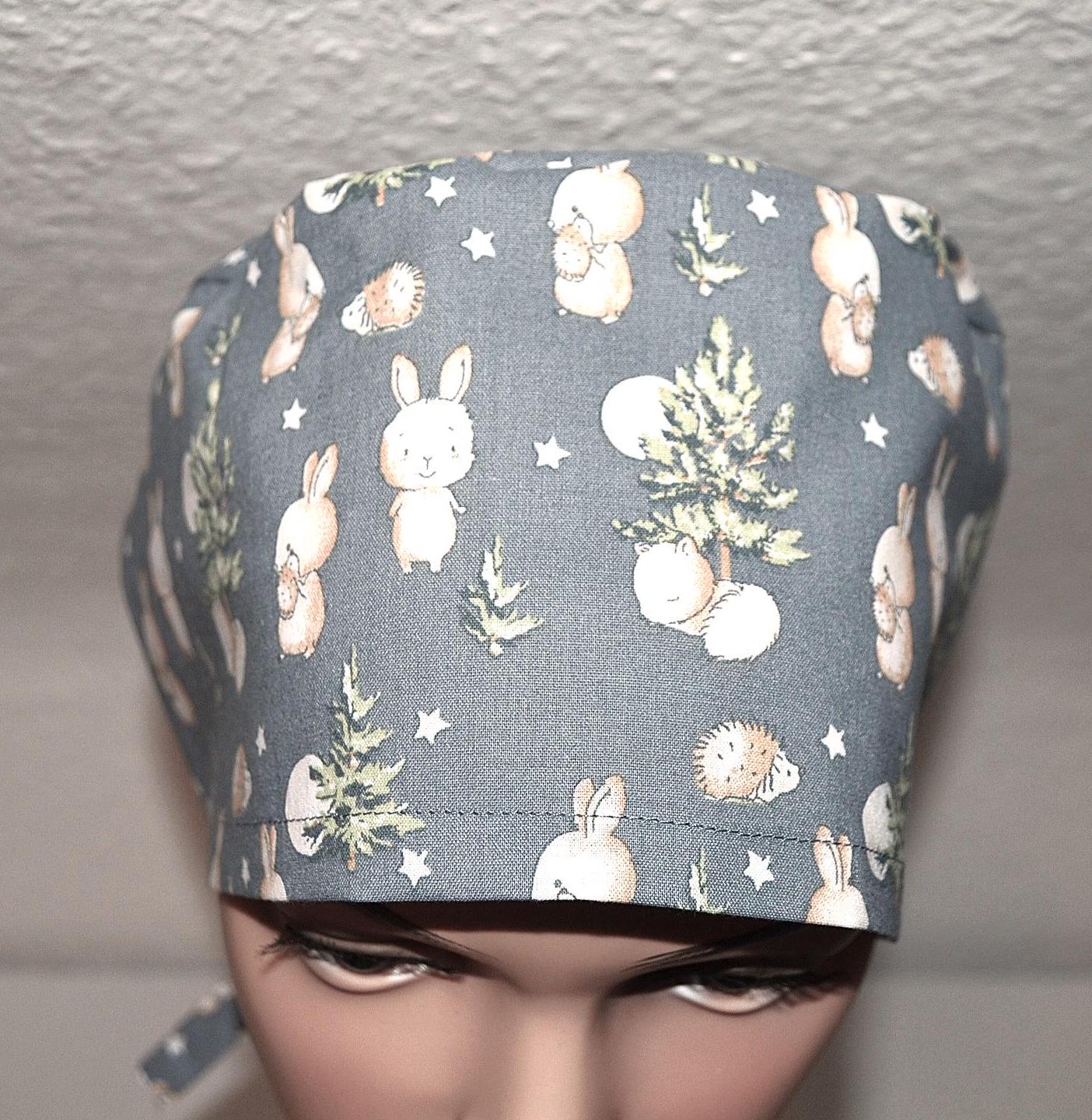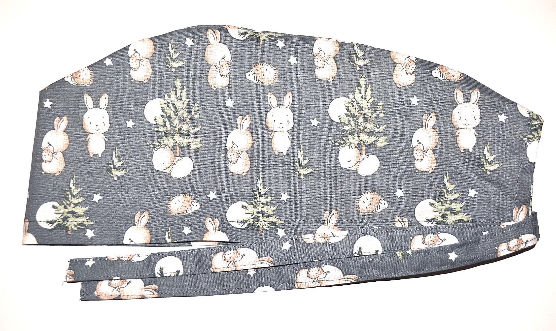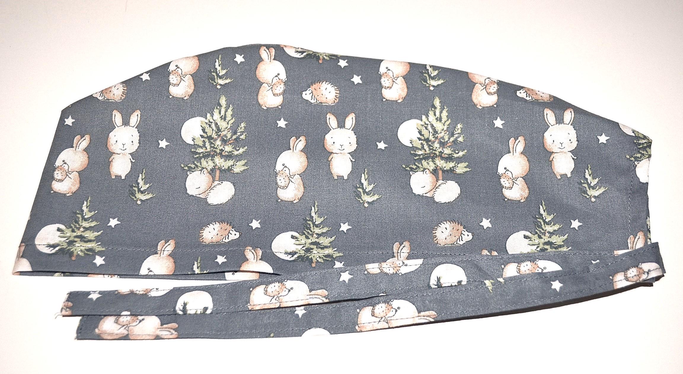 Surgical cap rabbit terry cloth band, scrub cap, bandana, cosmetic cap, chef's hat, grey with rabbit and hedgehog, surgical caps Christmas, winter forest