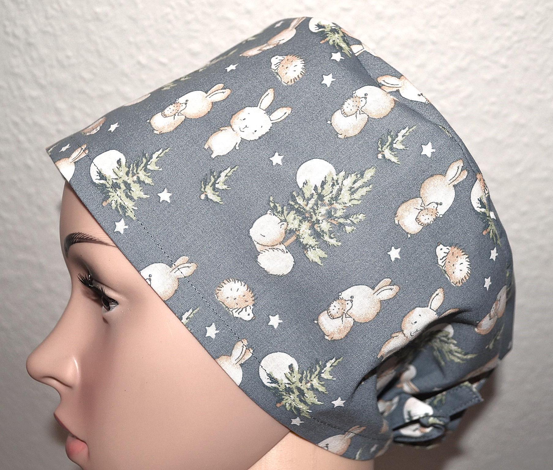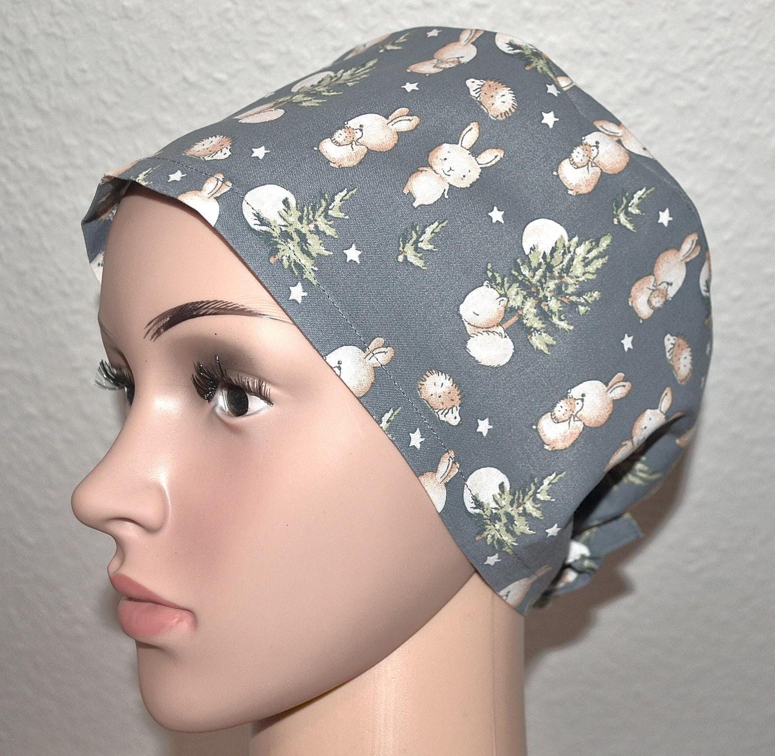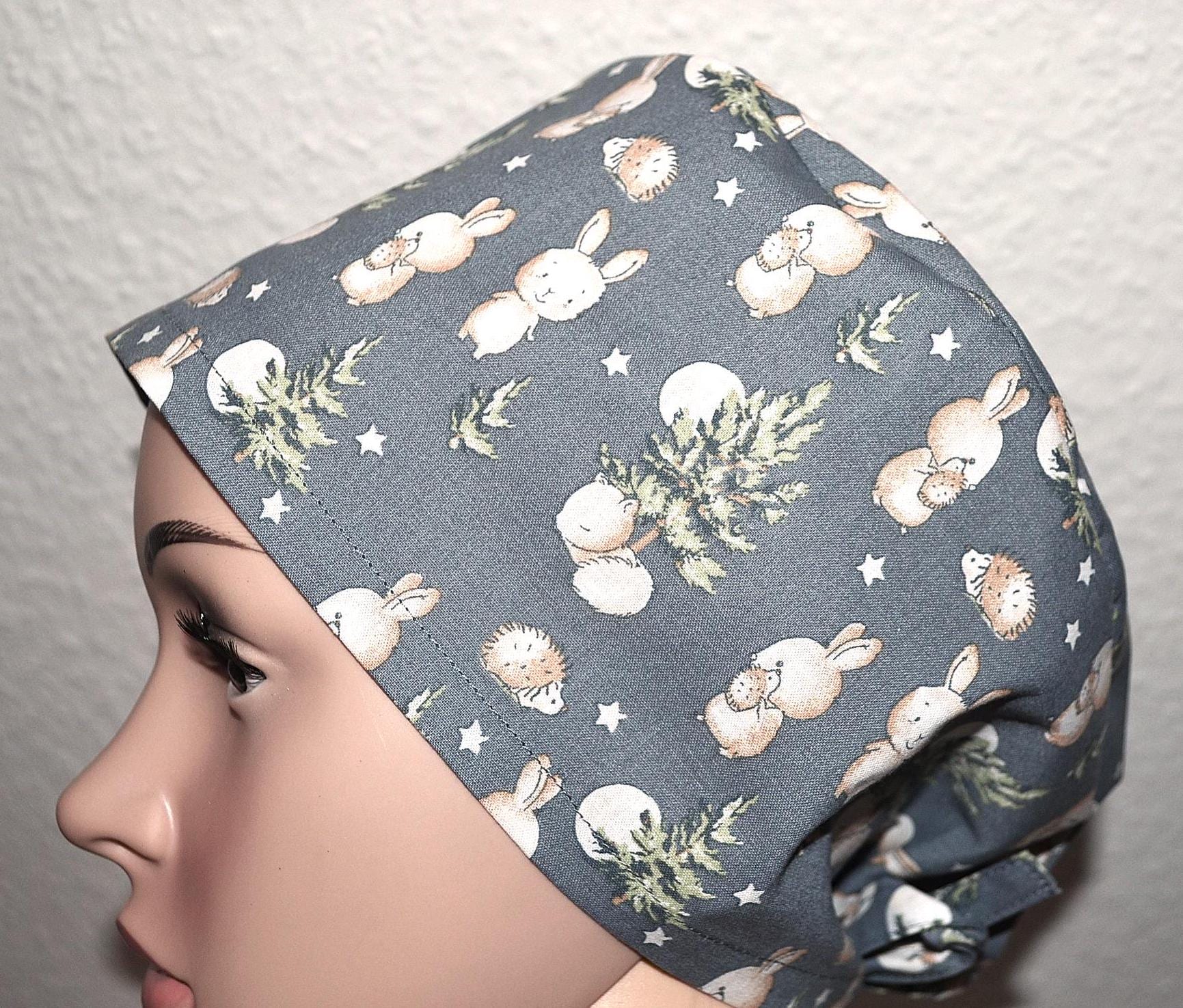 Surgical cap rabbit terry cloth band, scrub cap, bandana, cosmetic cap, chef's hat, grey with rabbit and hedgehog, surgical caps Christmas, winter forest