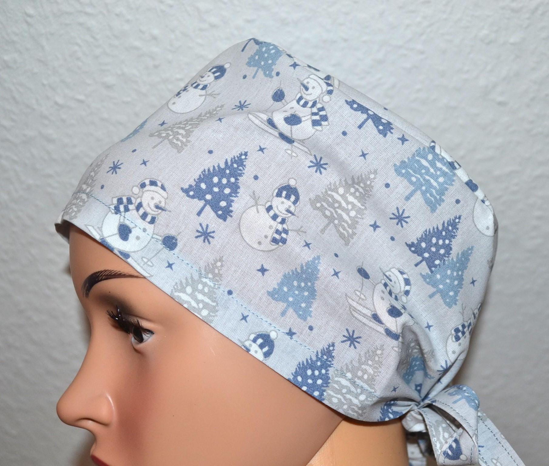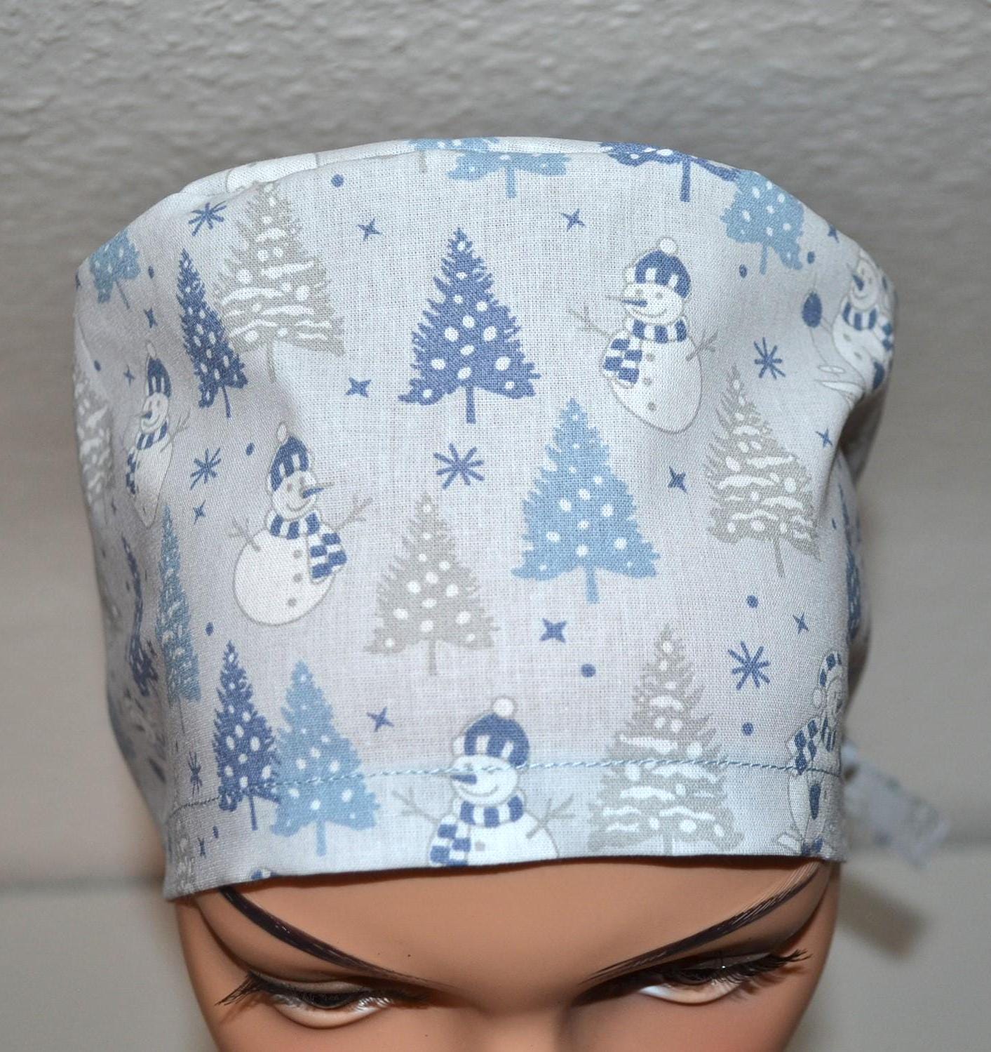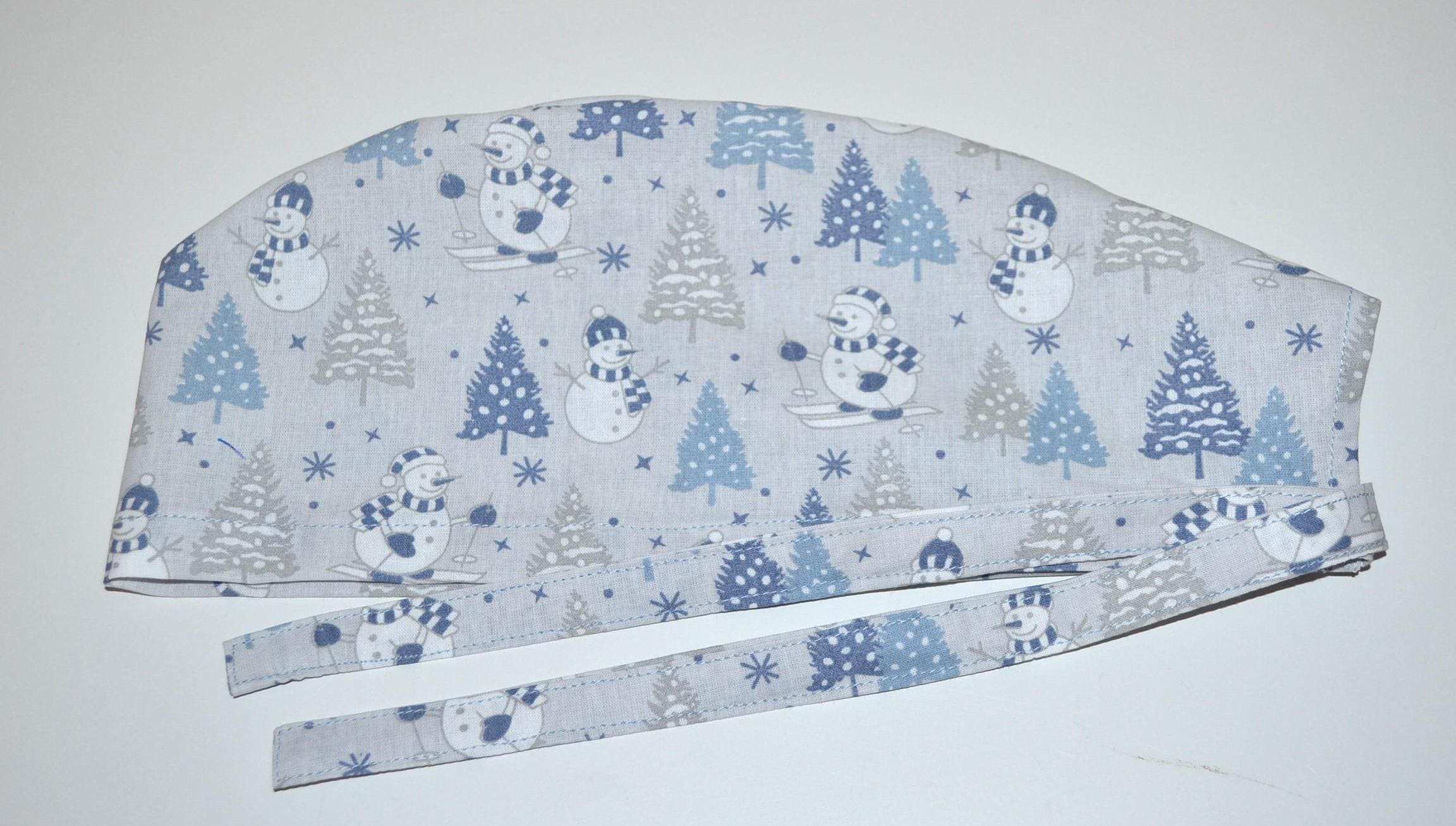 Surgical cap with snowman design, scrub cap, bandana, cosmetic cap, chef's hat, light blue with Christmas tree/snowman, Christmas surgical caps, winter forest