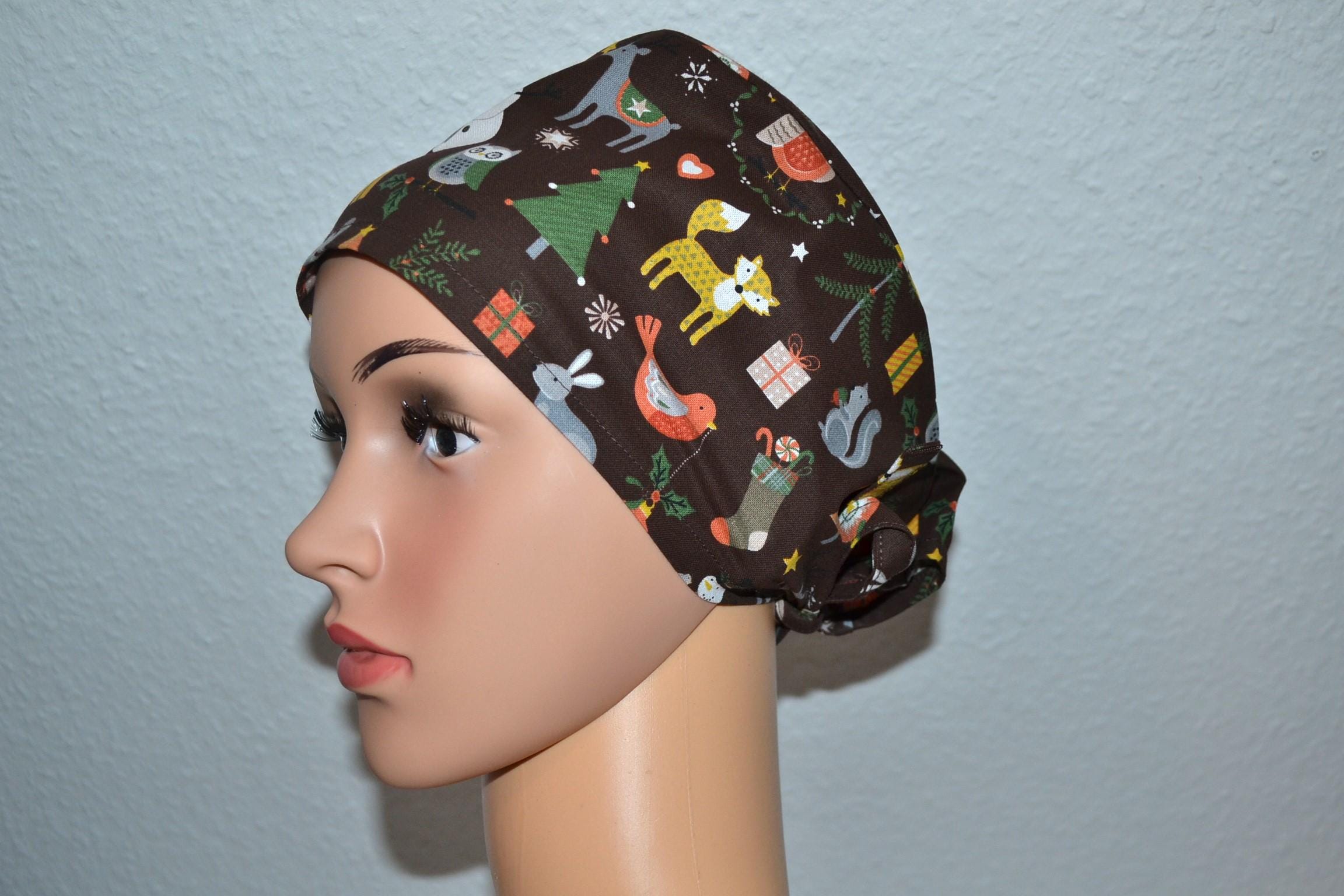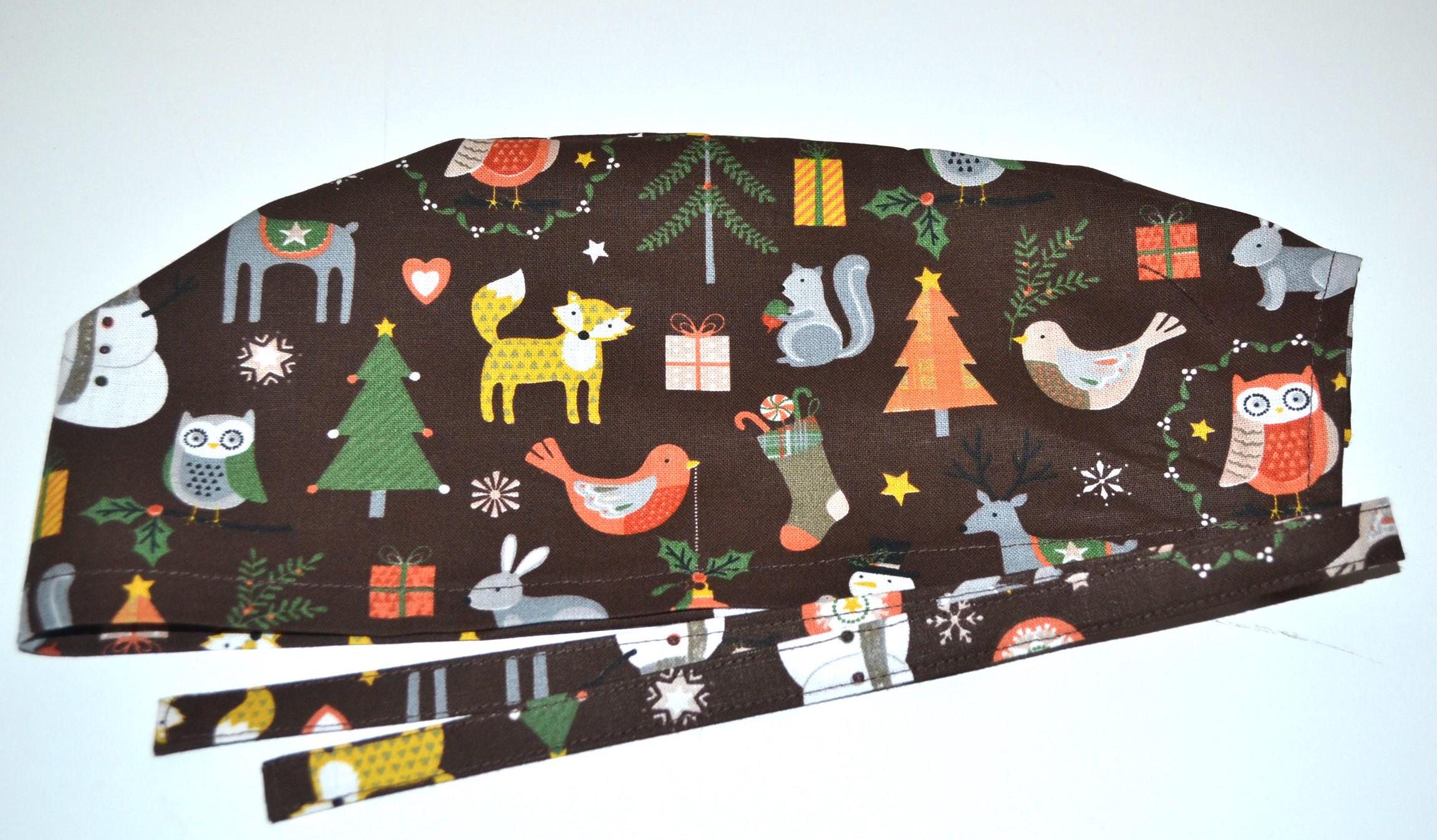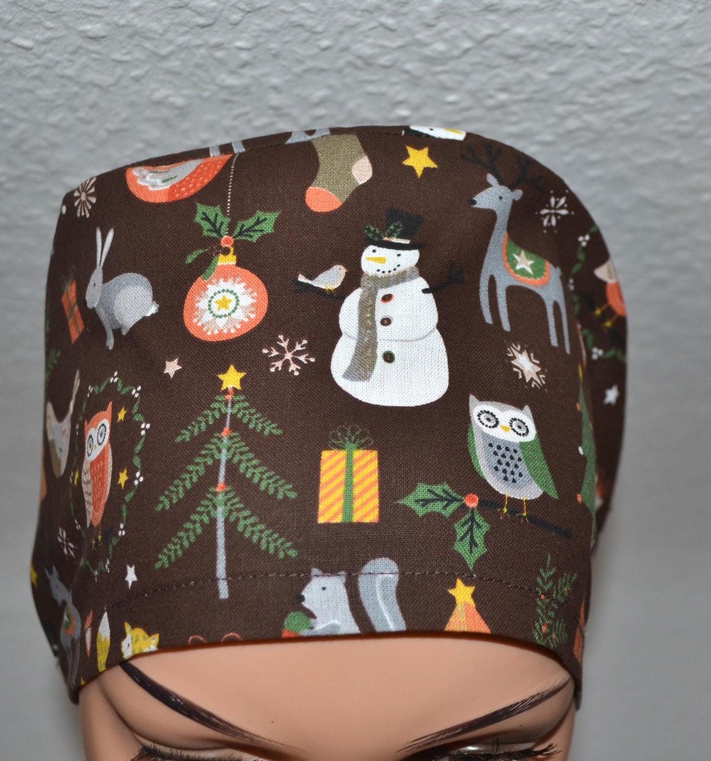 Surgical cap with winter animals, scrub cap, bandana, cosmetic cap, chef's hat, brown with forest animals, Christmas surgical caps, bear cap, Christmas tree