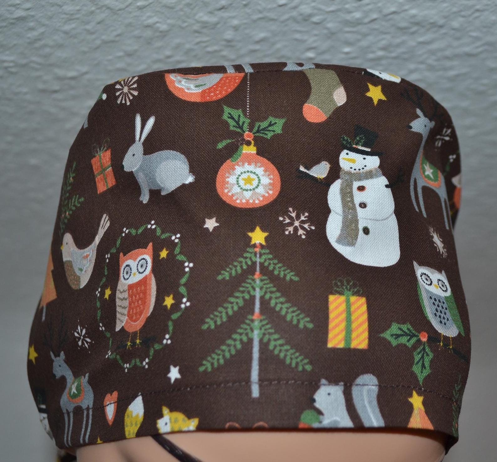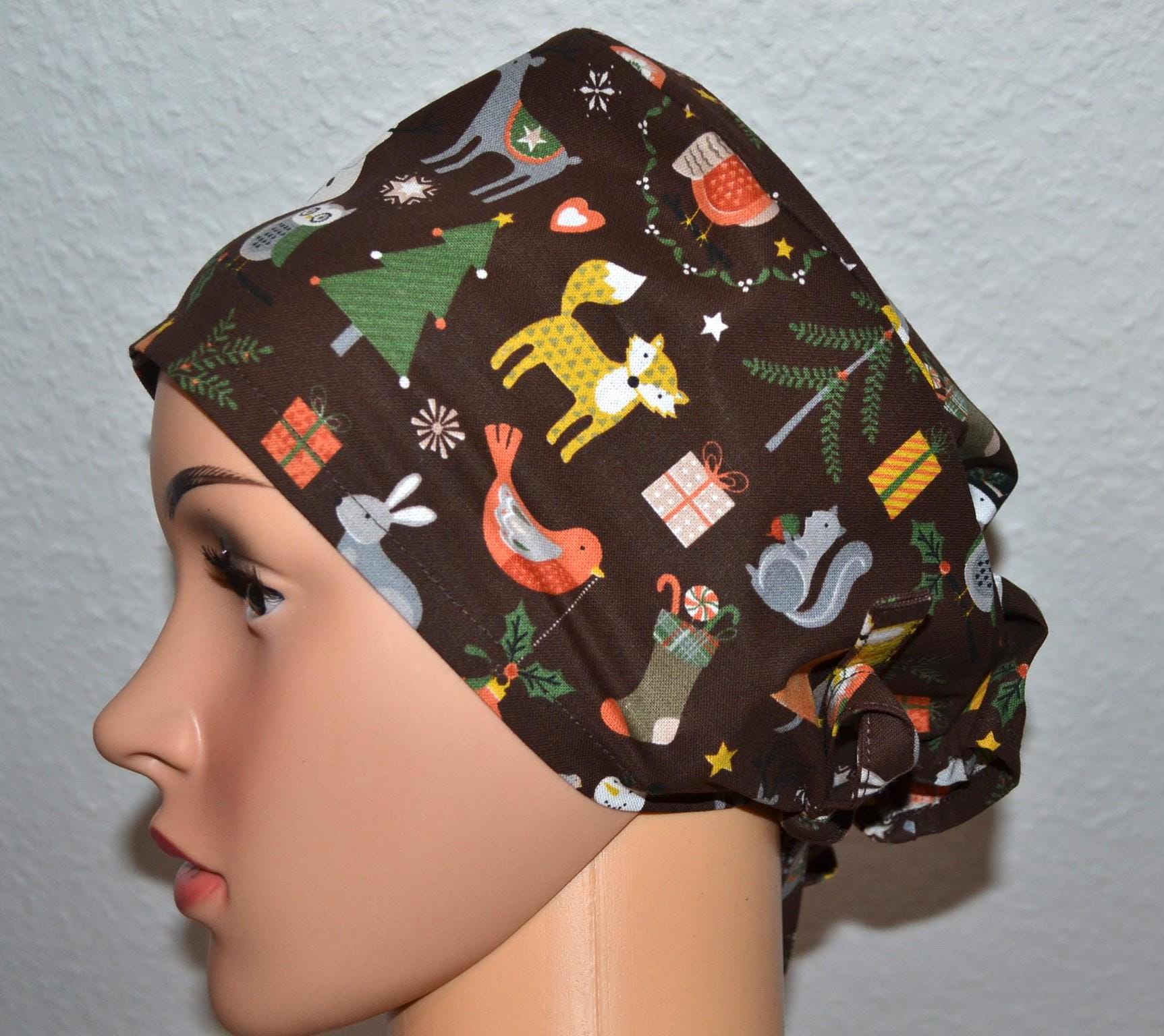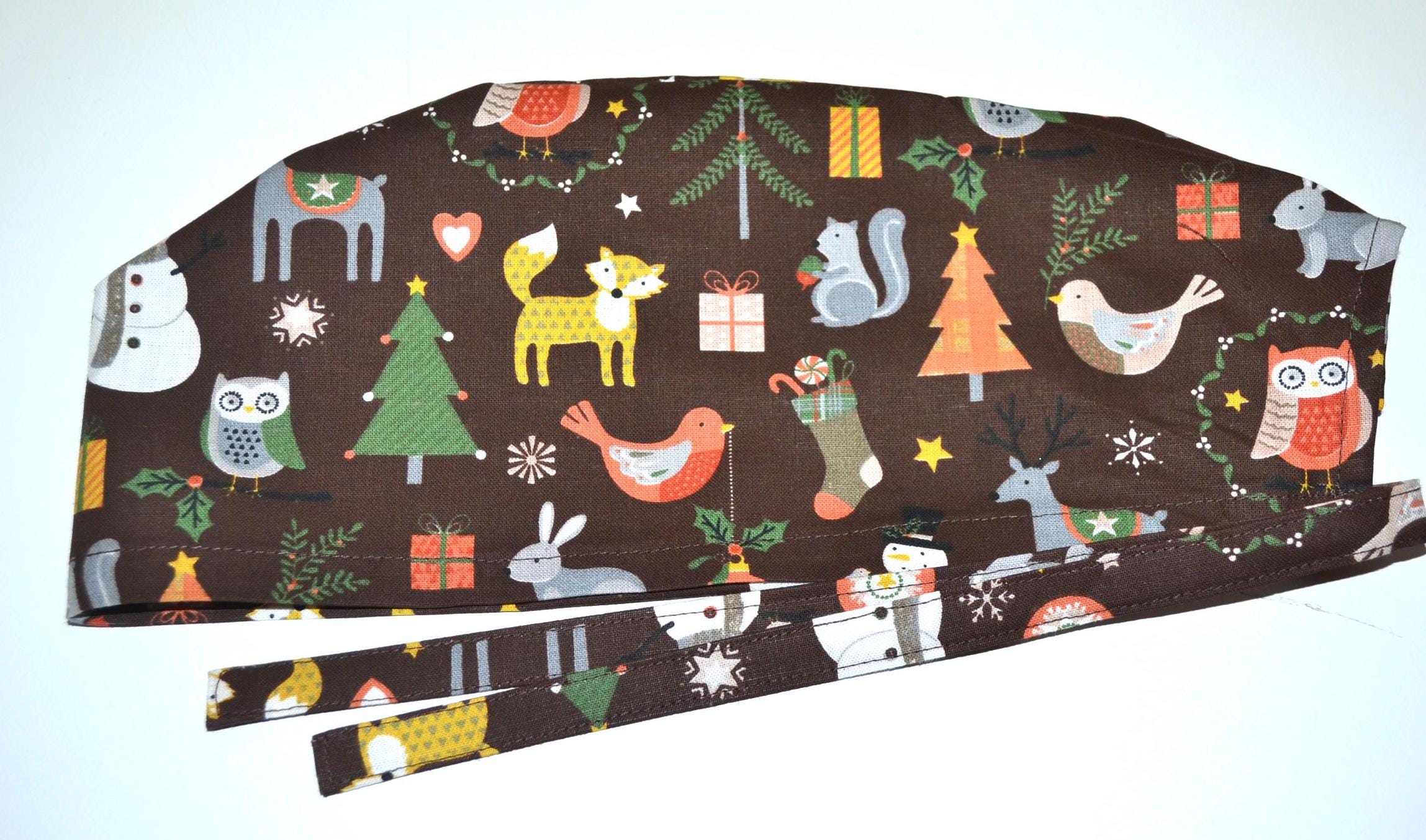 Surgical cap with winter animals, scrub cap, bandana, cosmetic cap, chef's hat, brown with forest animals, Christmas surgical caps, bear cap, Christmas tree