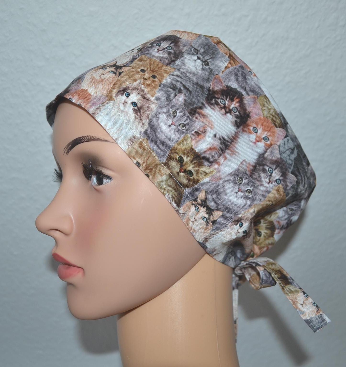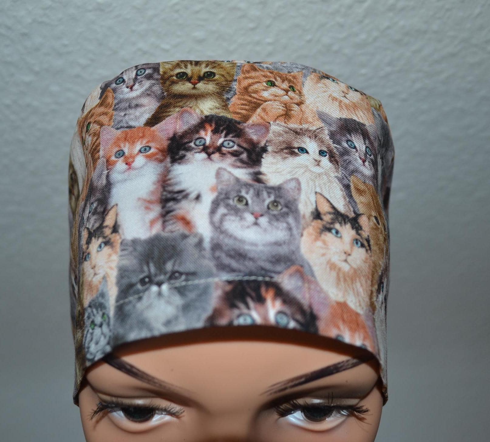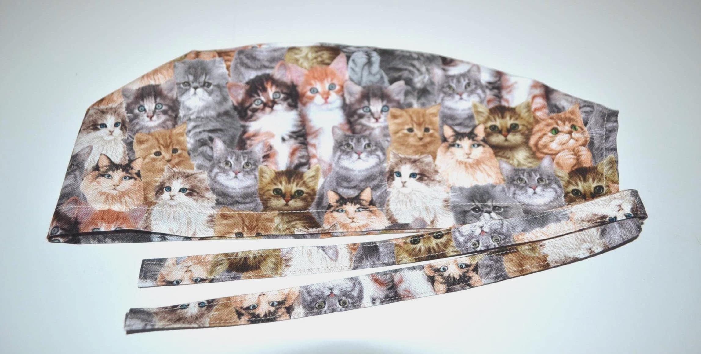 OP-Haube Katze mit Frotteeband, Scrub Cap, Bandana , Peelingmütze, Kochhaube, Kosmetikhaube, OP-Hauben, beige mit Katzen, Katzenhaube