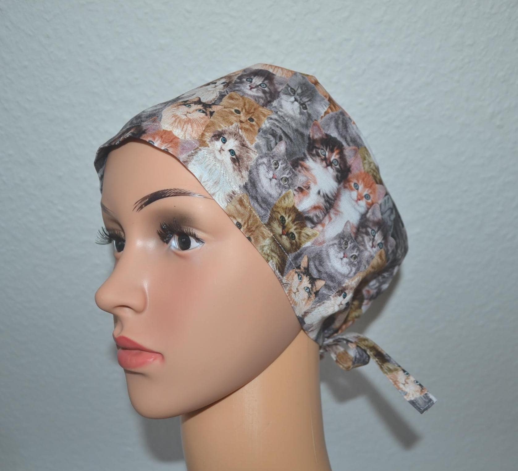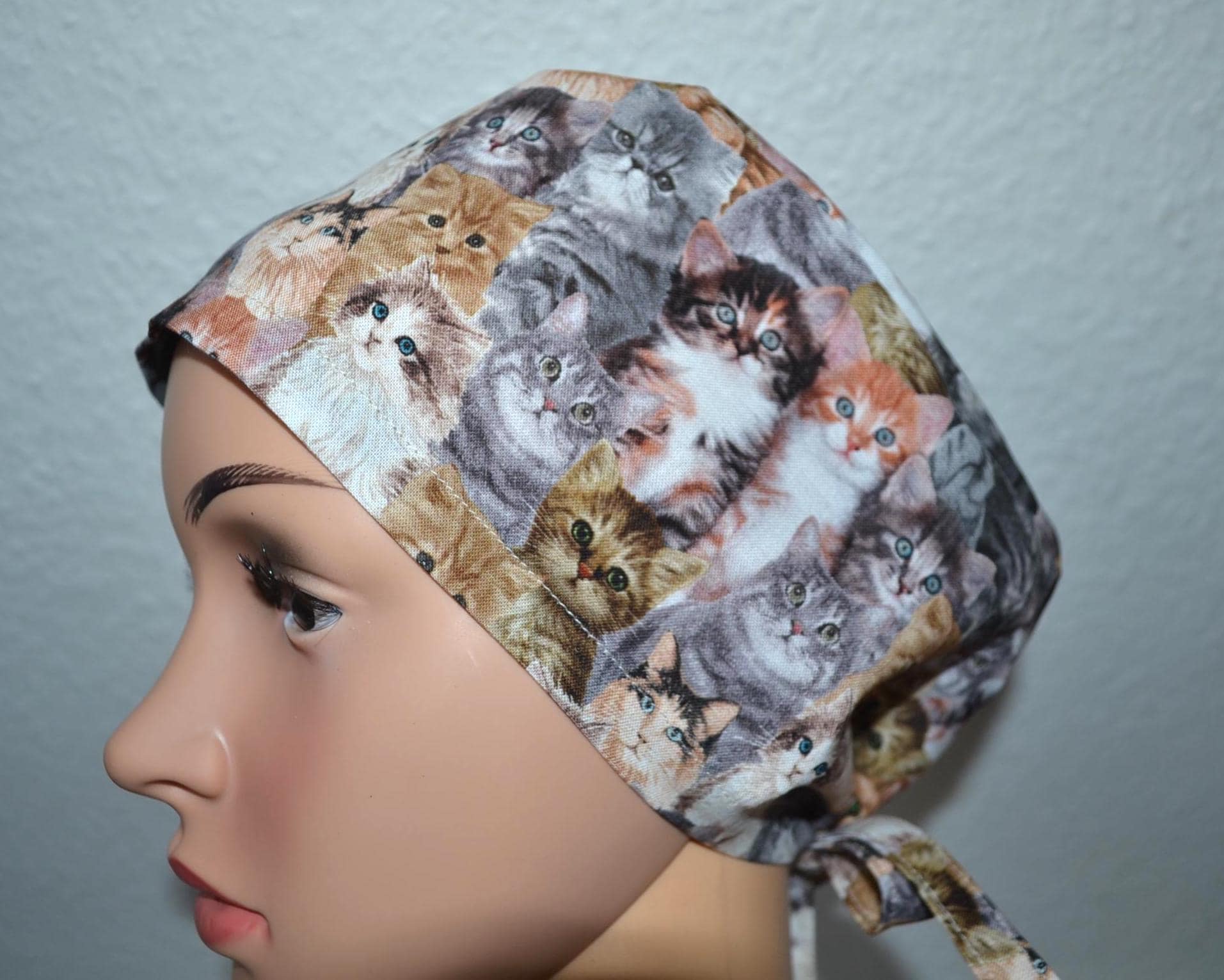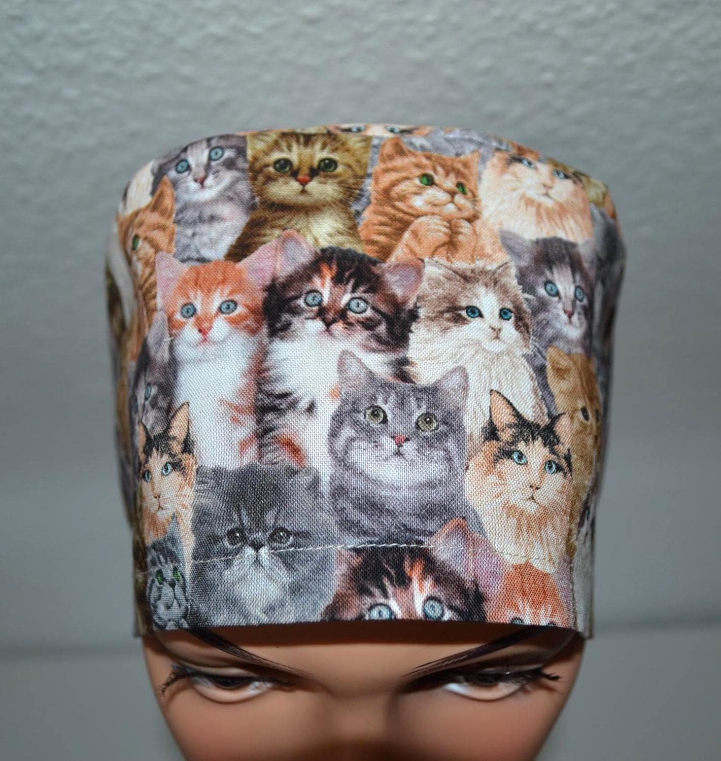 OP-Haube Katze mit Frotteeband, Scrub Cap, Bandana , Peelingmütze, Kochhaube, Kosmetikhaube, OP-Hauben, beige mit Katzen, Katzenhaube