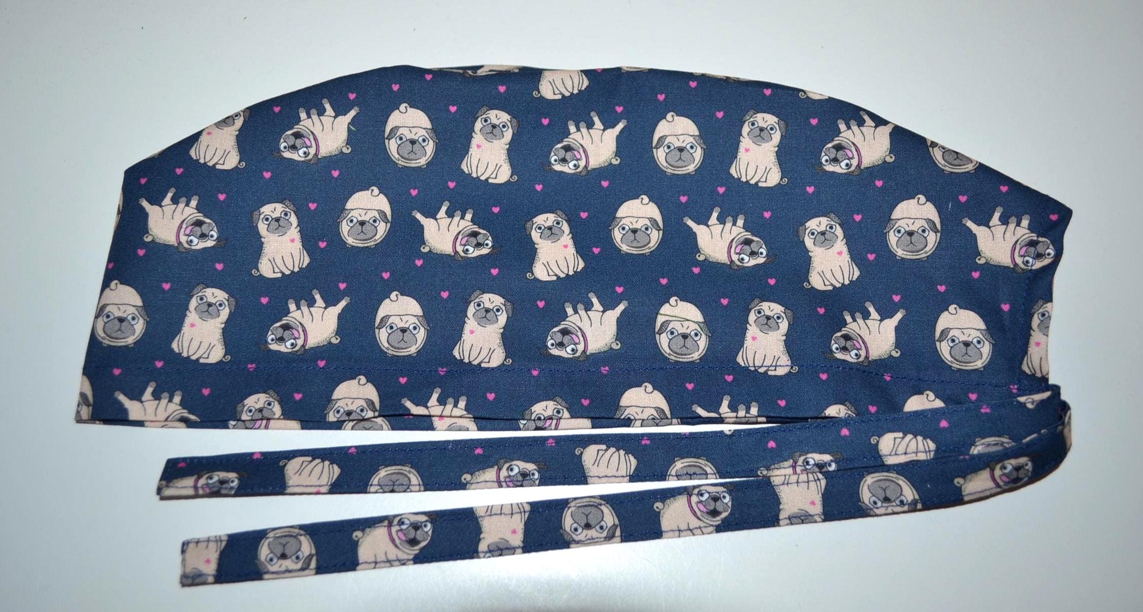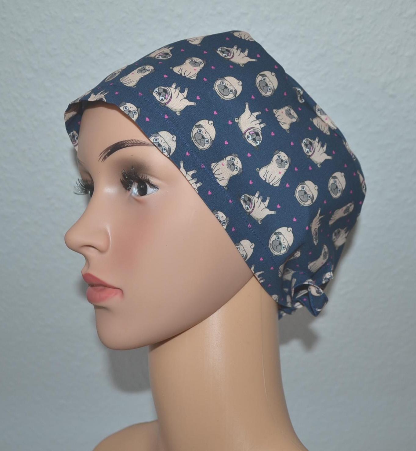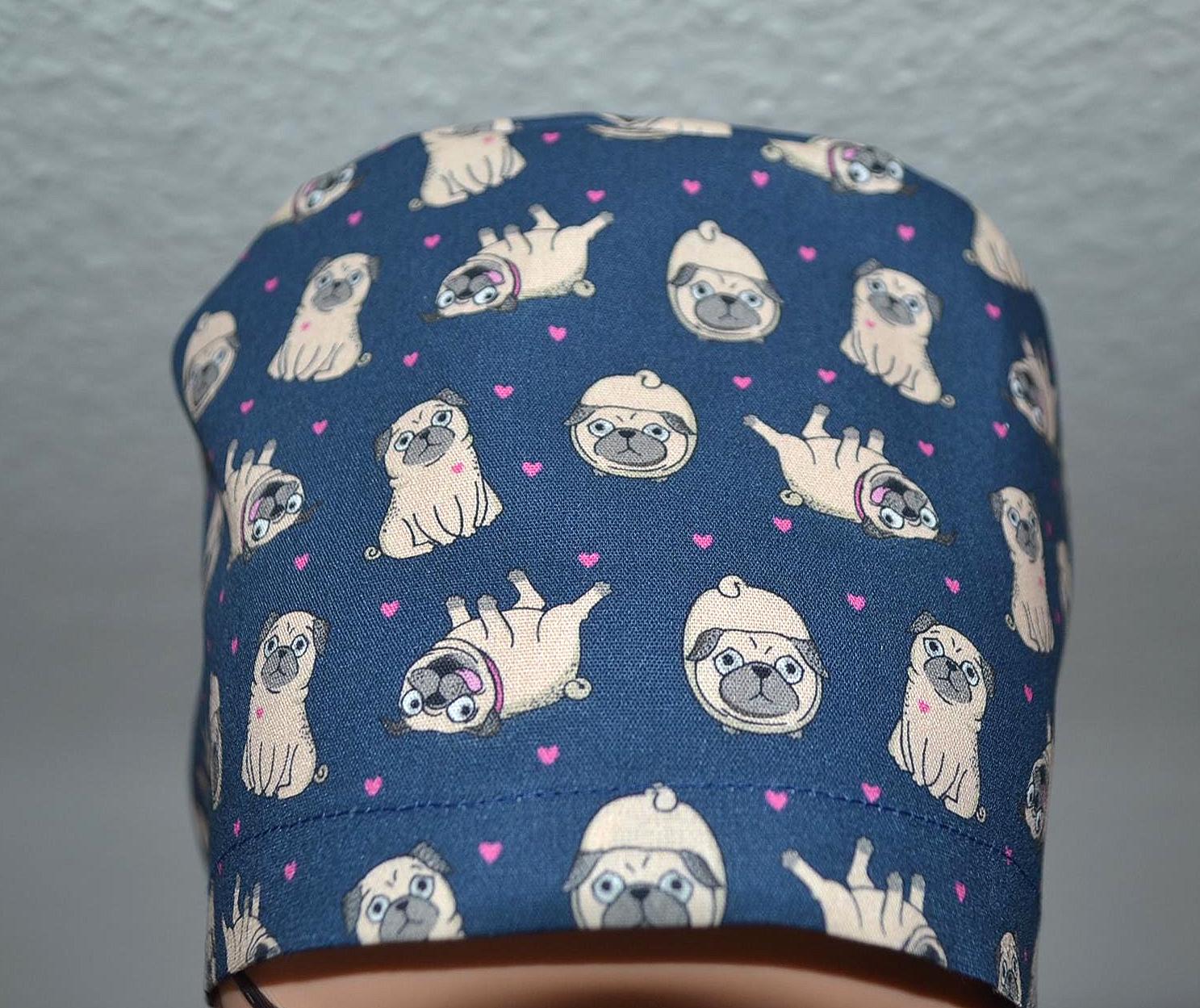 Surgical cap pug terry cloth band, scrub cap, chef's cap, bandana, peeling cap, cosmetic cap, surgical caps, blue with pugs dogs, dog cap, pugs
