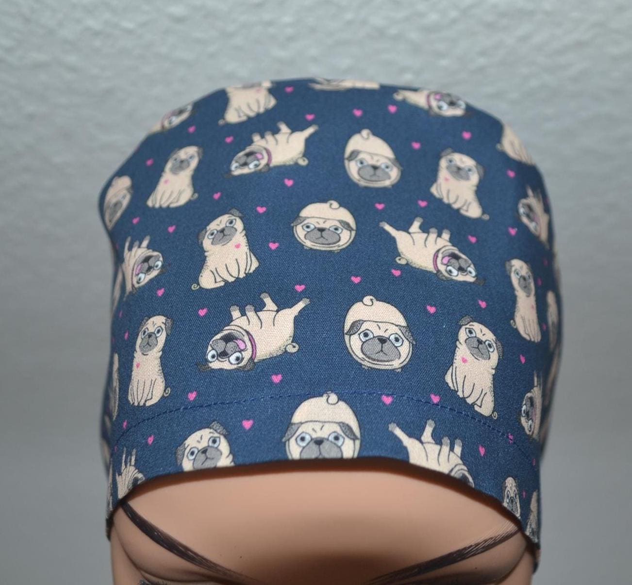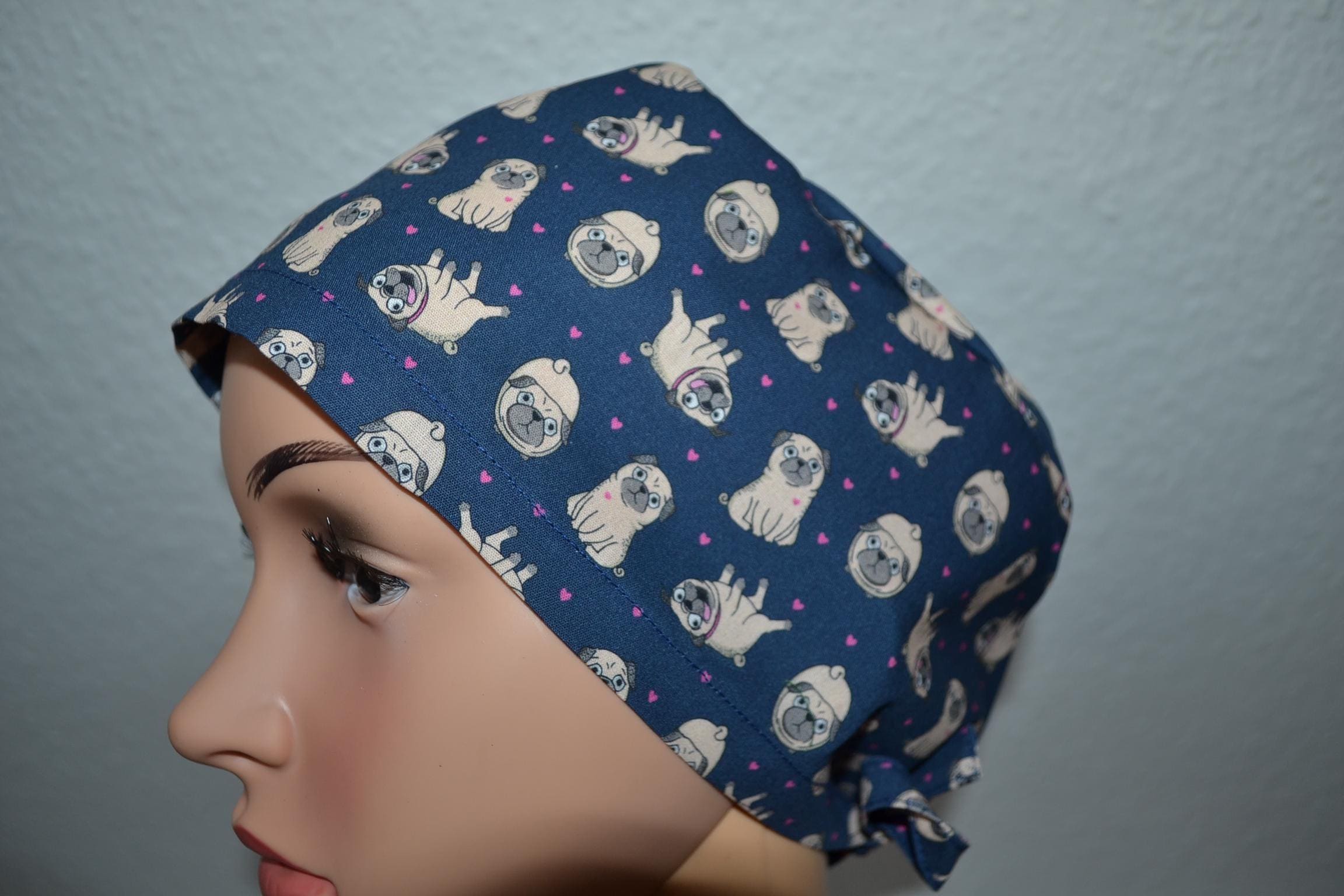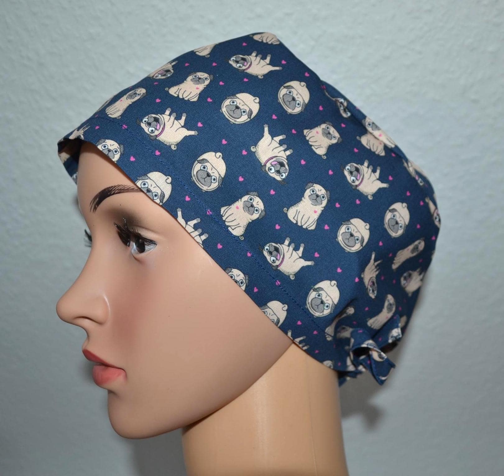 Surgical cap pug terry cloth band, scrub cap, chef's cap, bandana, peeling cap, cosmetic cap, surgical caps, blue with pugs dogs, dog cap, pugs