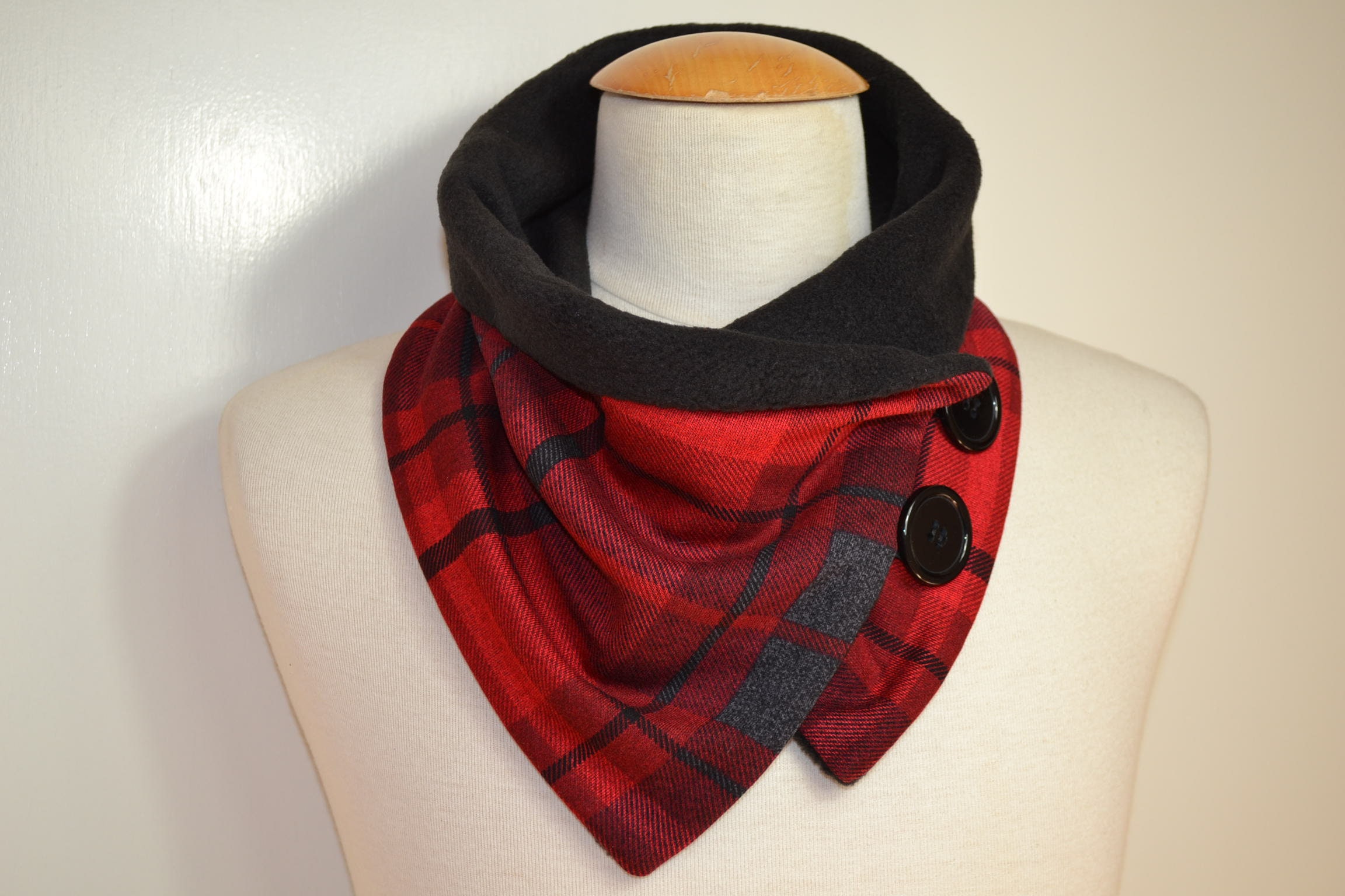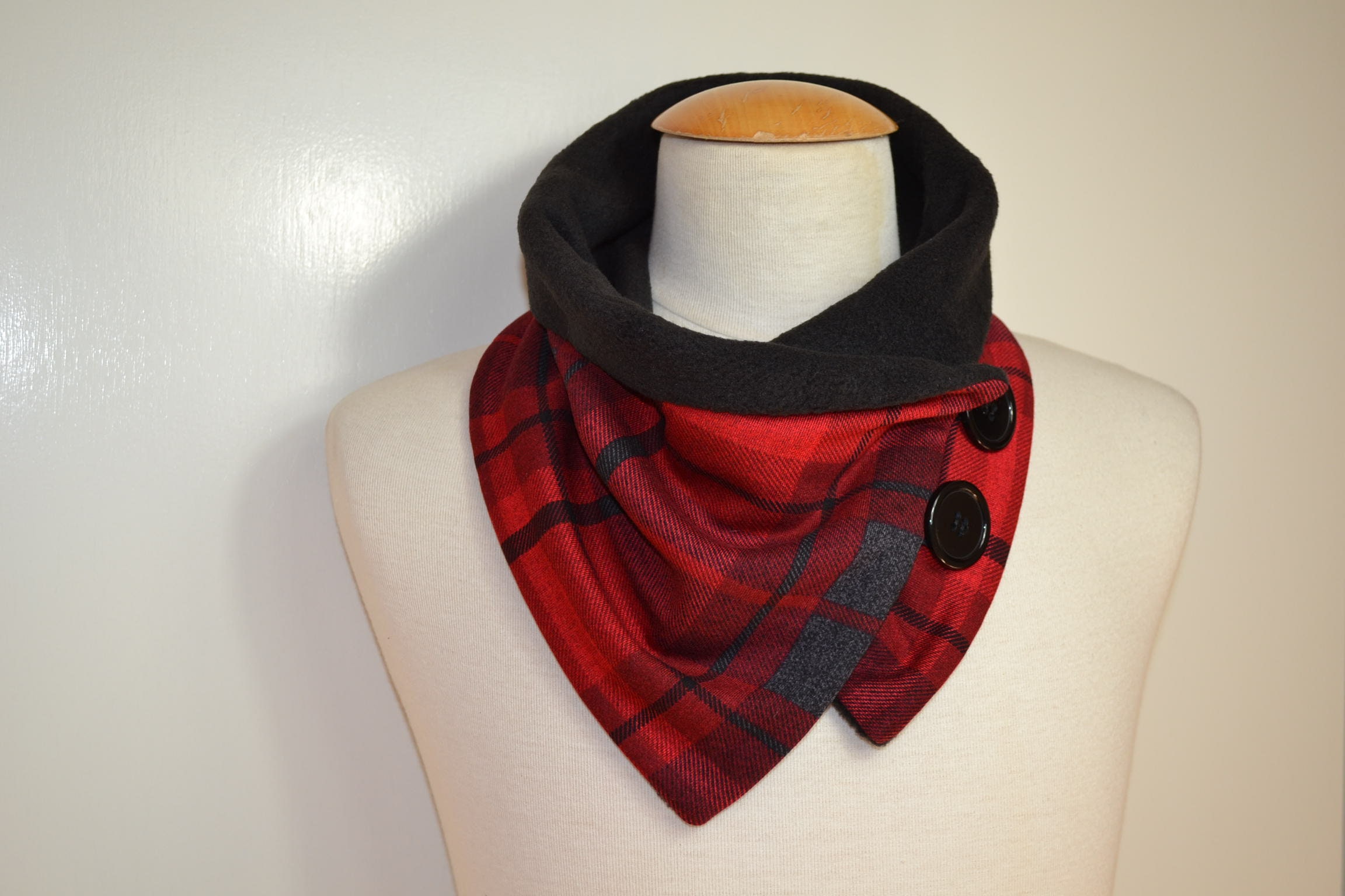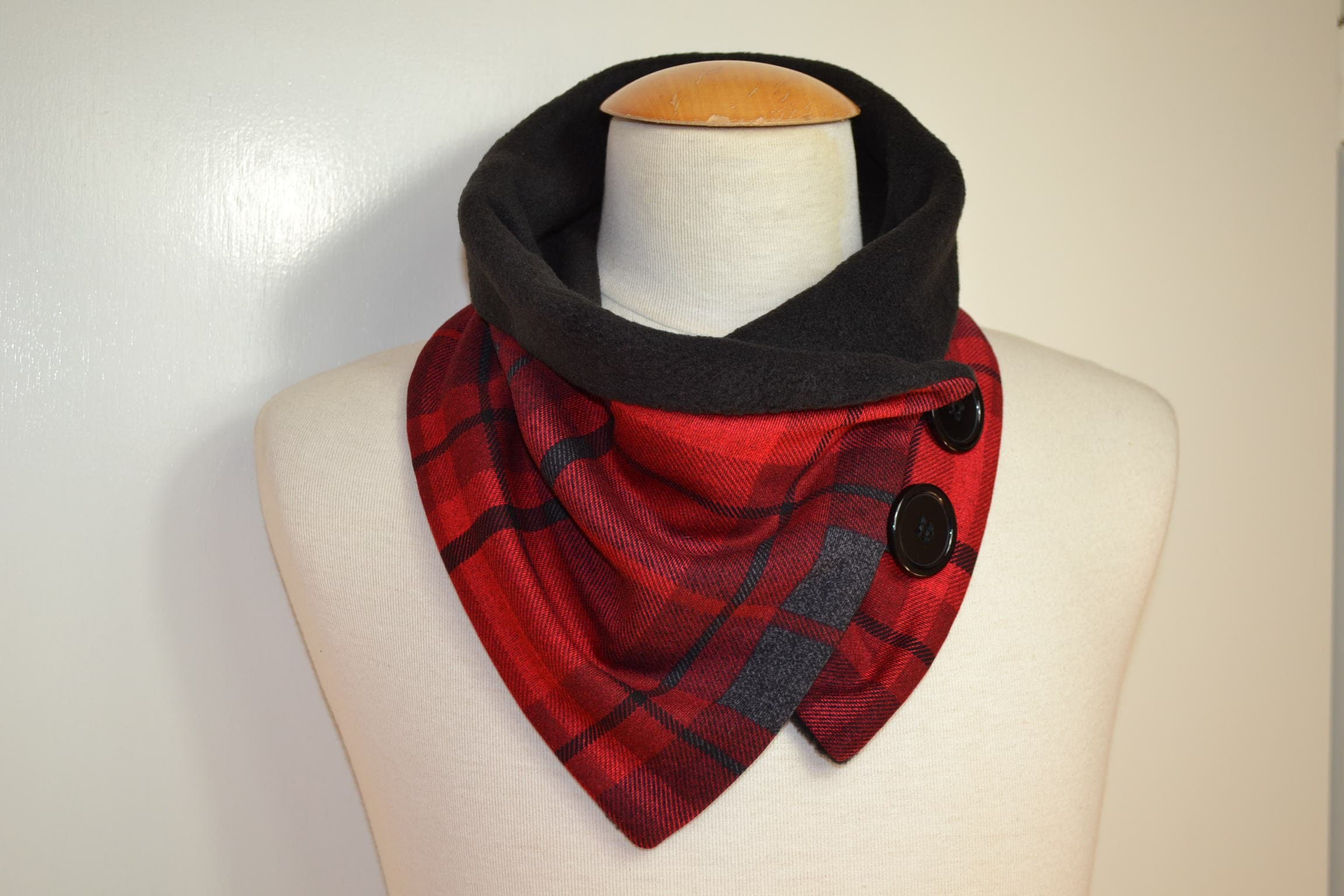 Red plaid button-up loop scarf, loop scarf, scarf, red and black plaid cotton jersey, black fleece, plaid button-up loop scarf, red wrap scarf, button scarf