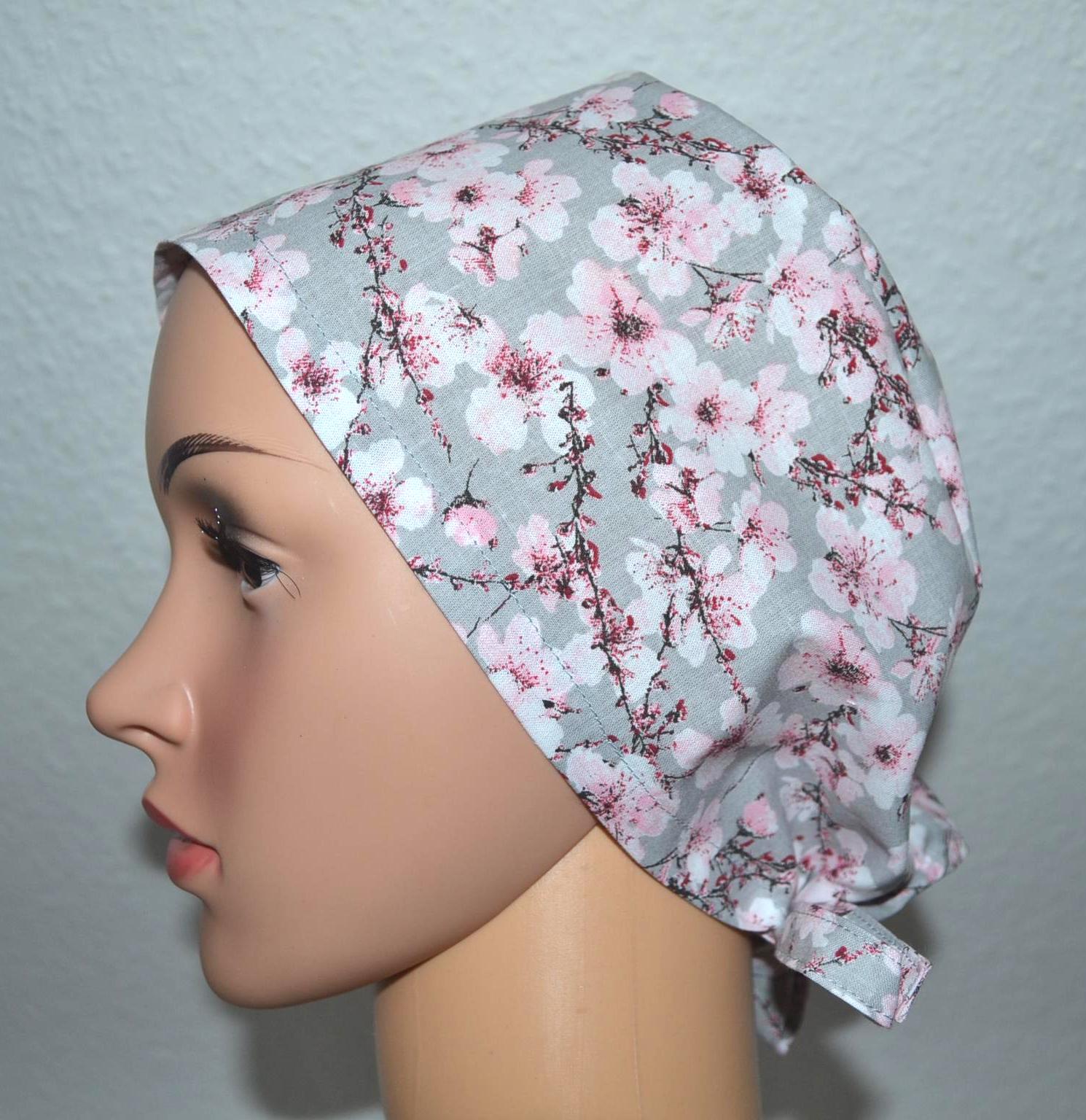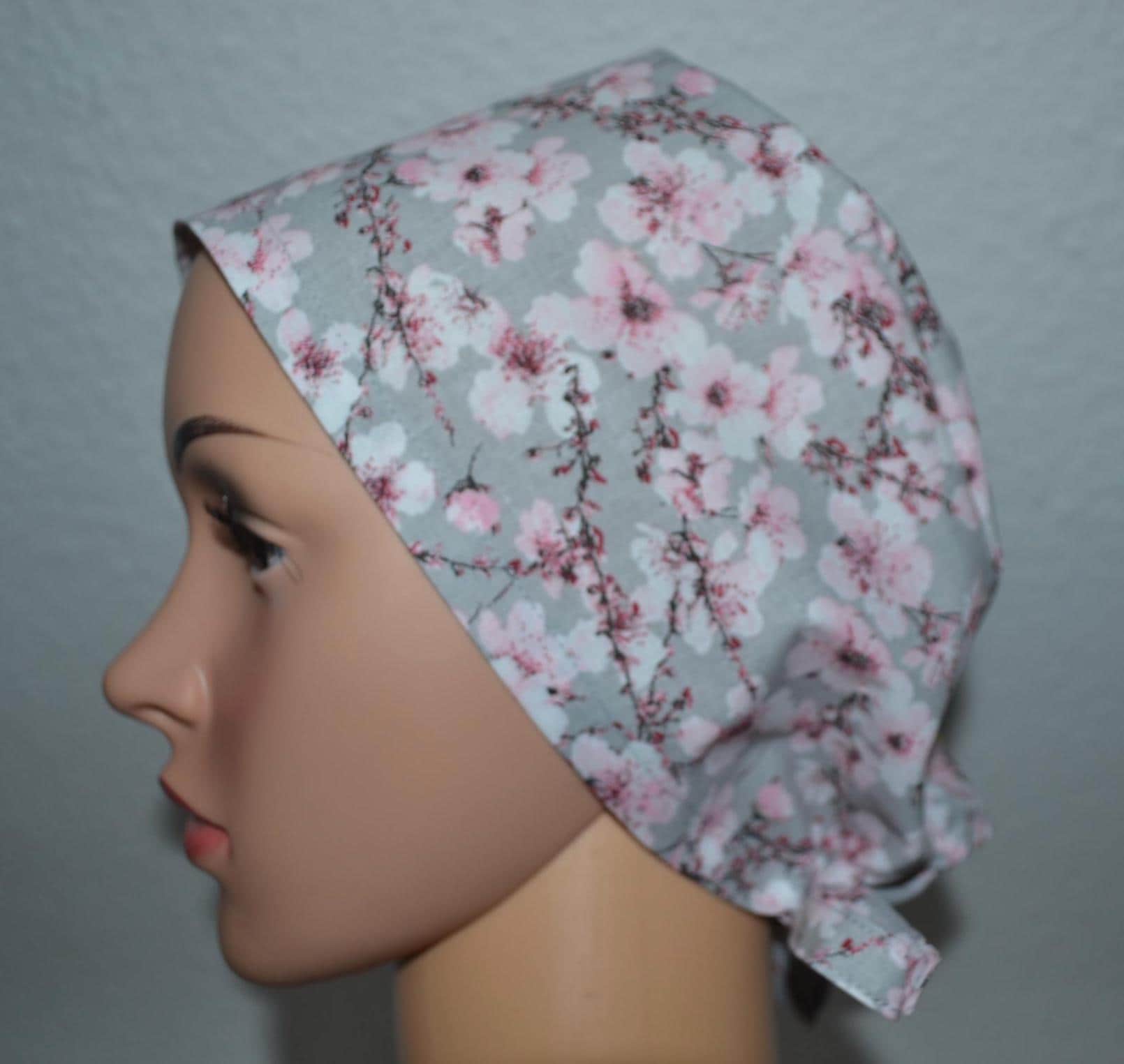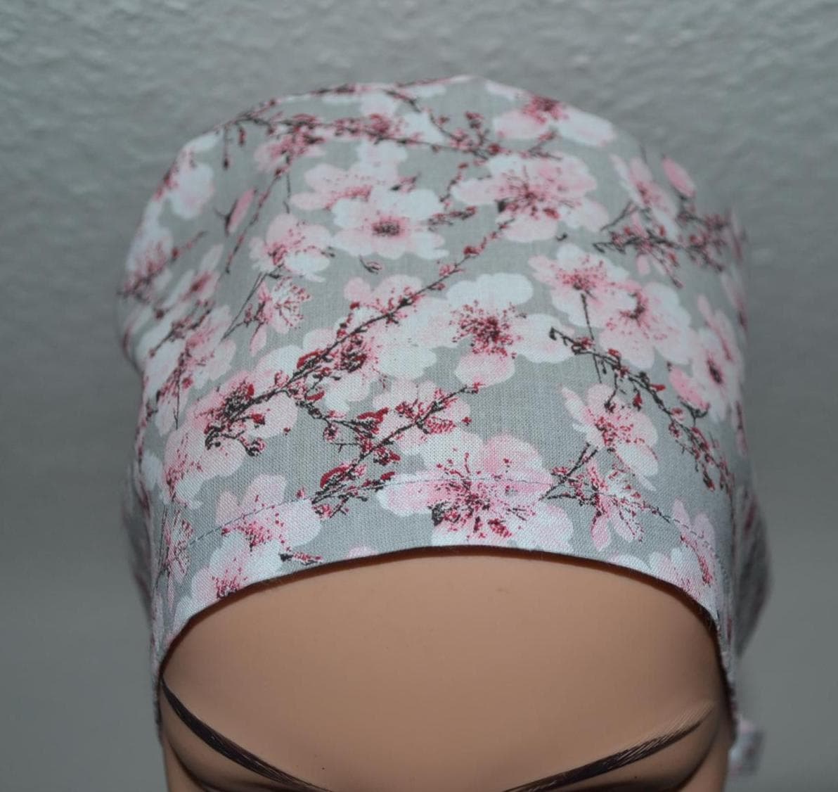 Surgical cap with cherry blossoms, scrub cap, bandana, cosmetic cap, chef's cap, peeling cap, floral cap, grey surgical cap with flowers, almond blossom cap