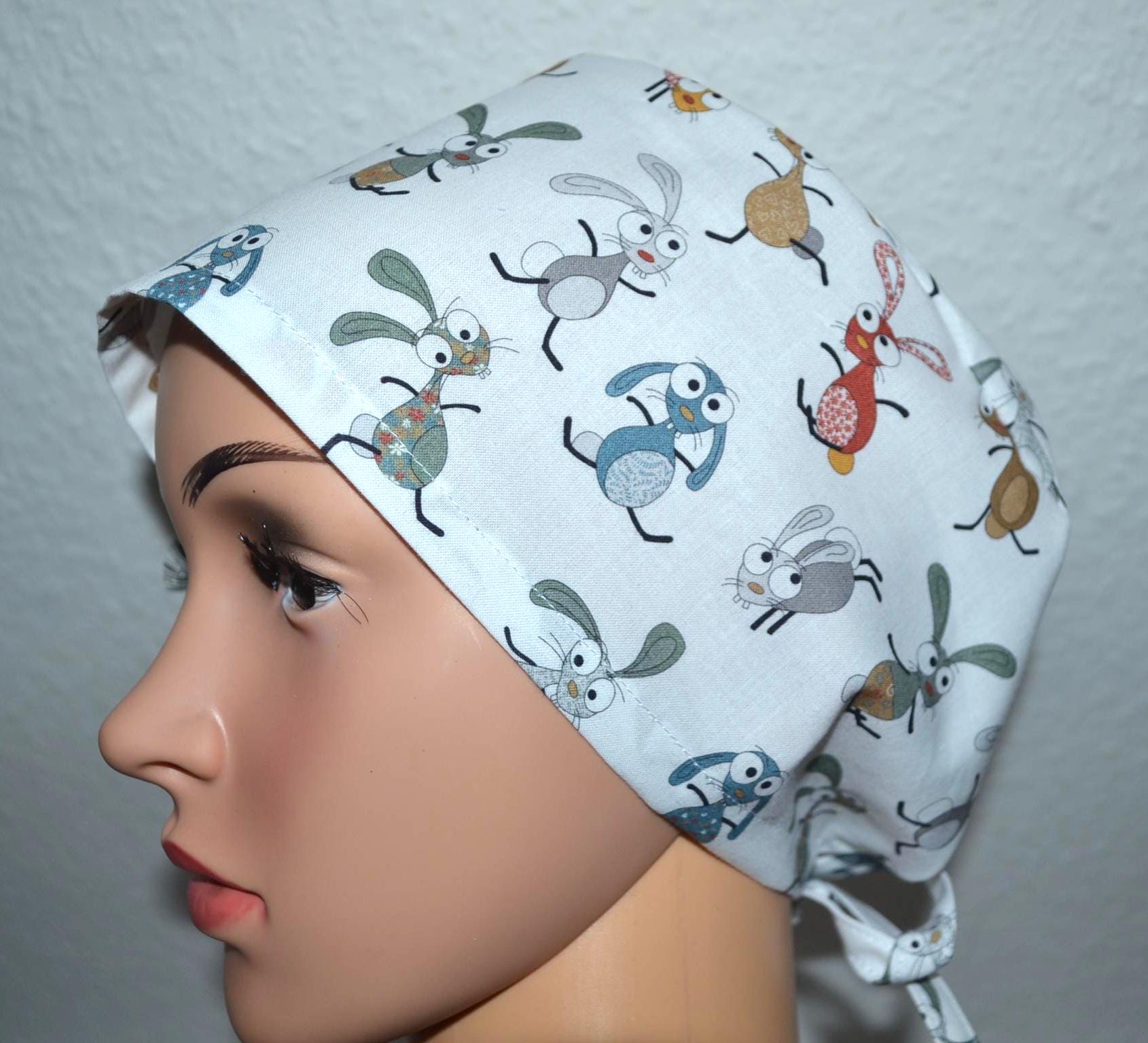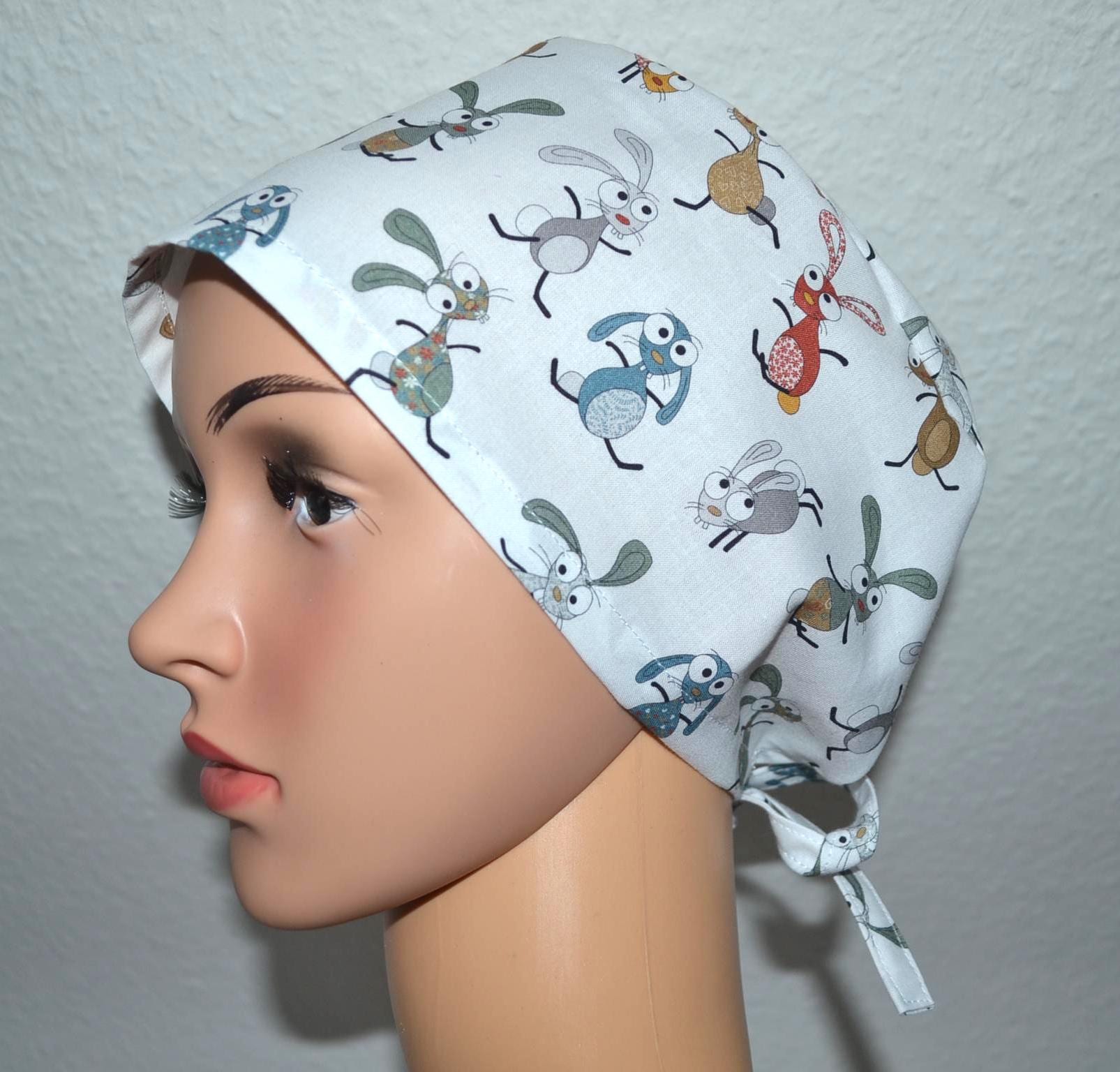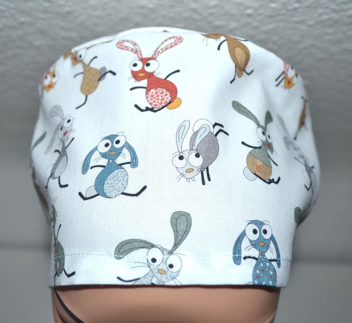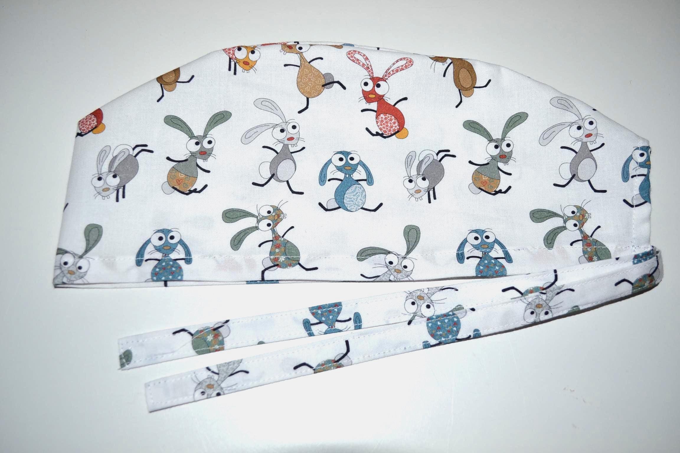 Surgical cap with rabbit design, scrub cap, bandana, cosmetic cap, chef's hat, peeling cap, bunny cap, surgical caps, white surgical cap with crazy bunnies