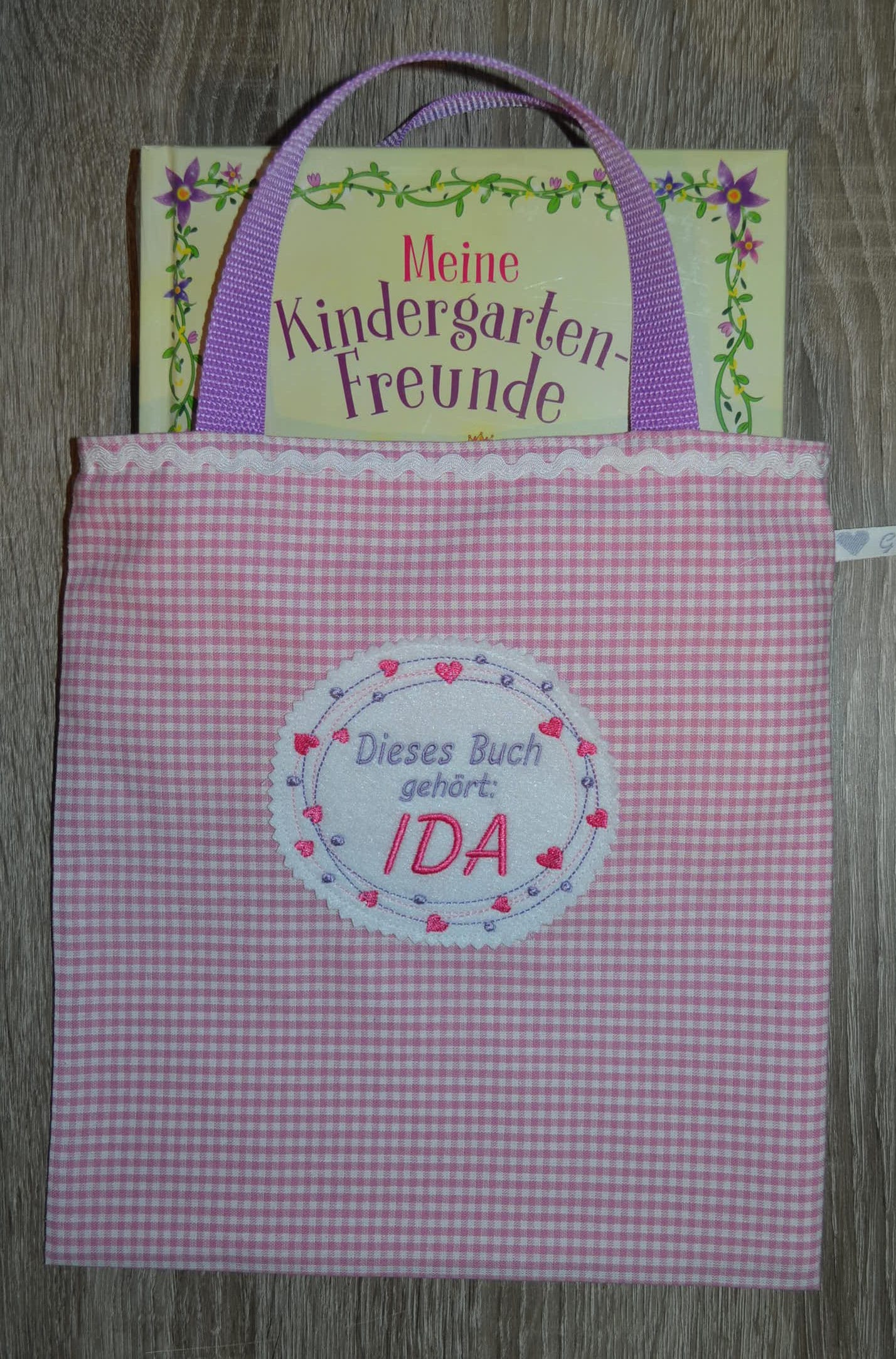 Offered here is a friendship book bag made from environmentally friendly cotton material. A wonderful addition to friendship books and perfectly suited for protection. The bag features a pretty name appliqué.