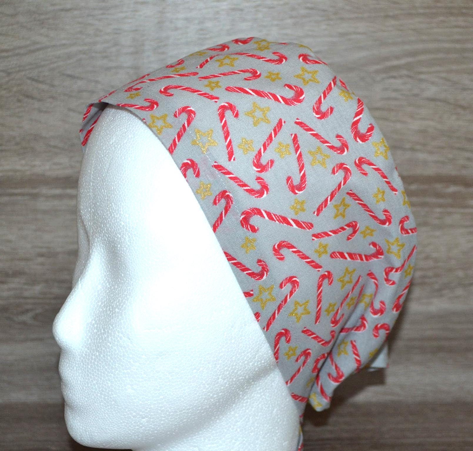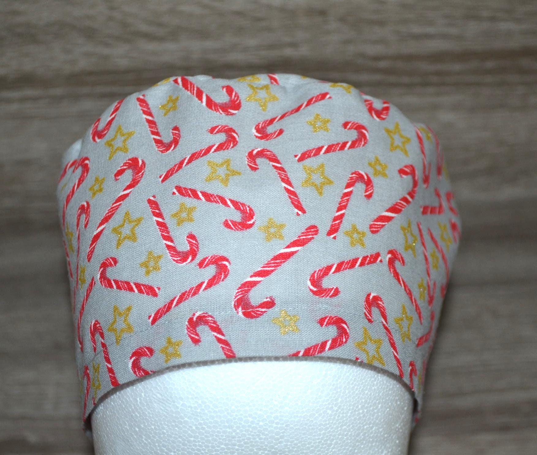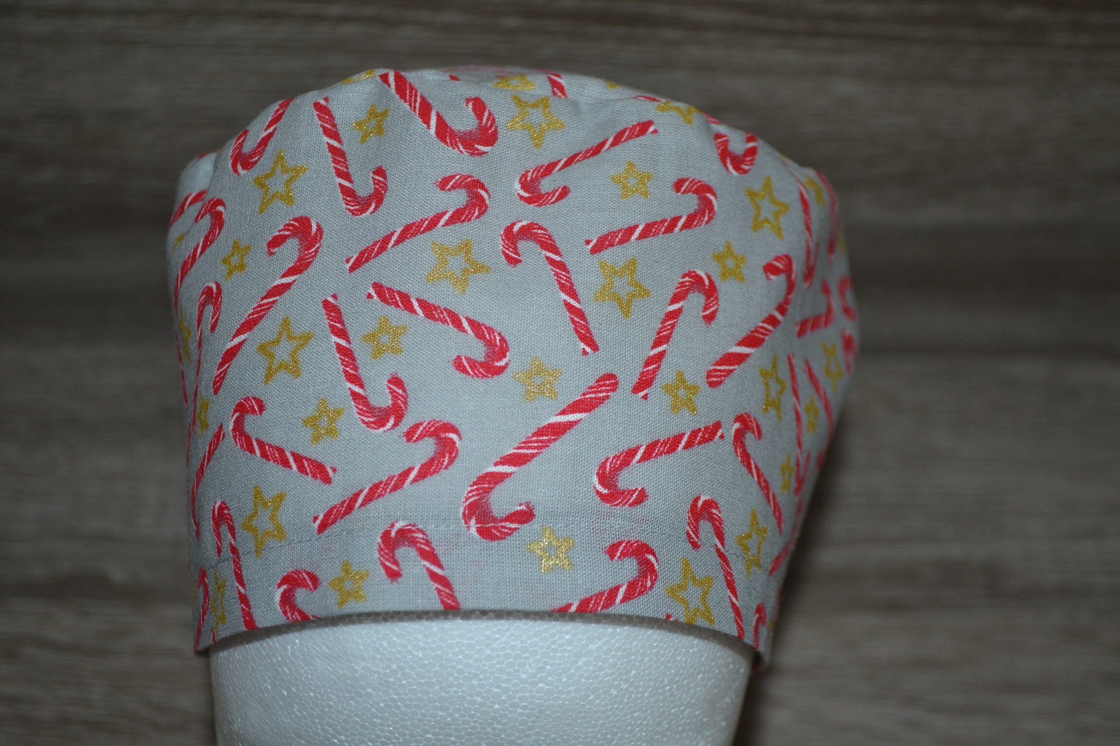 Surgical cap with candy cane design, scrub cap, bandana, cosmetic cap, chef's hat, grey with candy canes, Christmas surgical caps, Christmas cap