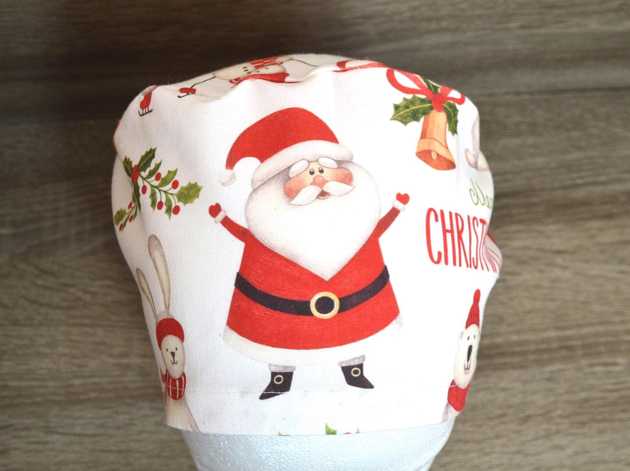 Santa Claus surgical cap, scrub cap, bandana, cosmetic cap, peeling cap, chef's hat, white Merry Christmas, Christmas surgical caps, handmade