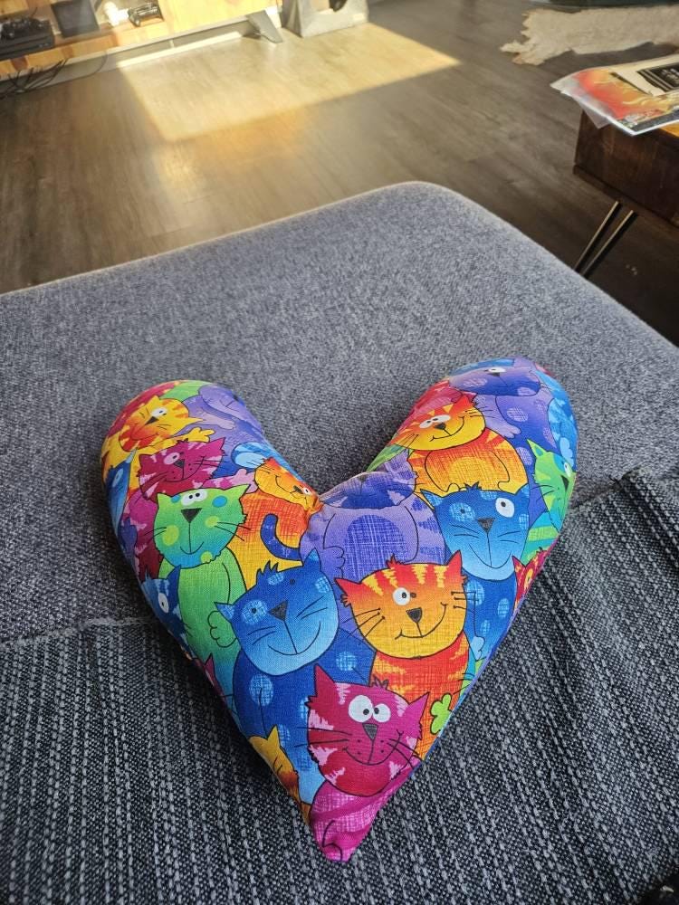 Heart-shaped pillow, chest heart pillow, mastectomy pillow, forearm pillow, breast surgery pillow, blue with colorful cats, handmade
